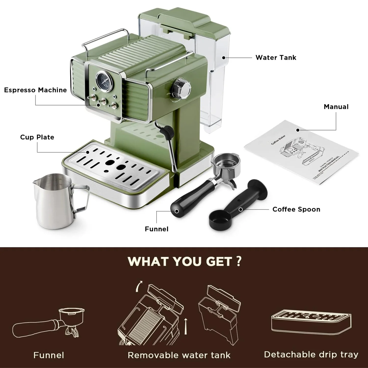 Espresso Coffee Machine 15 Bar with Milk Frother Steam Wand, 1350W Professional Coffee Maker, 54 oz Removable Water Tank Espresso Maker Cappuccino, Latte, Machiato, Green, for Home Barista