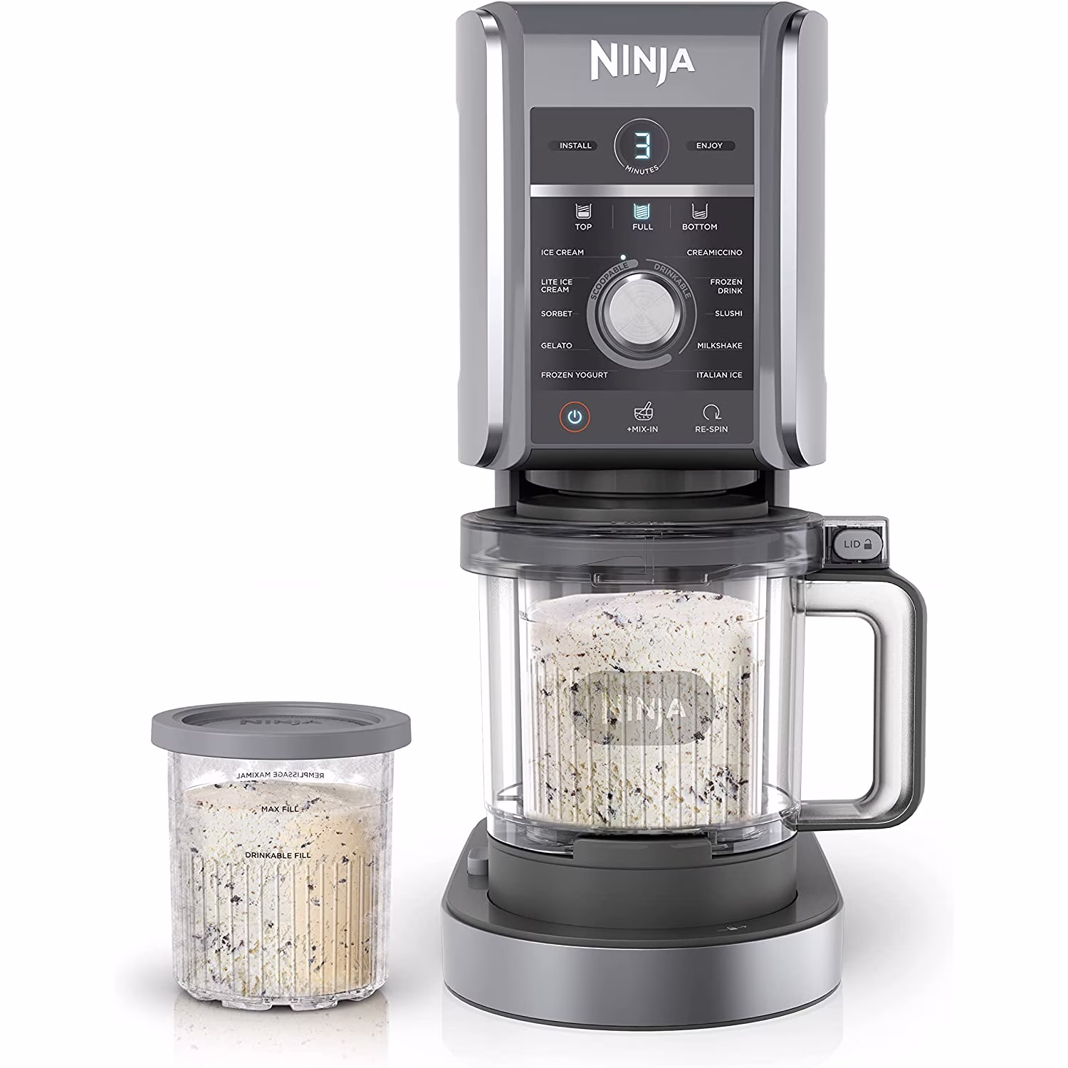 NJNC501RB Ninja CREAMi Deluxe 11-in-1 XL Ice Cream Maker, Silver (NC501) - RefurbishedDeluxe Creamerizer Paddle(2) 24 oz. CREAMi Deluxe Pints with Storage LidsOuter bowl and lid11 One- Touch ProgramsRecipe inspiration guide with 30 recipes With the Ninja? CREAMi? Deluxe, make classic CREAMi? treats like ice cream, sorbet, and gelato, and mix-in masterpieces. And now, make new CREAMi? treats like Italian Ice, Slushi, Creamiccino?, Frozen Yogurt, and Frozen Drinks right at home.Product Highlights:5 Exclusive Ninja CREAMi Deluxe Functions: Frozen drink, slushi, frozen yogurt, creamiccino, and Italian iceMake ice cream in 4 easy stepsIncludes two 24-oz. deluxe pints and lidsDishwasher safeProduct Features:NEW FUNCTIONALITYMake brand new CREAMi? scoopable and drinkable treats with the addition of the Slushi, Italian Ice, Frozen Drink, Creamiccino, and Frozen Yogurt functions.CAPACITYNew Larger CREAMi? Deluxe Pints hold 3 cups each �C 50% more capacity than the original CREAMi?. Make more treats for the whole family to enjoy!FLEXIBILITYWith two flavors, one base, you can turn every frozen base into two finished flavors with different mix-ins, one on top & one on the bottom. You can also process the top half to enjoy now and save the rest for laterCUSTOMIZATIONCreate completely customizable treats. With the Ninja? CREAMi? Deluxe, you can have total control of your ingredients for low sugar, keto, dairy-free, and vegan options.EASY TO USECreate a CREAMi? treat in three simple steps. Simply prepare your base, freeze overnight, process, and enjoy!ADVANCED CREAMIFY TECHNOLOGY?The Professional Creamerizer Paddle finely shaves and transforms ice particles into the creamiest treats like Slushies, Italian Ice, Frozen Drinks, Creamiccinos, and more.MIX-INSCustomize your flavor and texture by mixing in your favorite chocolate, nuts, candy, fruit, and more to personalize any CREAMi? treat.EASY TO CLEANContainers, lids and paddle are all top-rack dishwasher safe to make cleanup a breeze.RE-SPINChoose your preferred texture with the Re-spin function which makes your frozen treat even softer and creamier after the first round of processing.Product Specifications:Color: SilverCord length (in.): 31.5 inDishwasher-safe parts: YesProduct dimensions (in.): 12.01 in L x 8.42 in W x 16.69 in HProduct weight (lbs.): 14.44 lbsWattage: 800Ninja CREAMi Deluxe 11-in-1 XL Ice Cream Maker, Silver (NC501) - Refurbished