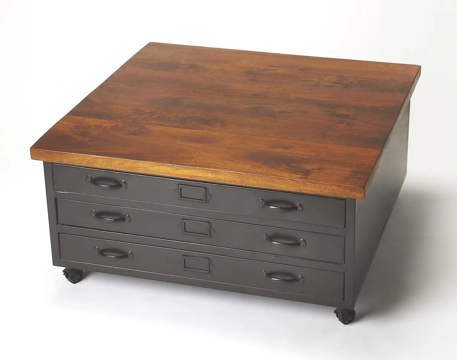 Featuring a artists drawing drawers and charming 2-tone finish, this cocktail table adds a distinctive touch to your den or living room seating group. This piece showcases a robust Wooden table top and shelf, supported by a sleek metal frame with casters. Three drawers offer discreet storage.