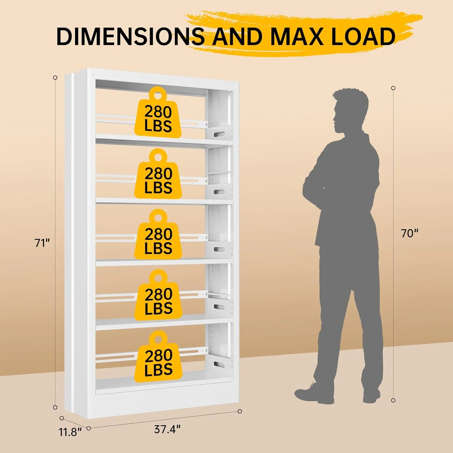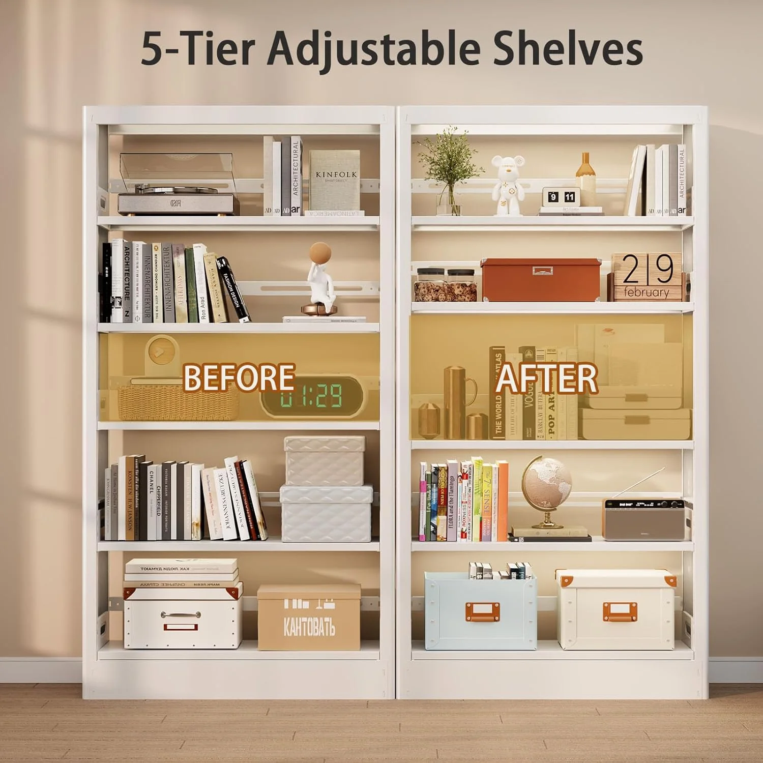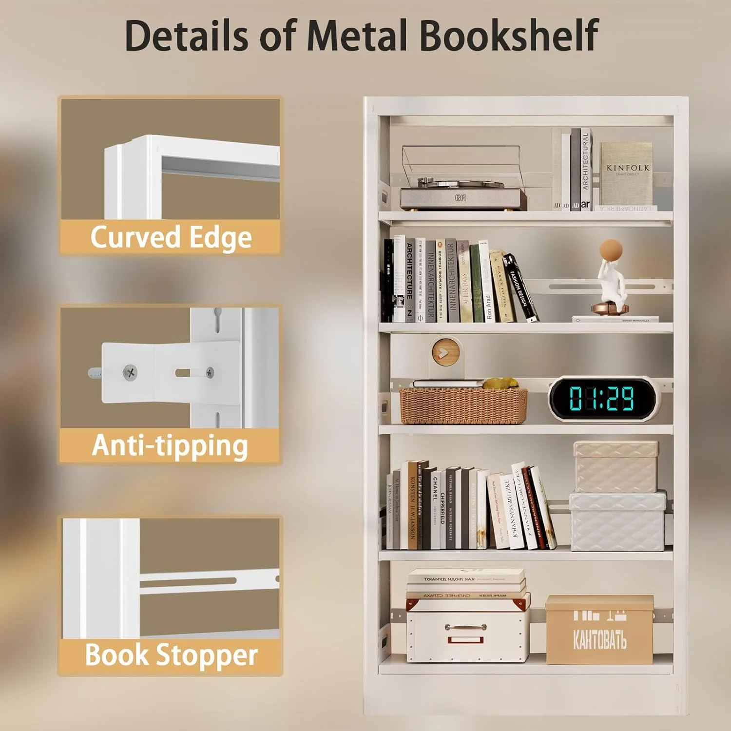 5 Tier White Metal Bookshelf, 71" H Bookcase with Adjustable Shelves, Heavy Duty Storage Bookshelves Tall Bookcase for Library, Office, Bedroom, Living Room, Classroom, Including Book Stopper(White)