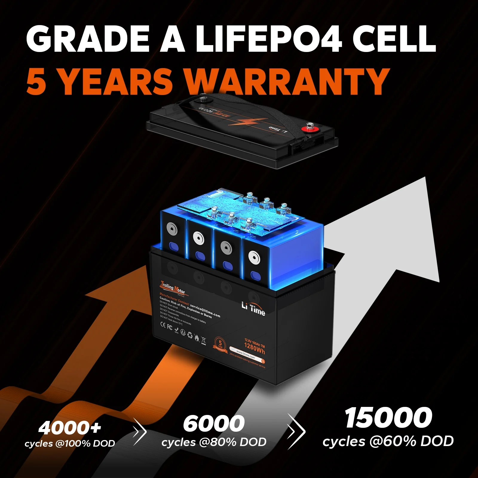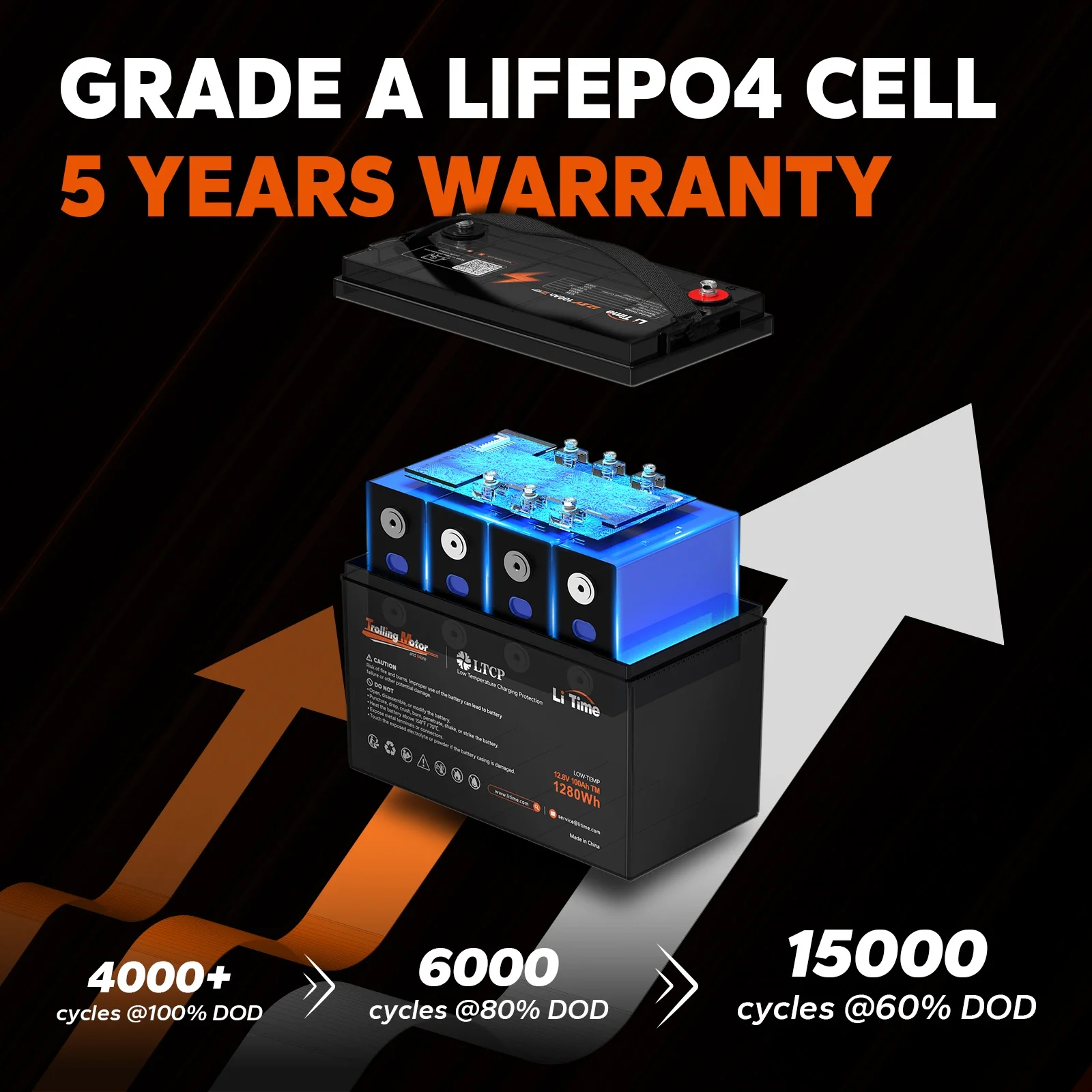 - 【Grade A LiFePO4 Cell & 10 Years Lifetime】LiTime's 12V 100Ah TM lithium battery uses Grade A LiFePO4 cells for exceptional quality, higher energy density, and greater power, certified by UL testing for highest level of safety. The 12V 100Ah TM LiFePO4 battery has an impressive 10-year lifespan, with 4000+ cycles @100% DOD (6000 cycles @80% DOD, 15000 cycles @60% DOD). In contrast, SLA/AGM batteries typically only last for 3 years with 200-500 cycles.