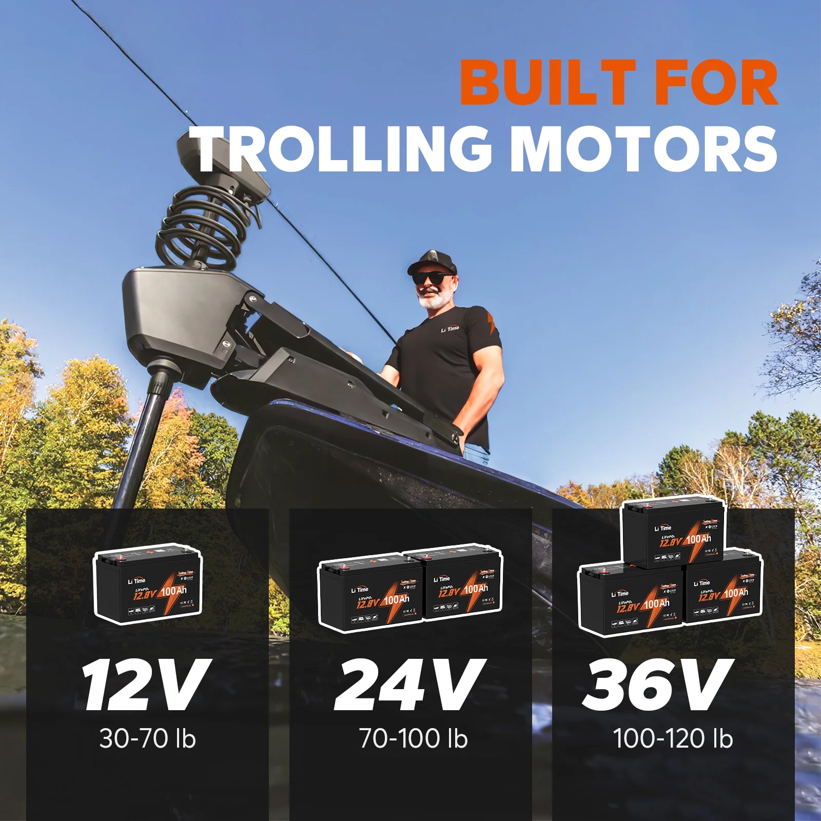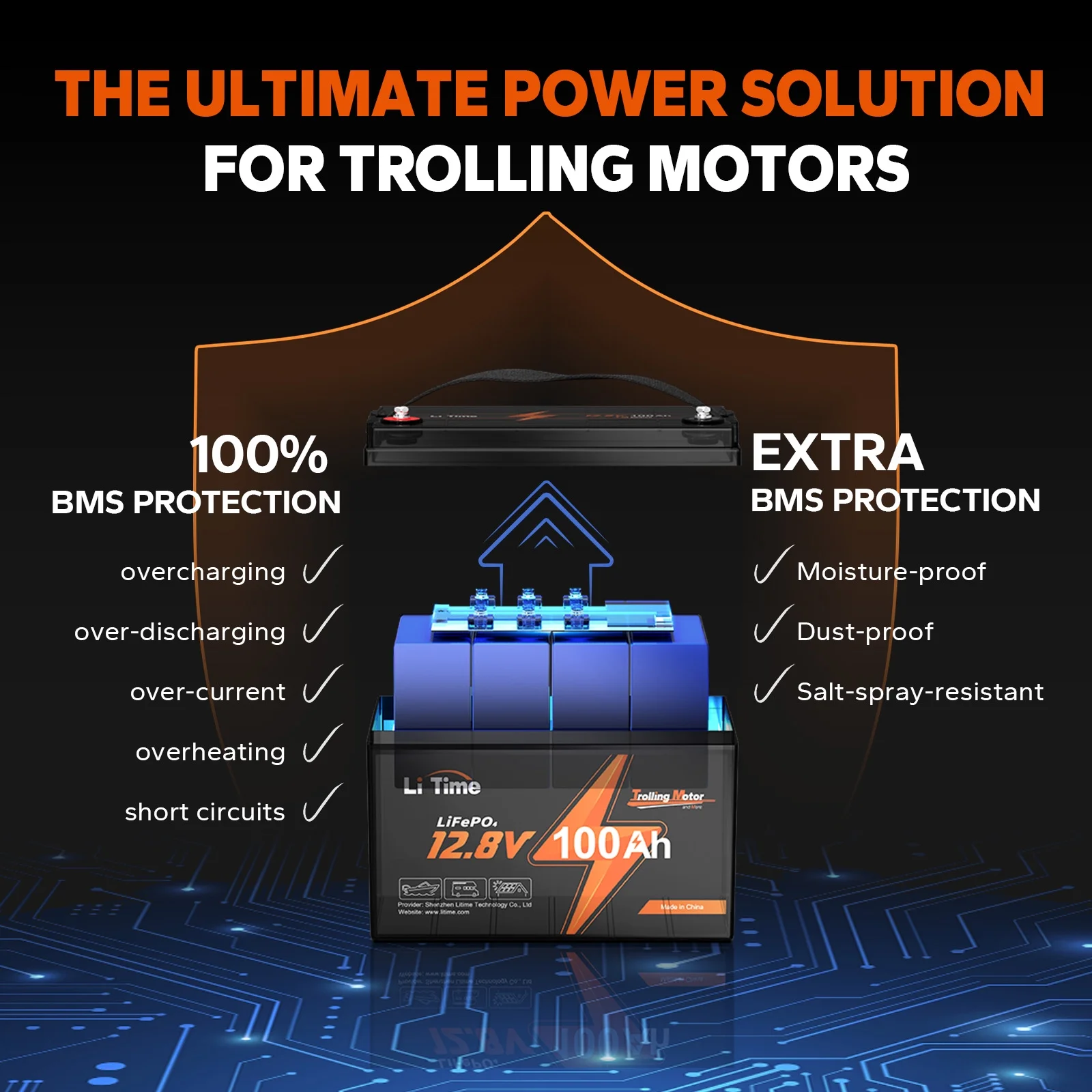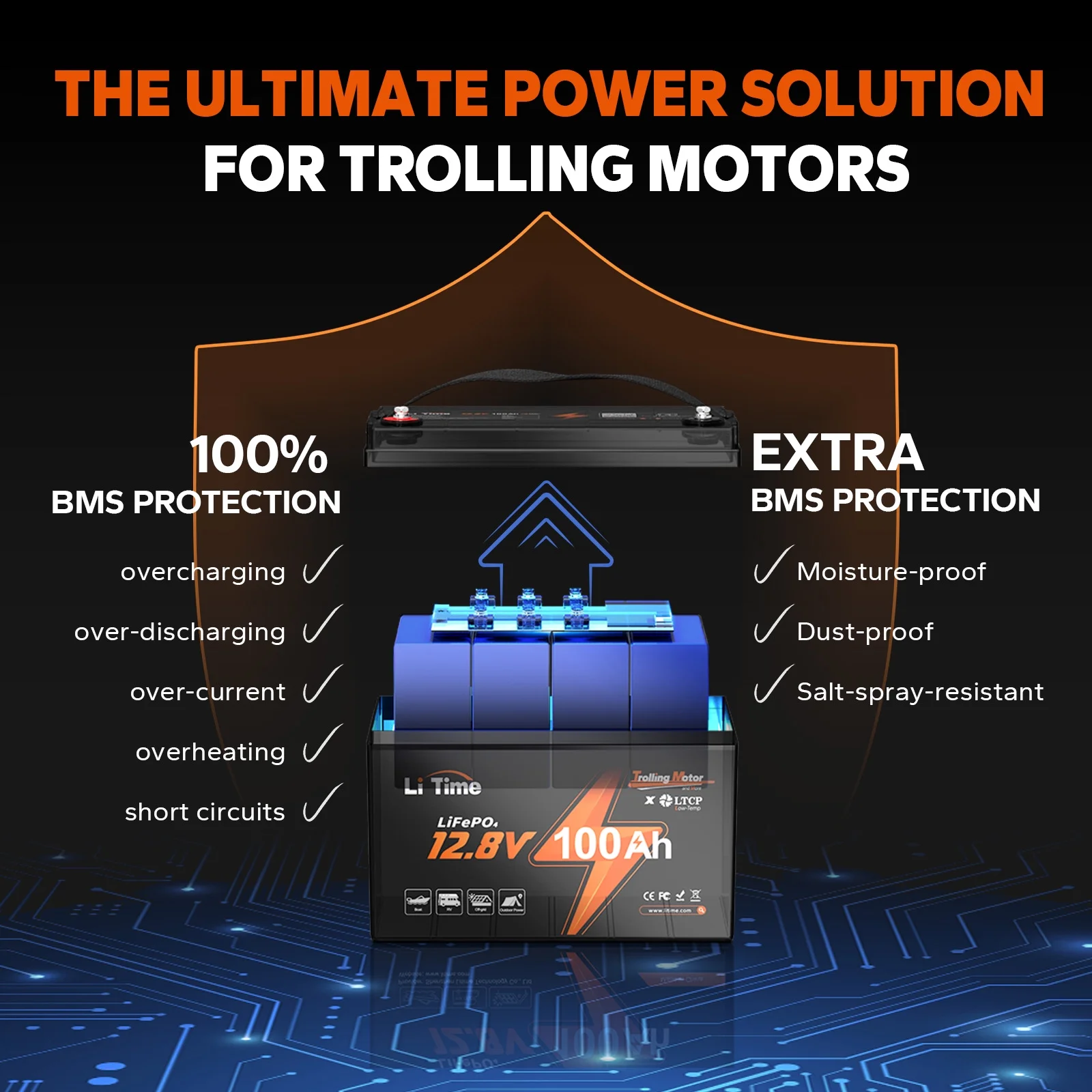 - 【Extra Triple Protection BMS for Trolling Motors】LiTime's 12V 100Ah TM LiFePO4 battery is optimized for trolling motor users with its BMS featuring triple protection against dust, water, and salt spray, as well as 100% full protection against overcharging, over-discharging, over-current, overheating, and short circuits. Designed for harsh environments such as rainy or coastal areas, or dusty and wet conditions, this battery offers worry-free and long-lasting performance with an extended lifespan