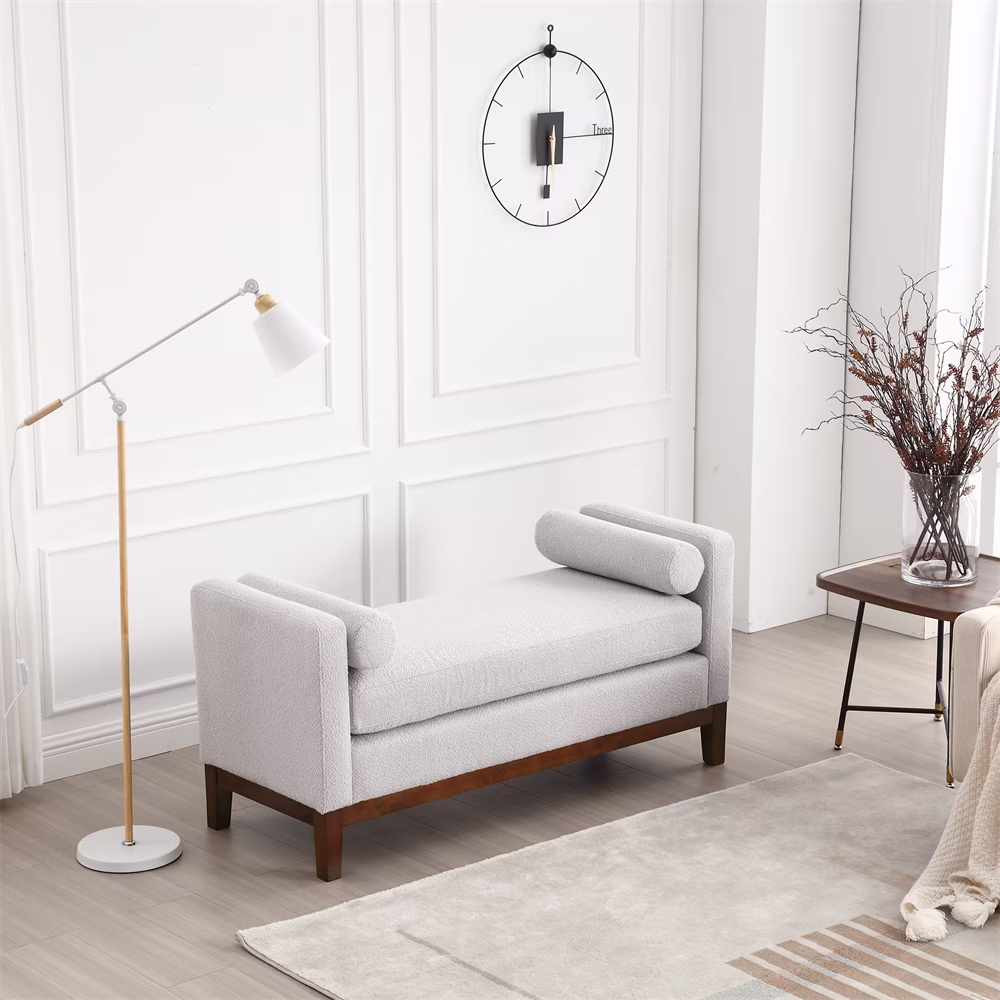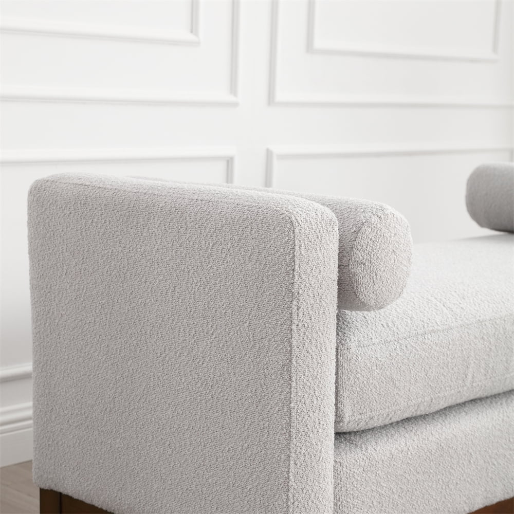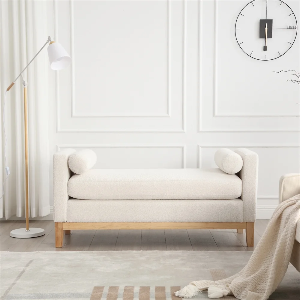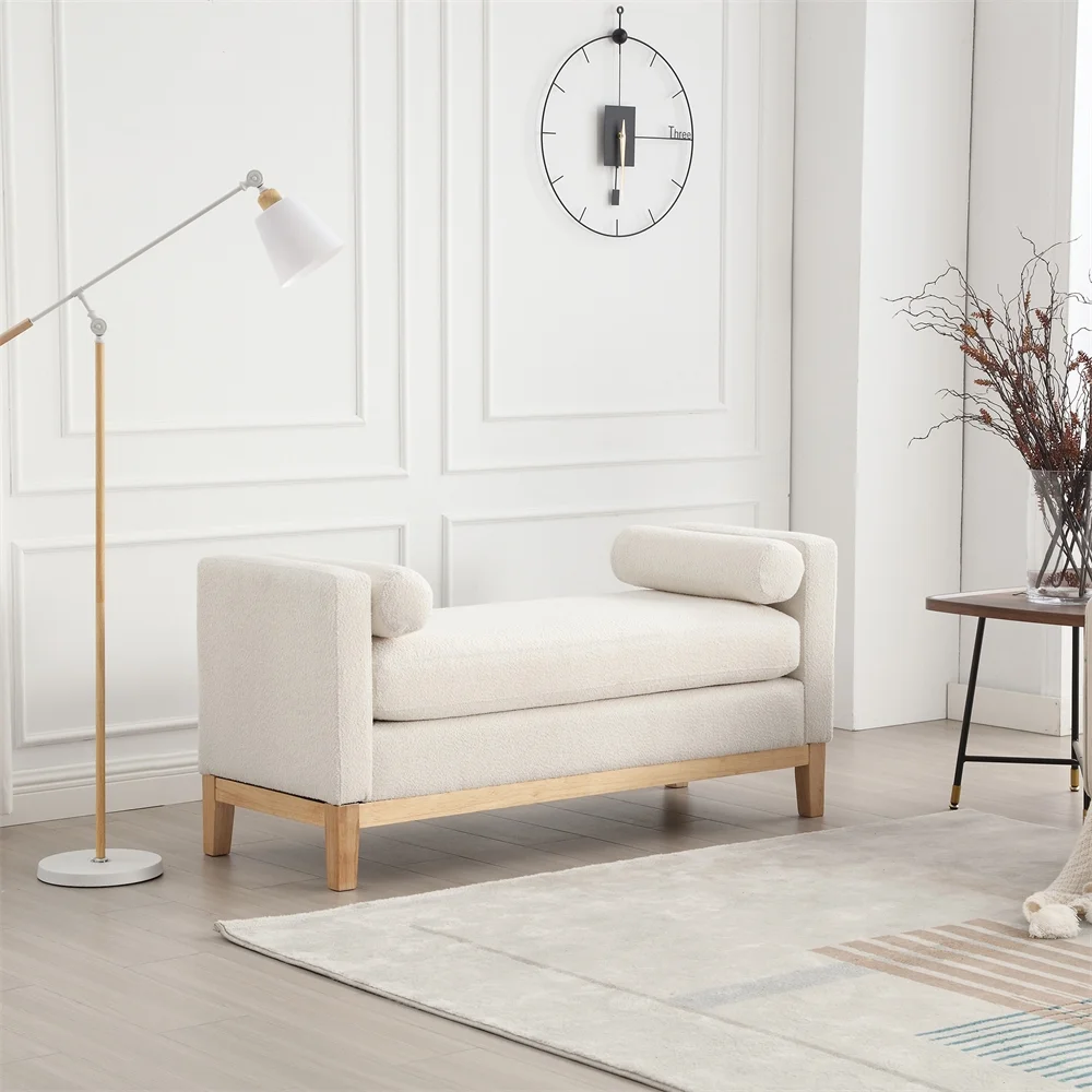- 53.5"W Elegant Upholstered Bench, Ottoman with Wood Legs & Bolster Pillows for End of Bed, Bedroom, Living Room, Entryway, Ivory