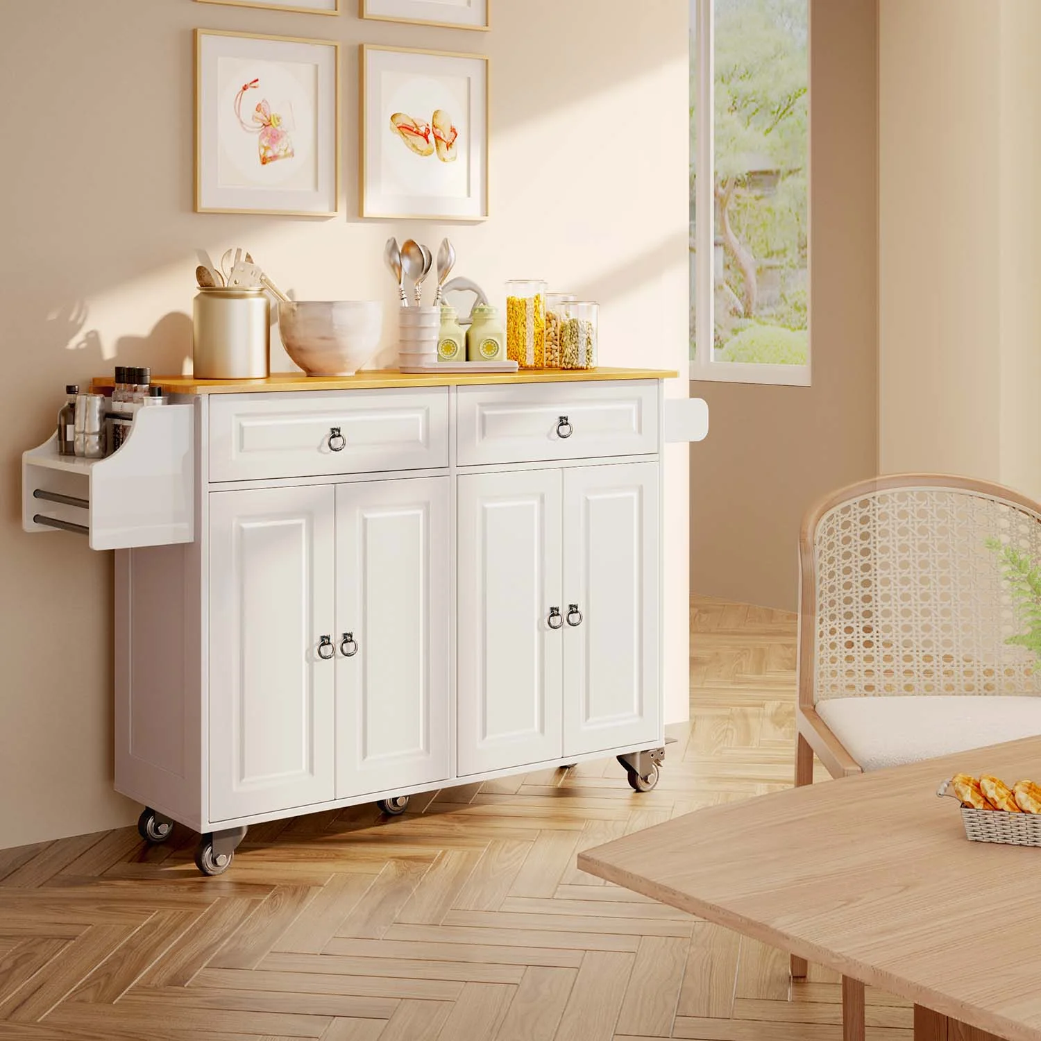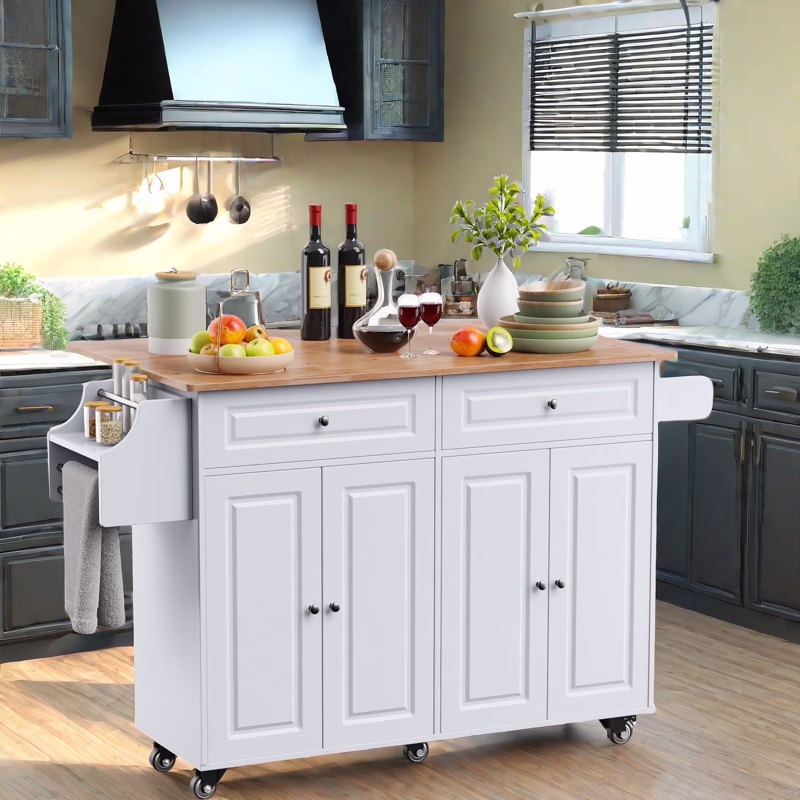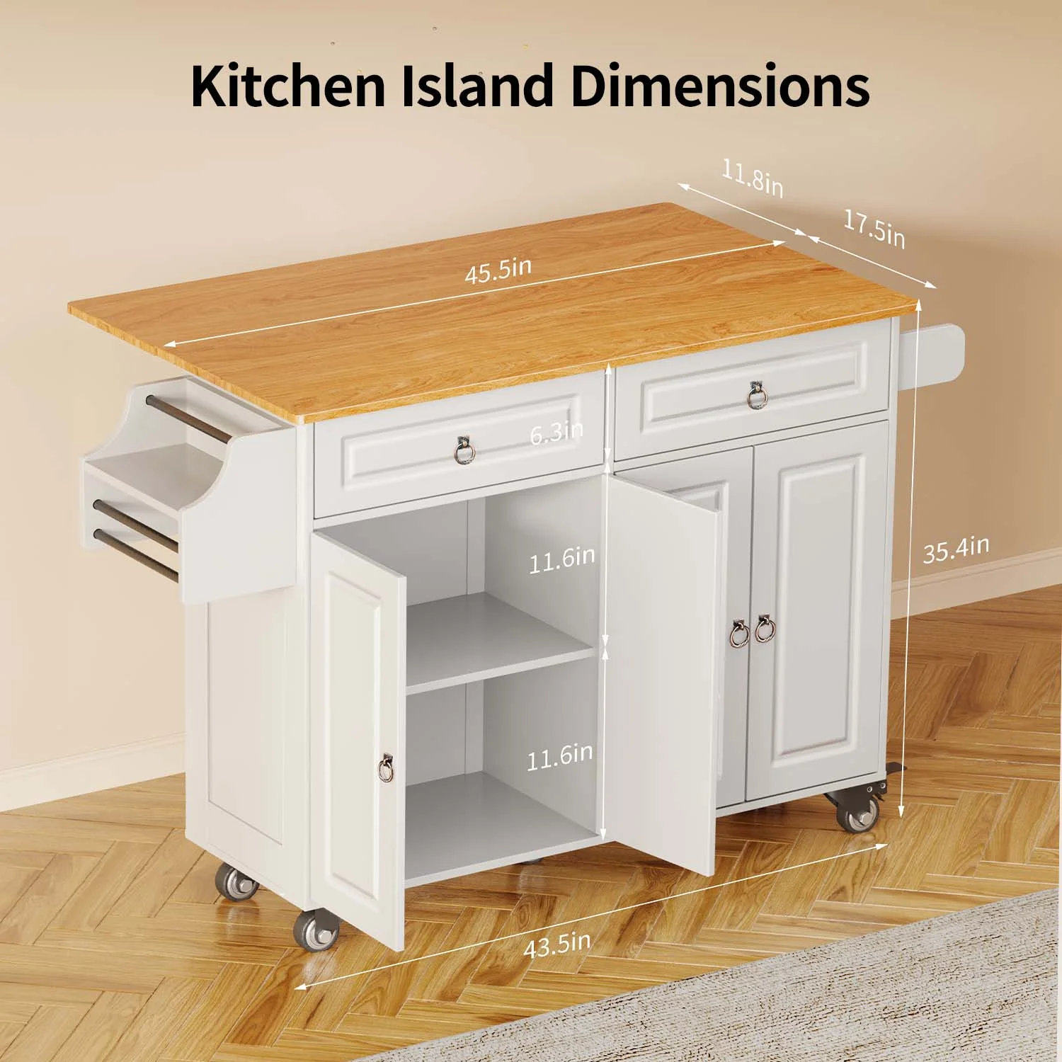 ??Solid & Sturdy Kitchen Cart - Premium MDF material and rubber wood tabletop add a durable and eco-friendly advantage to this island table for kitchen to last for long years with longer lifespan. Special paint surface also makes it sturdier to firmly hold the items with a high capacity of 150 lbs for the main top.