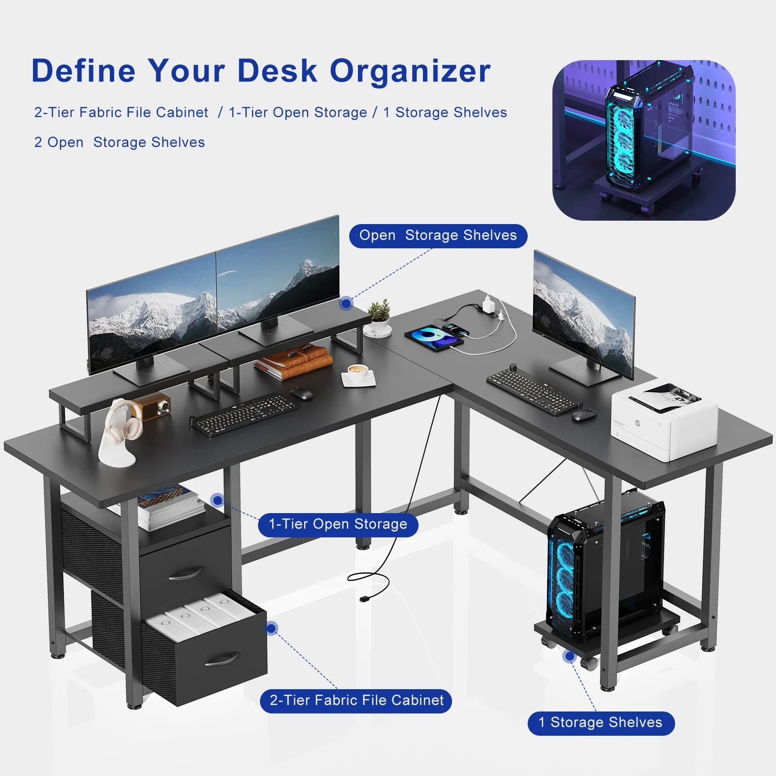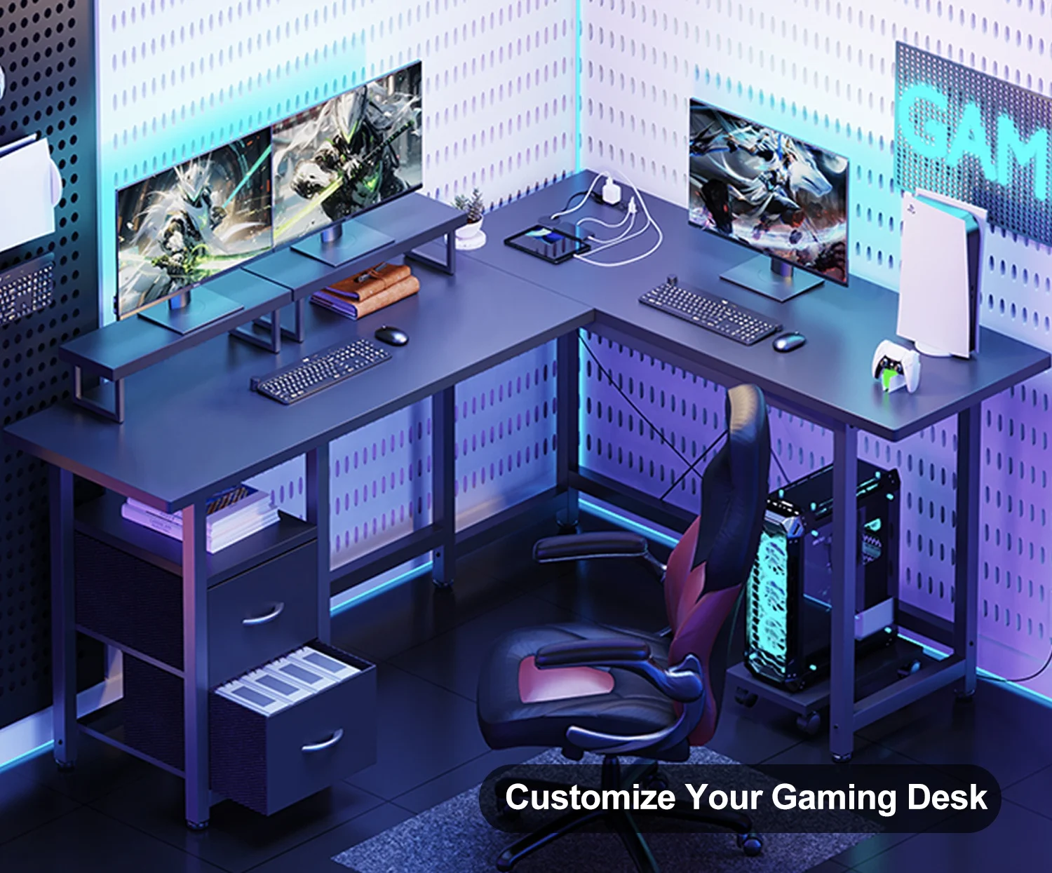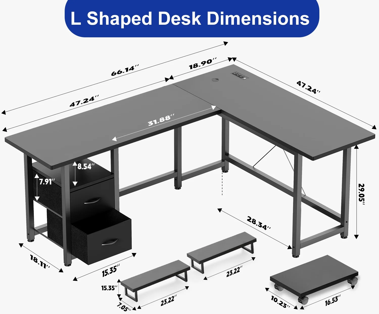 Introducing our versatile L-shaped desk, designed for optimal productivity and style! With 66 inches of spacious workspace, it effortlessly accommodates dual monitor setups��ideal for multitasking, gaming, or graphic design. The ergonomic dual monitor stands elevate your screens to eye level, promoting good posture and easing neck and back strain.
