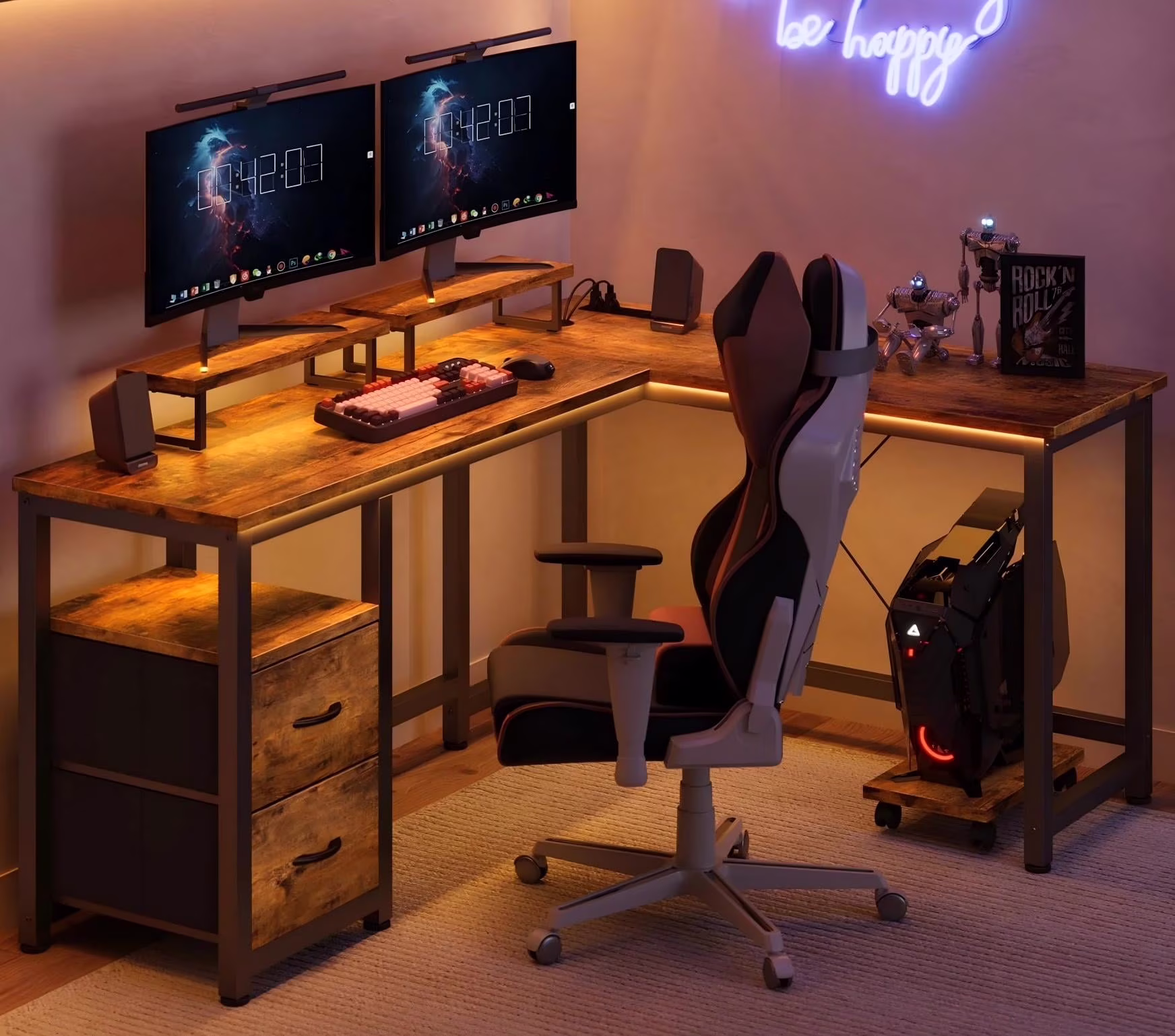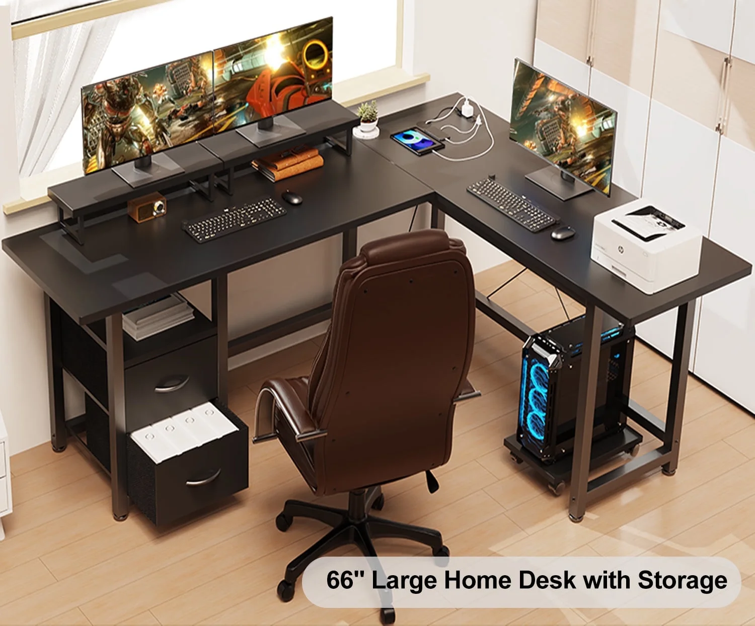 Lofka 66" L-Shaped Gaming Desk with Monitor Stands, Drawers & Power Outlet