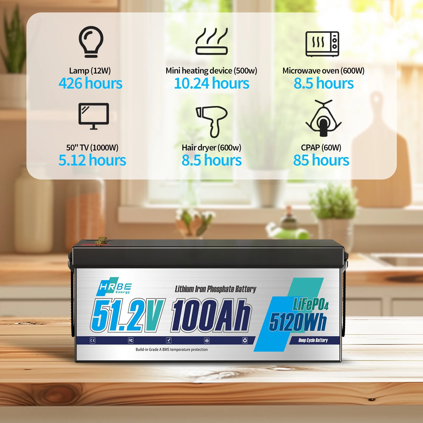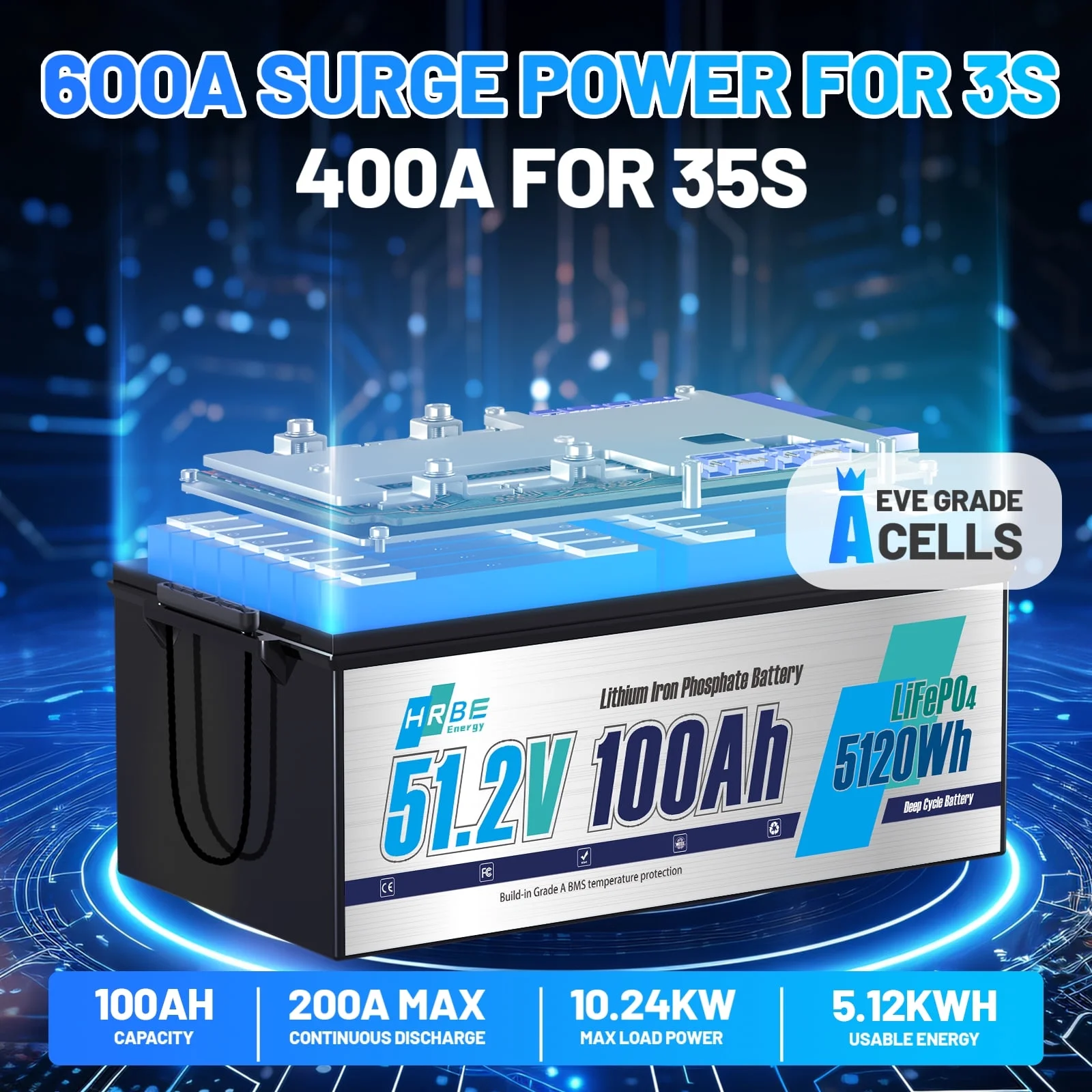 - This 51.2v 100ah LiFePO4 battery has built-in 200A BMS (Battery Management System) to protect it from overcharge, over-discharge, over-current, and short circuit with excellent self-discharge rate.