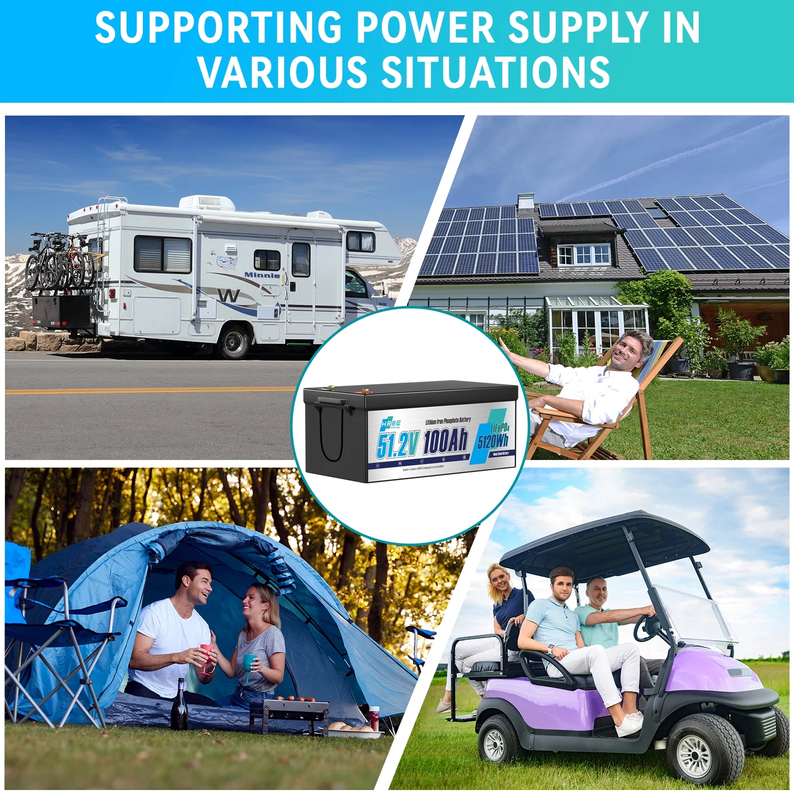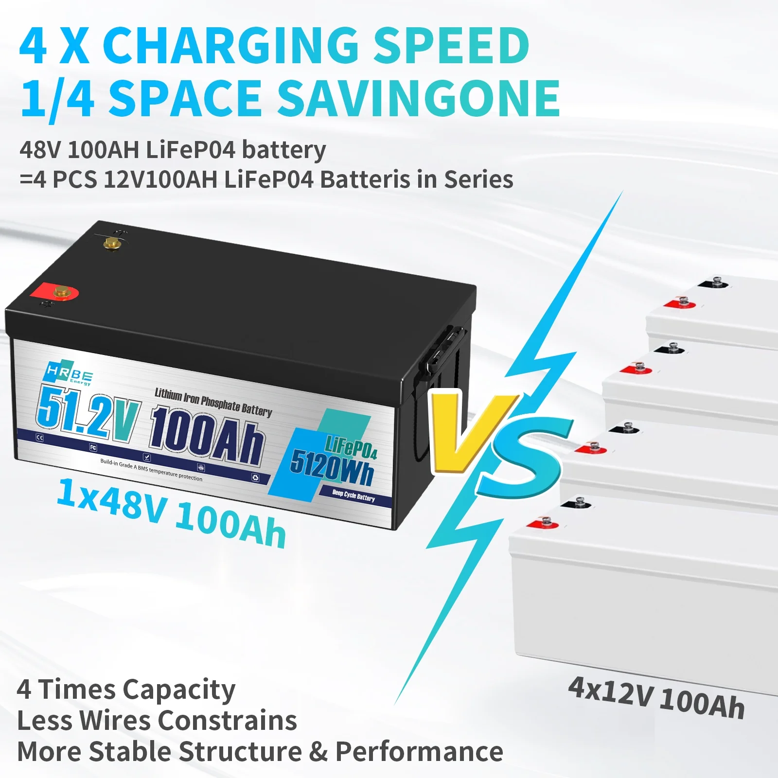- HRBEENERGY 48V 100AH deep cycle battery is designed for 48v golf cart, RV, Boat,trolling motor, marine and off grid applications. This 48V lithium battery can be DIY in parallel to fit the 36V 100A, 200A, 300A, 400A application scenarios.