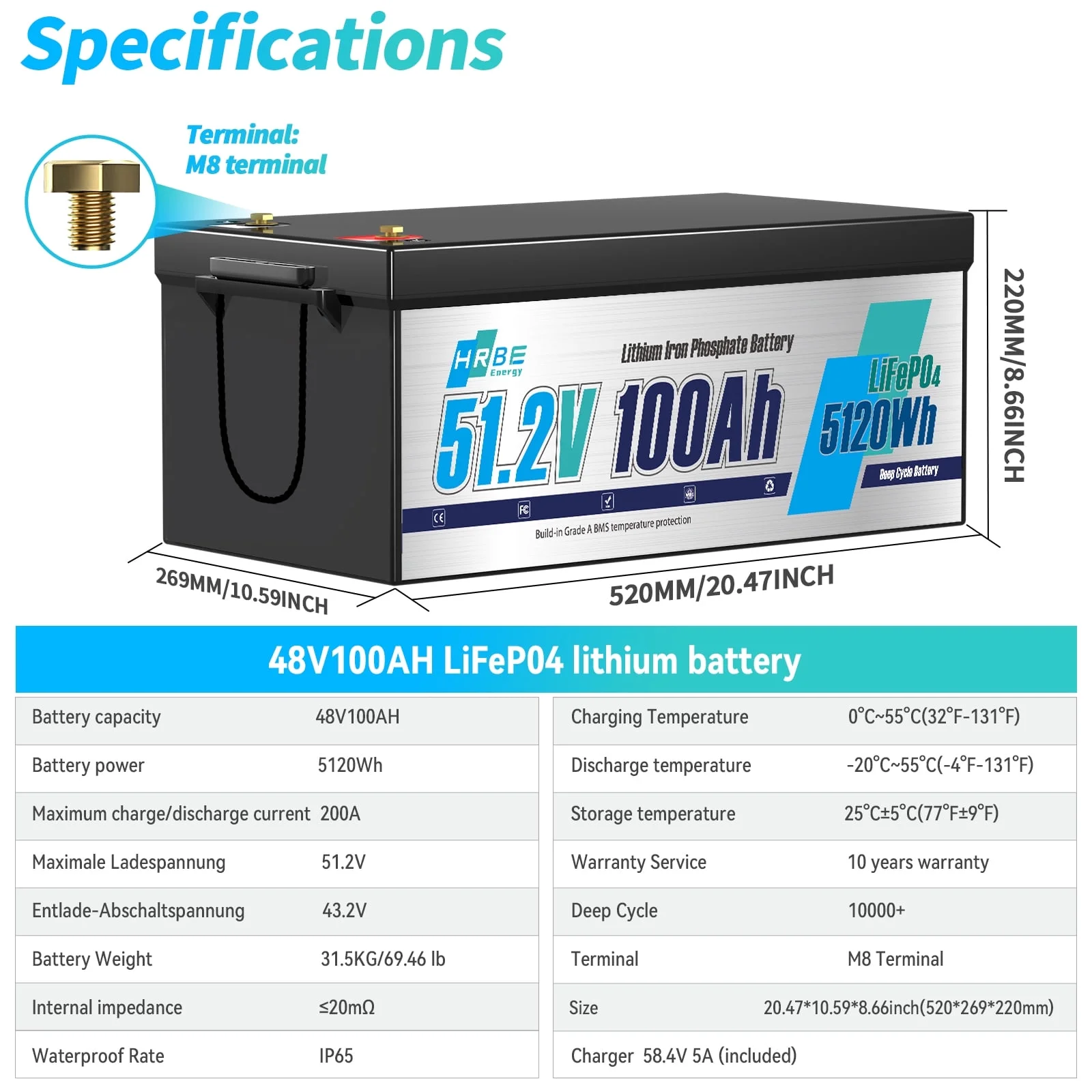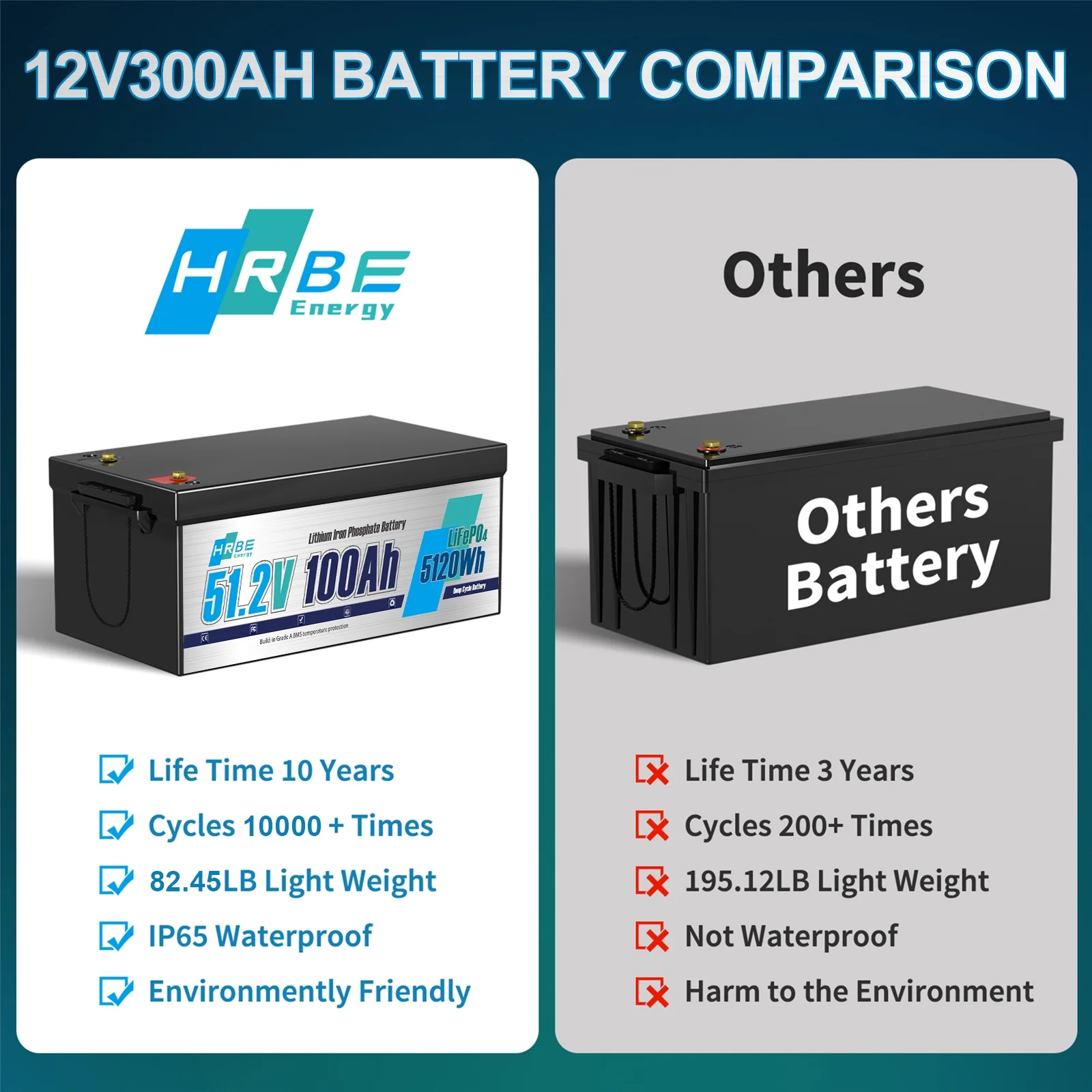 - HRBEENERGY 48V 100Ah golf cartS lifepo4 battery does not require intermediate replacement and regular maintenance,no need in series, has more than 5000 cycles and a 10-year lifespan.