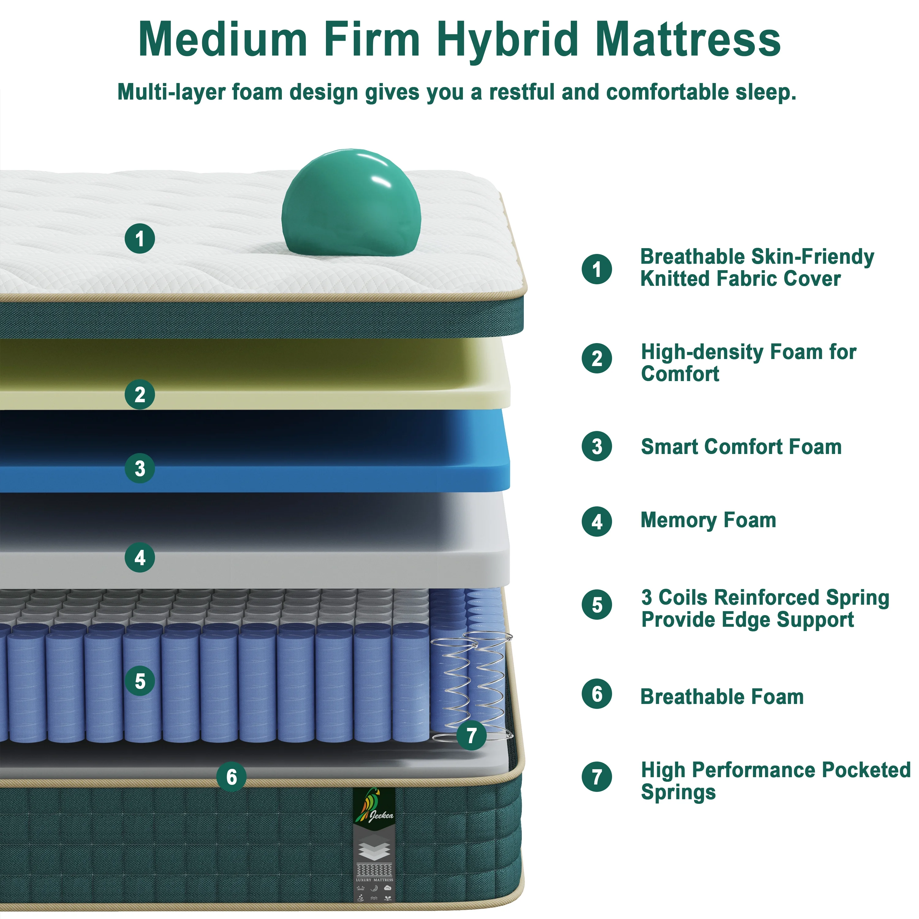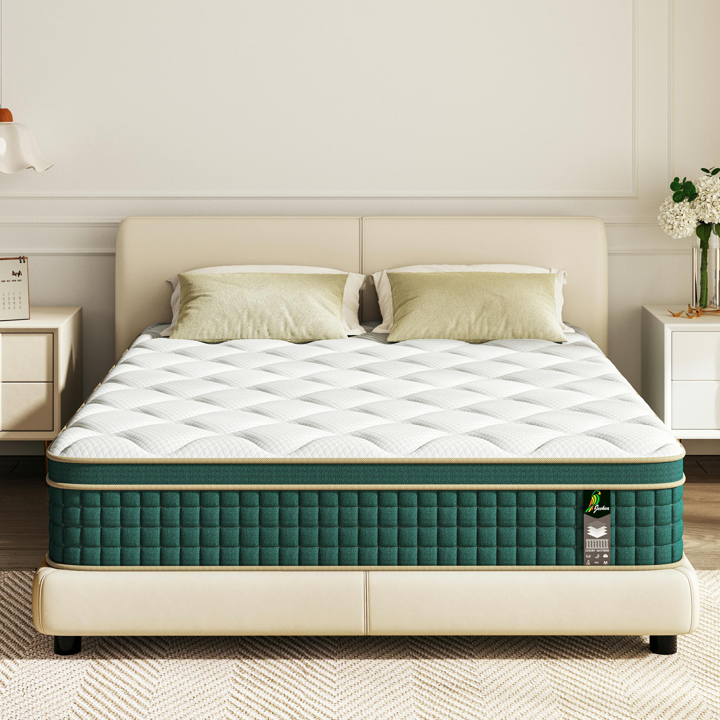 - ��Ergonomic Design & Pain Relief�� The JEEKEA full mattress is designed with seven regions for all sleeping positions, effectively easing points of pressure from the head, upper body, torso, hips and legs. The pressure-relieving foam layer and high-performance pocket innerspring system work together to keep your spine in the comfortable position and eliminating back pain.