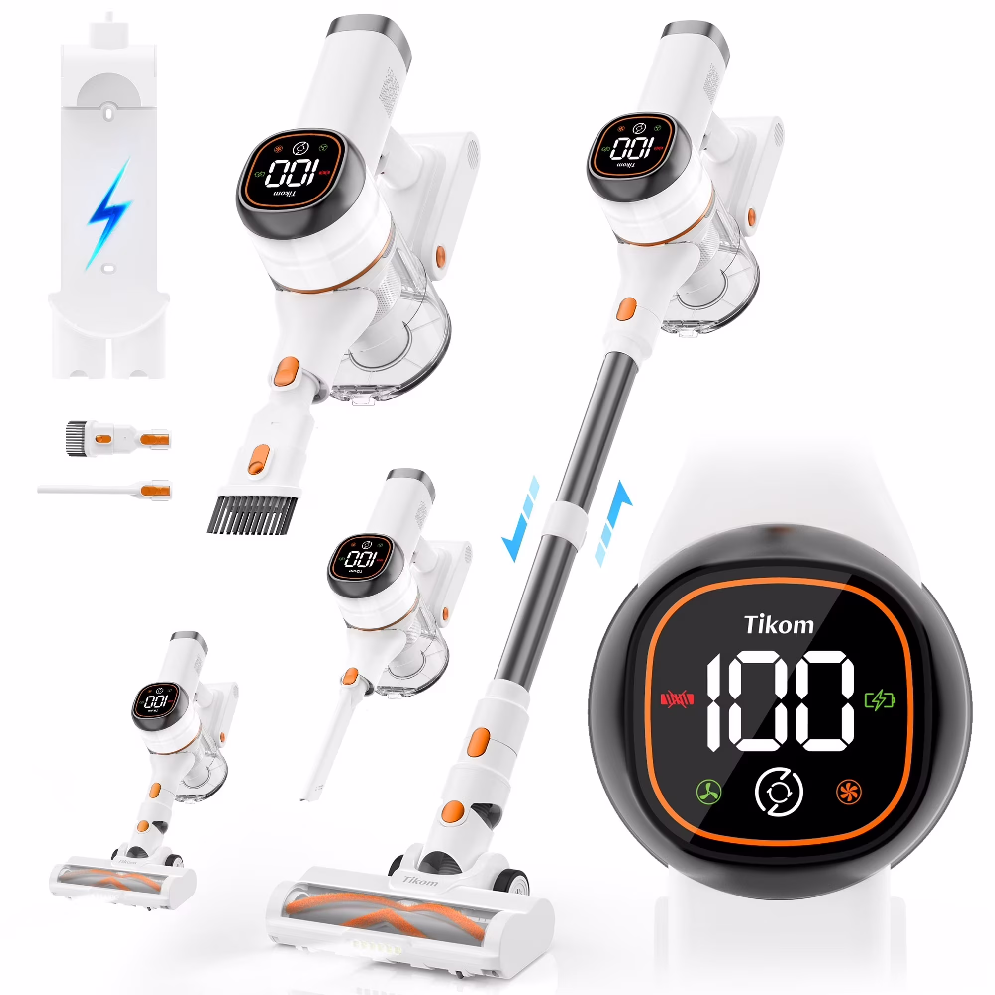 - [450W/40Kpa Powerful Suction]: Tikom V500 Cordless Stick Vacuum Cleaner is equipped with a high performance 450W motor, providing a up to 40Kpa Powerful Suction for deep thorough cleaning. The lightweight vacuum cleaner can easily pick up pet hair, dog food crumbs, cat litter, debris, etc