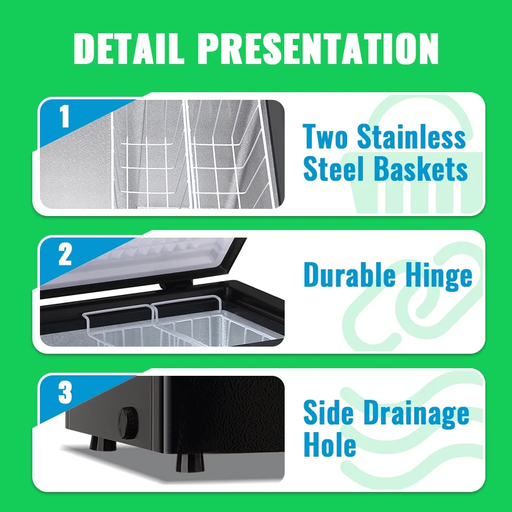 Note: After receiving the freezer, please upright it for 24 hours, because the refrigerant inside the compressor needs time to settle. If the machine is plugged in immediately, it may cause cooling problems.