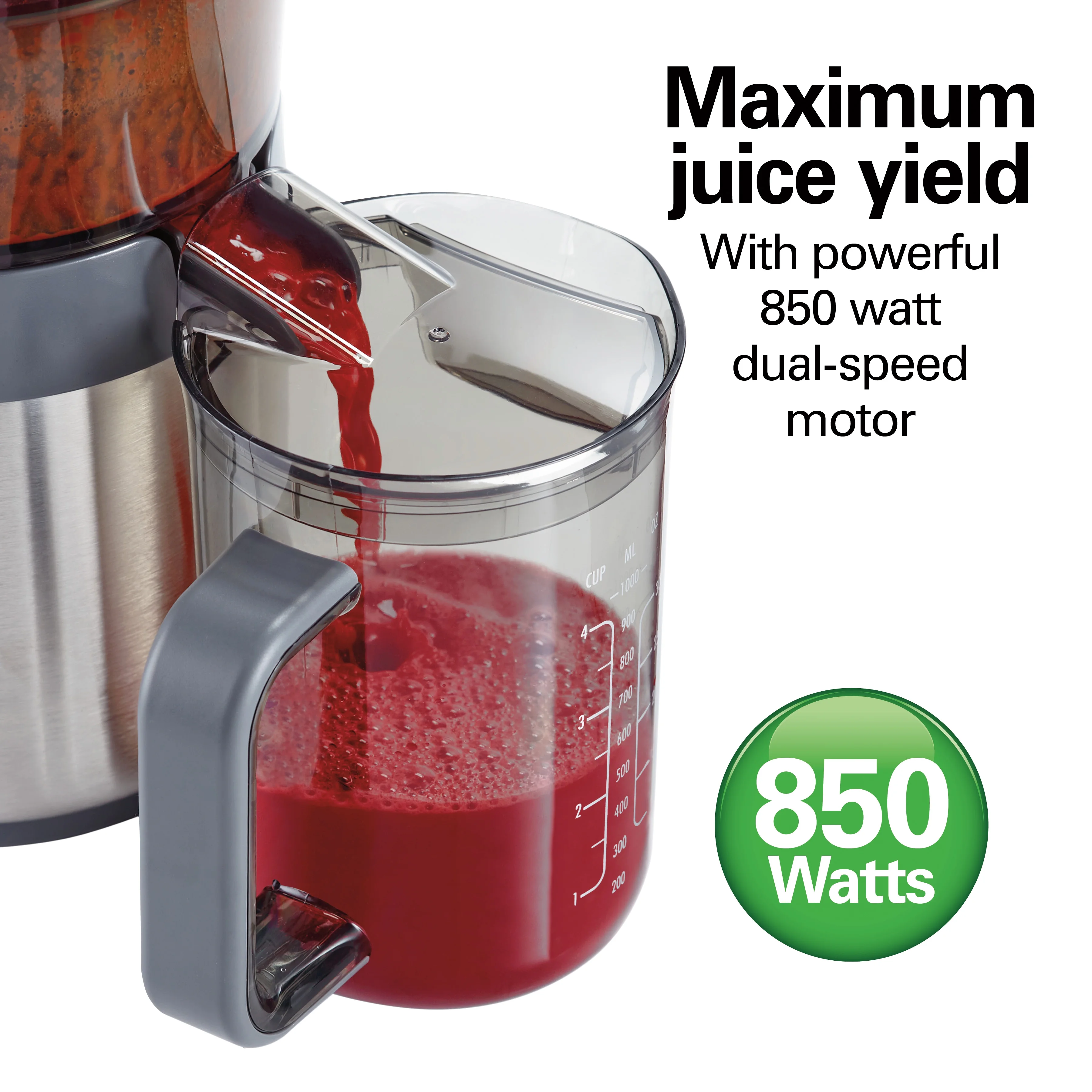 - ? Make fresh, healthy juice in seconds. Save time and effort �� extra-large 3-inch Big Mouth chute fits whole foods to reduce prep time ? Less mess and easy clean-up. Maximum juice yield with powerful 850-watt motor and dual speed motor