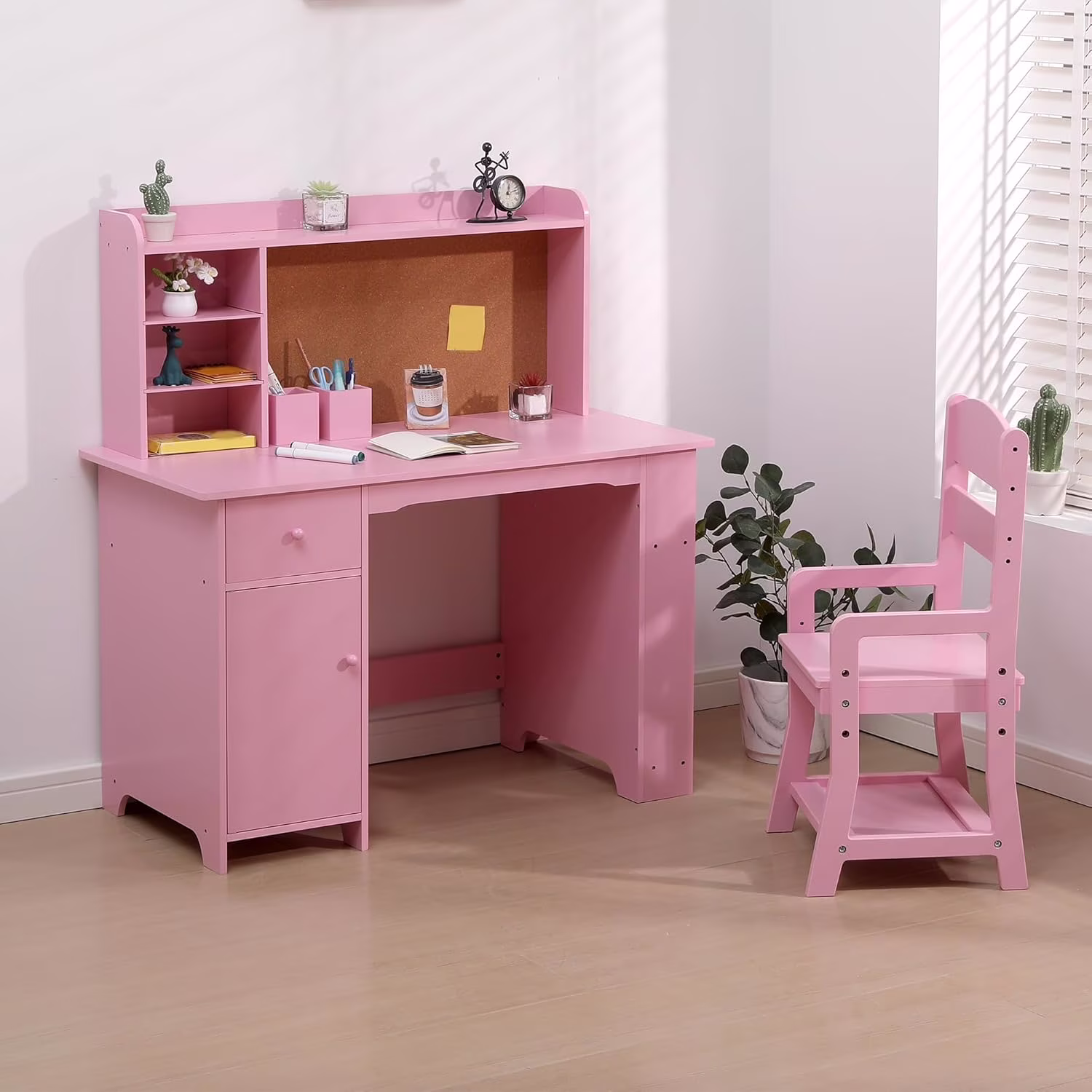 - Ample Storage Capacity: Our desk set features generous storage options, including open storage, a bookshelf, cabinets, and a cork board. Easily organize and store personal items like photo frames, alarm clocks, mini plants, dolls, and books.