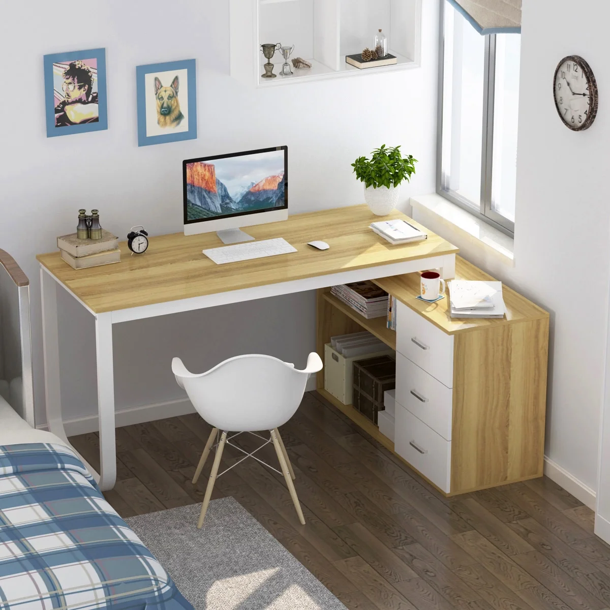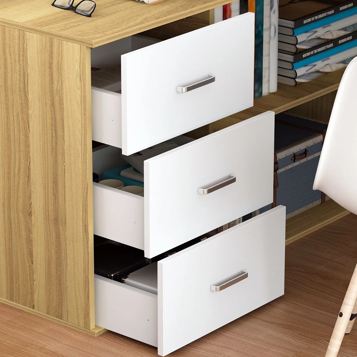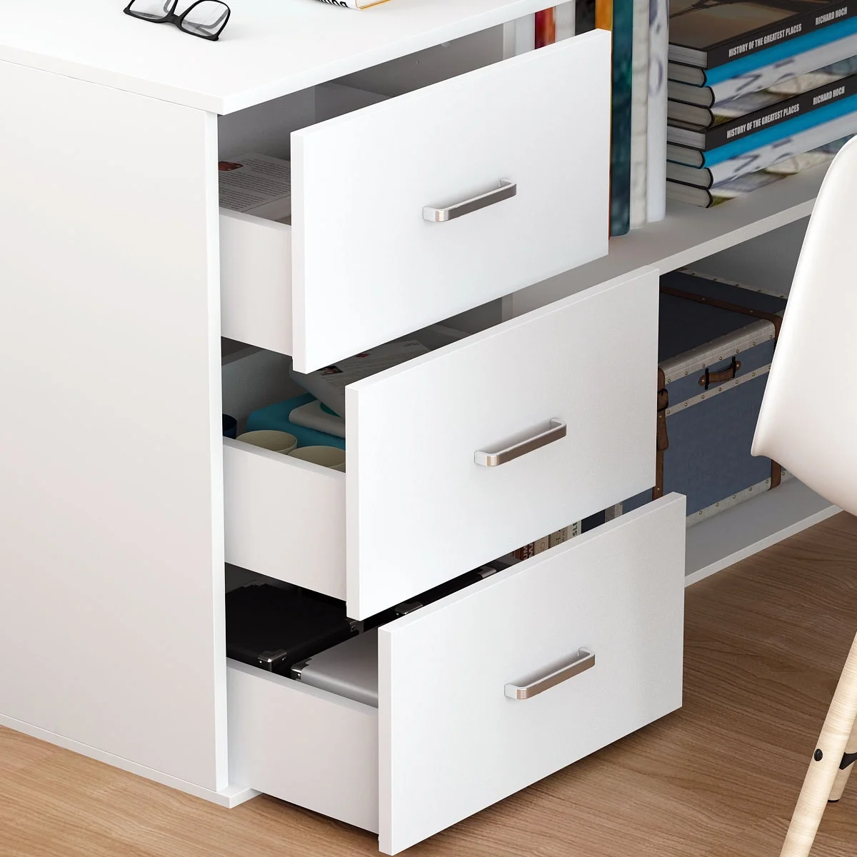 This L-shaped corner desk is sure to be the perfect addition to your contemporary home office. It's three convenient side drawers provide ample space to store office supplies, papers, files folders, and plenty more. Use the spacious top for your computer desktop, laptop or tablet, while the two open shelves and cabinet help keep documents organized and desktop clutter-free.