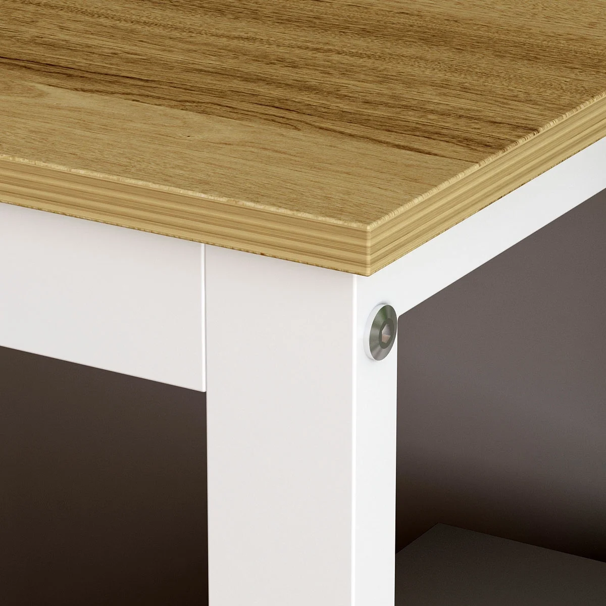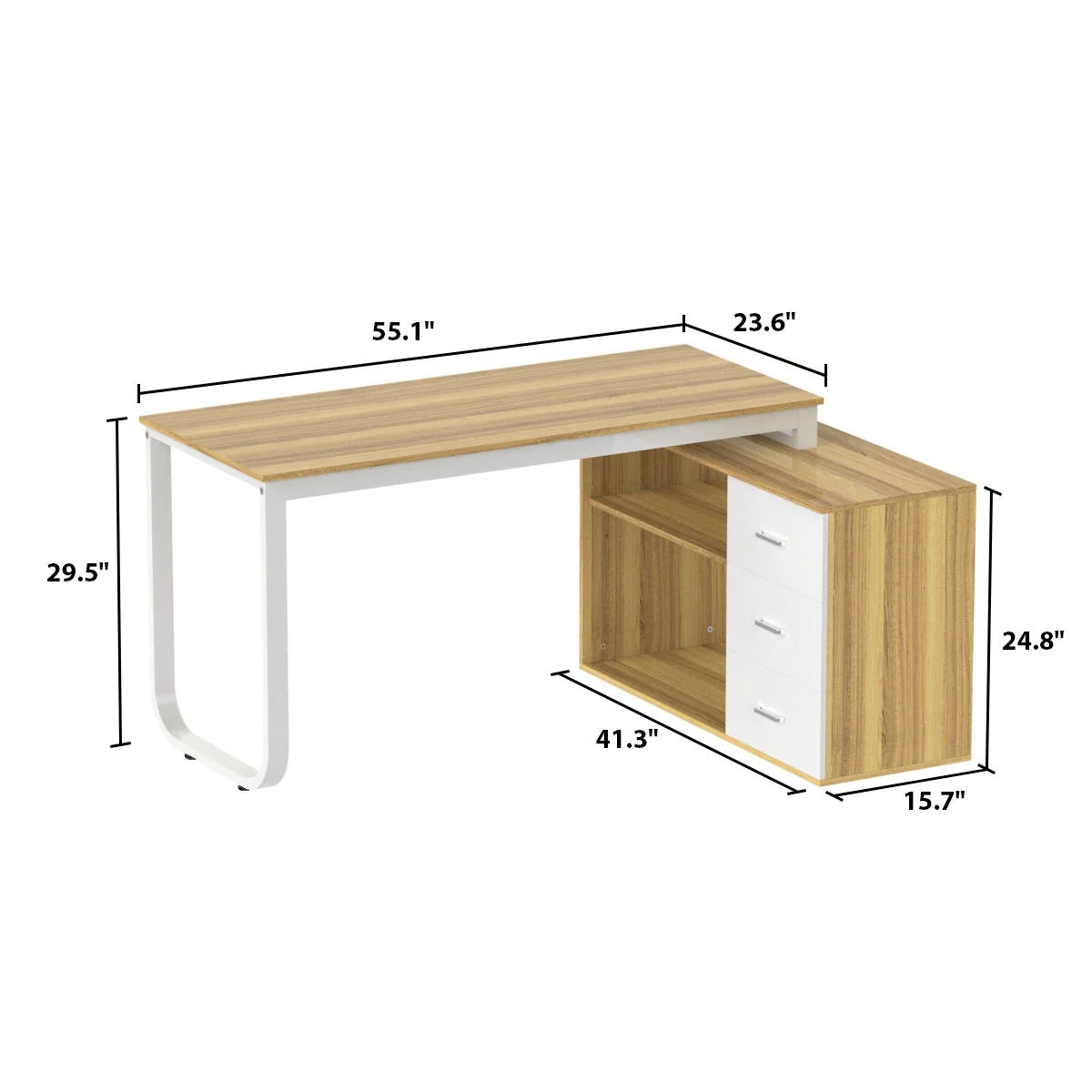 - The supporting structure of the steel frame makes the table more stable and strong. The left/right side of the desk has a cabinet and three drawers for storage.