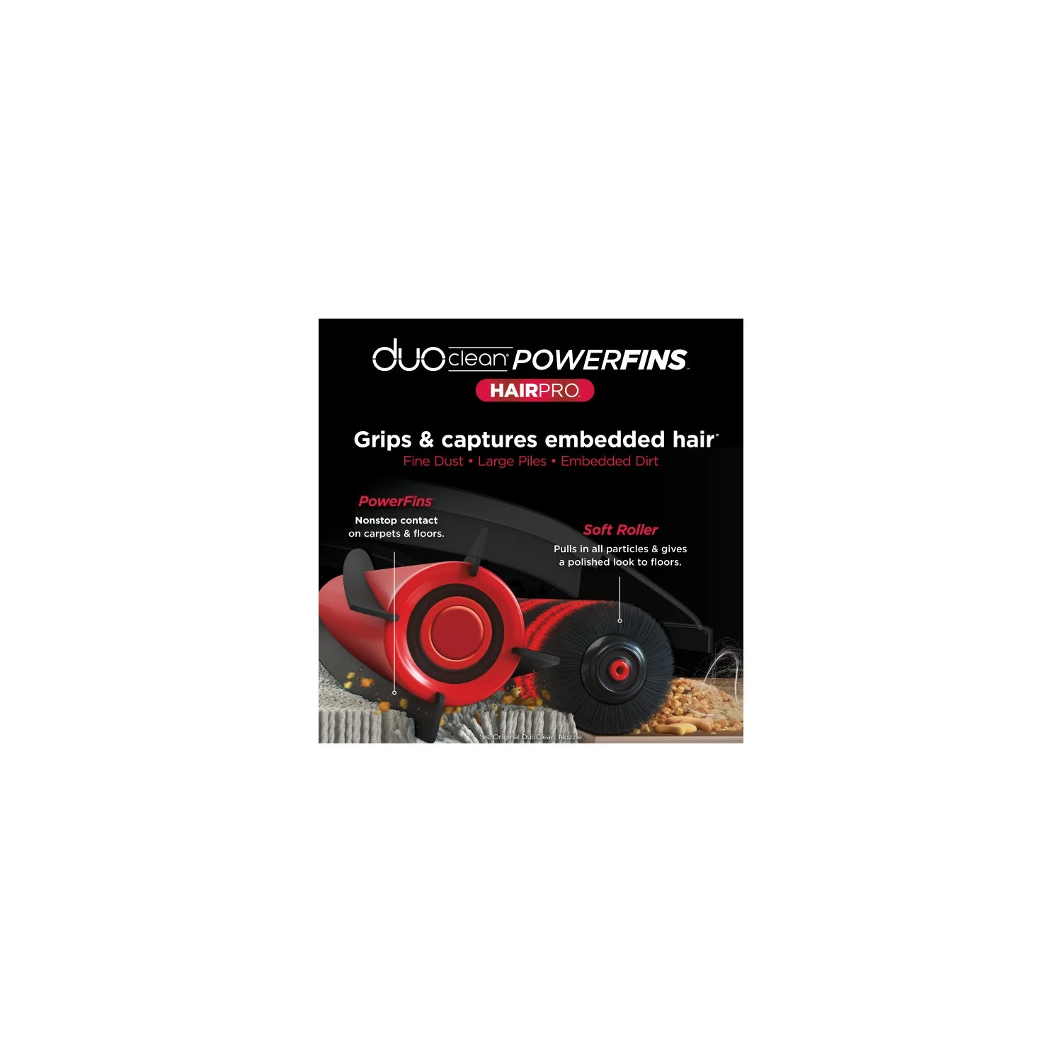 - DUOCLEAN POWERFINS HAIRPRO: A two brushroll system digs deep into carpets, directly engages hard floors, and picks up dirt, debris, and hair in every pass.