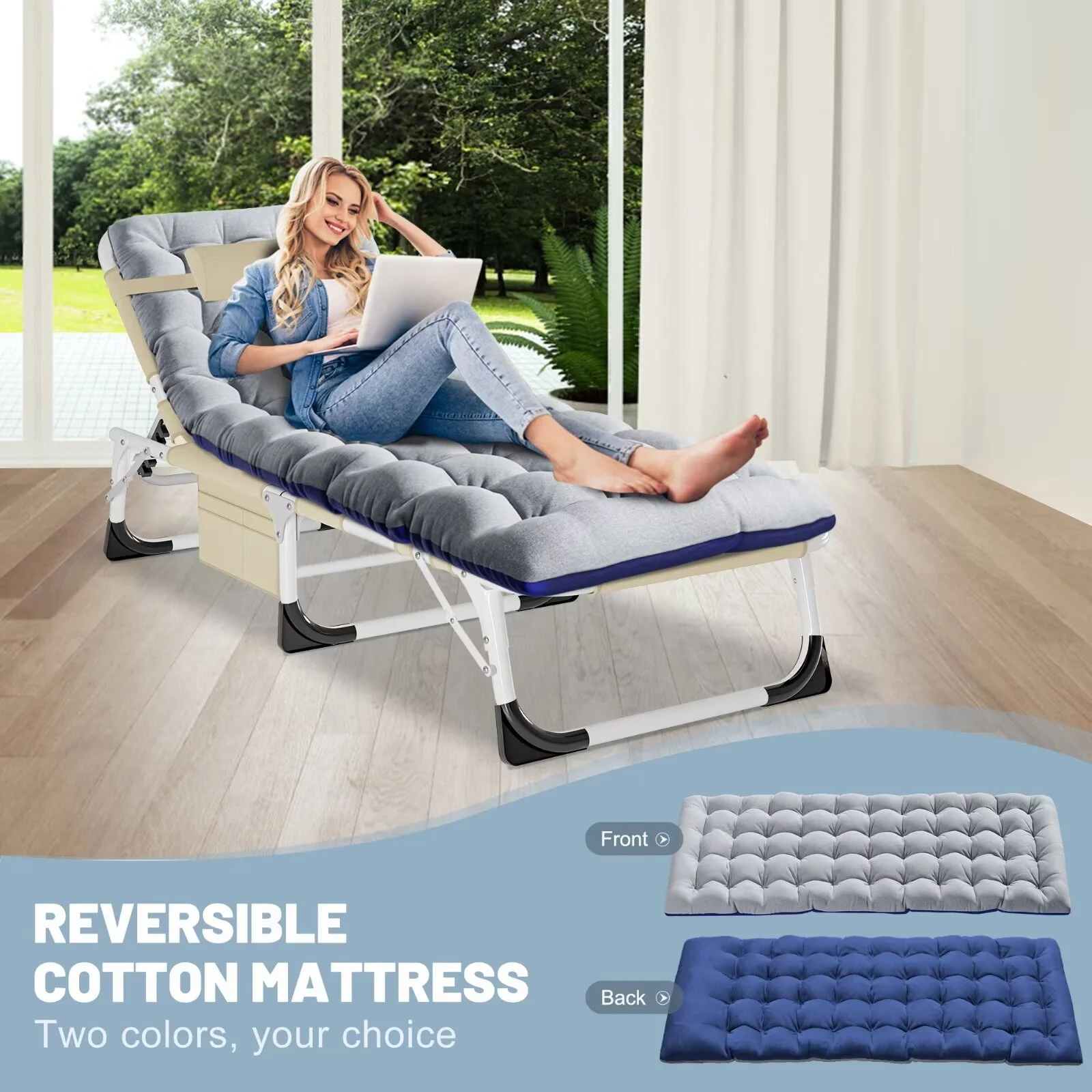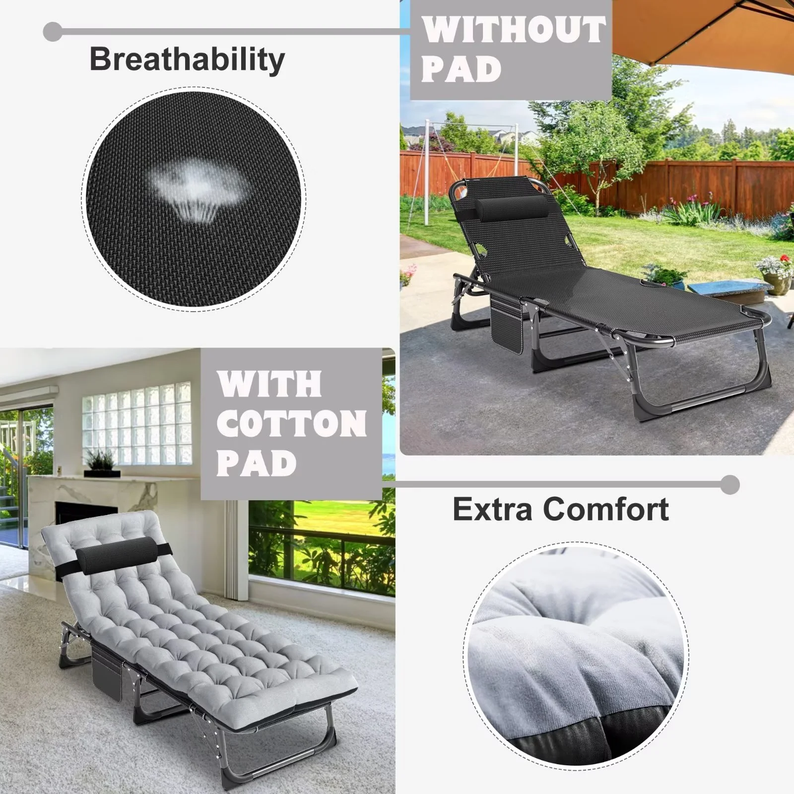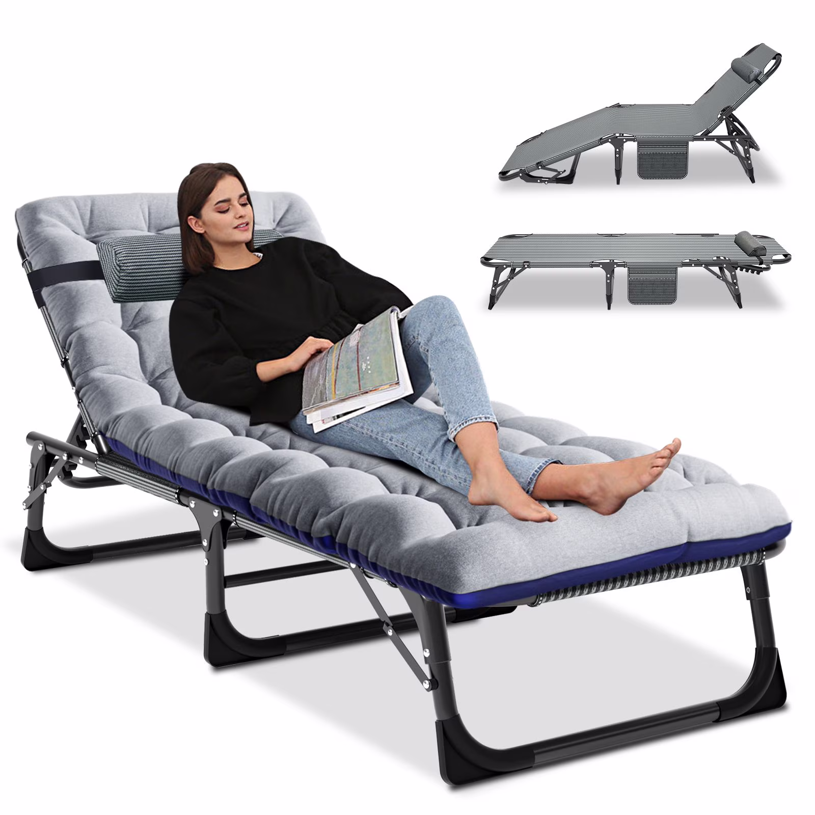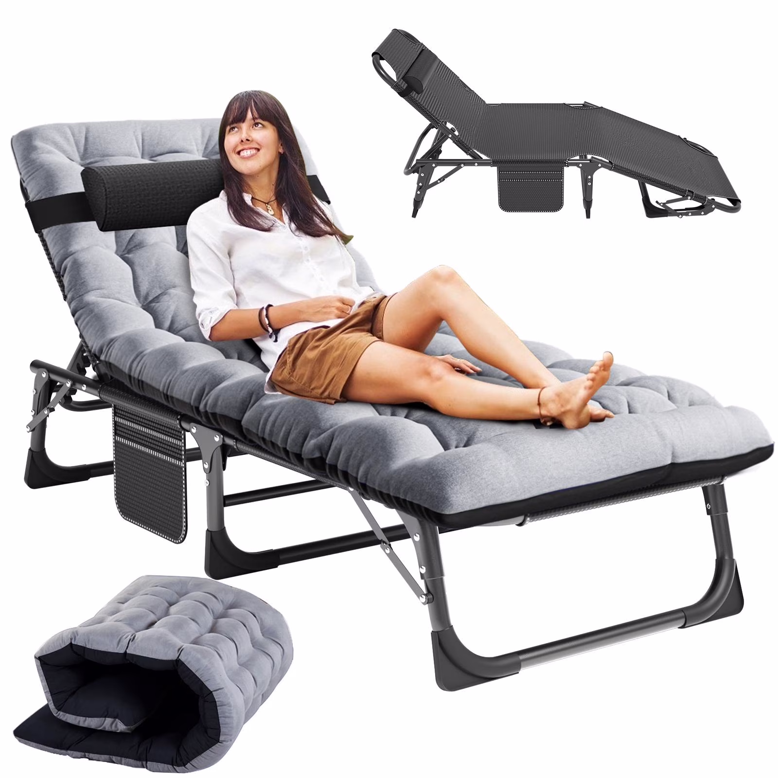 MOPHOTO Lounge Chair with Mattress, Outdoor Chaise Lounge Support 440 lb, Adjustable Portable Heavy Duty Sleeping Cots Bed for Camping, Pool, Beach, Patio