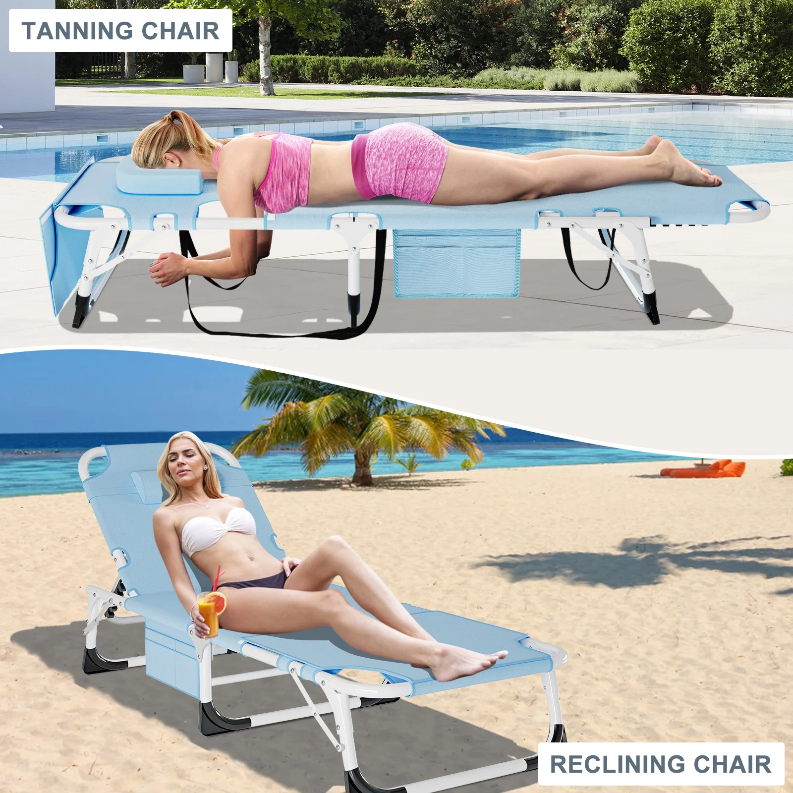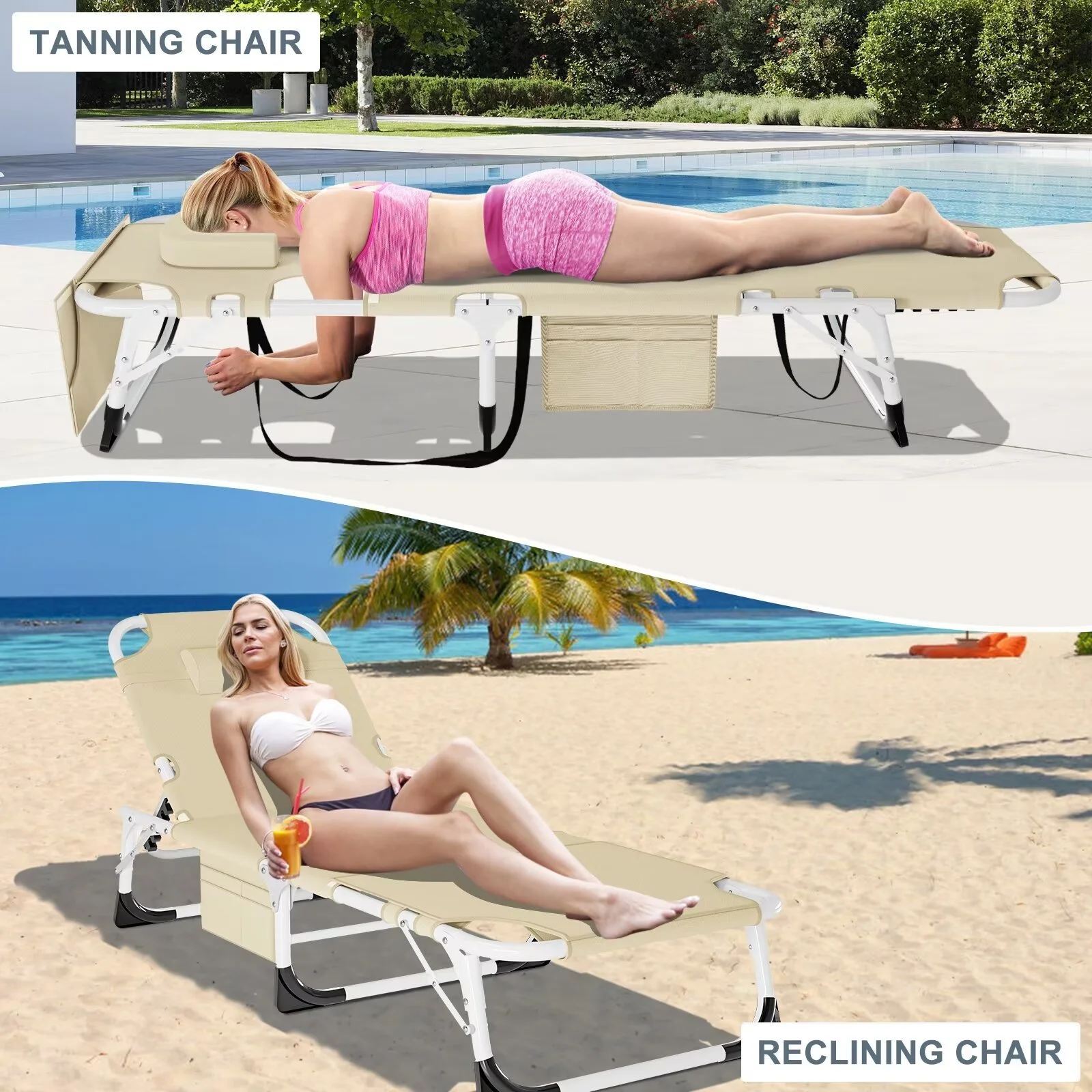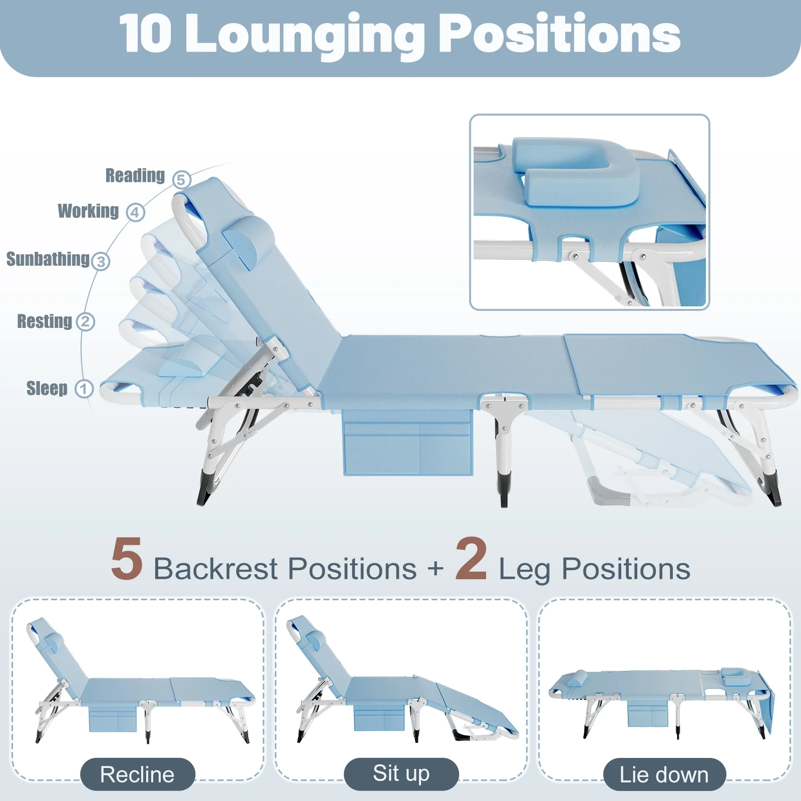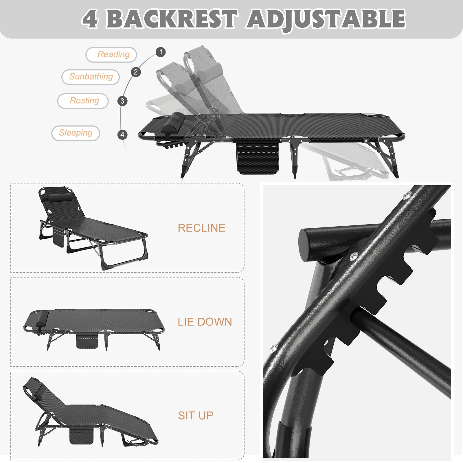 ��5 Positions Adjustable��: This lounge chair is designed with a 5-position adjustable locking system that allows you to adjust to a comfortable position according to your needs. You can sit up, lie down or lie flat.