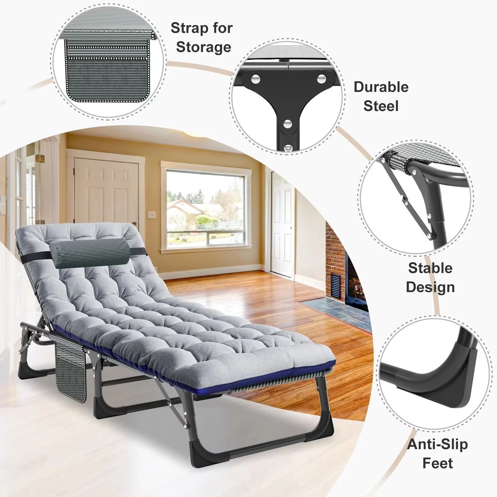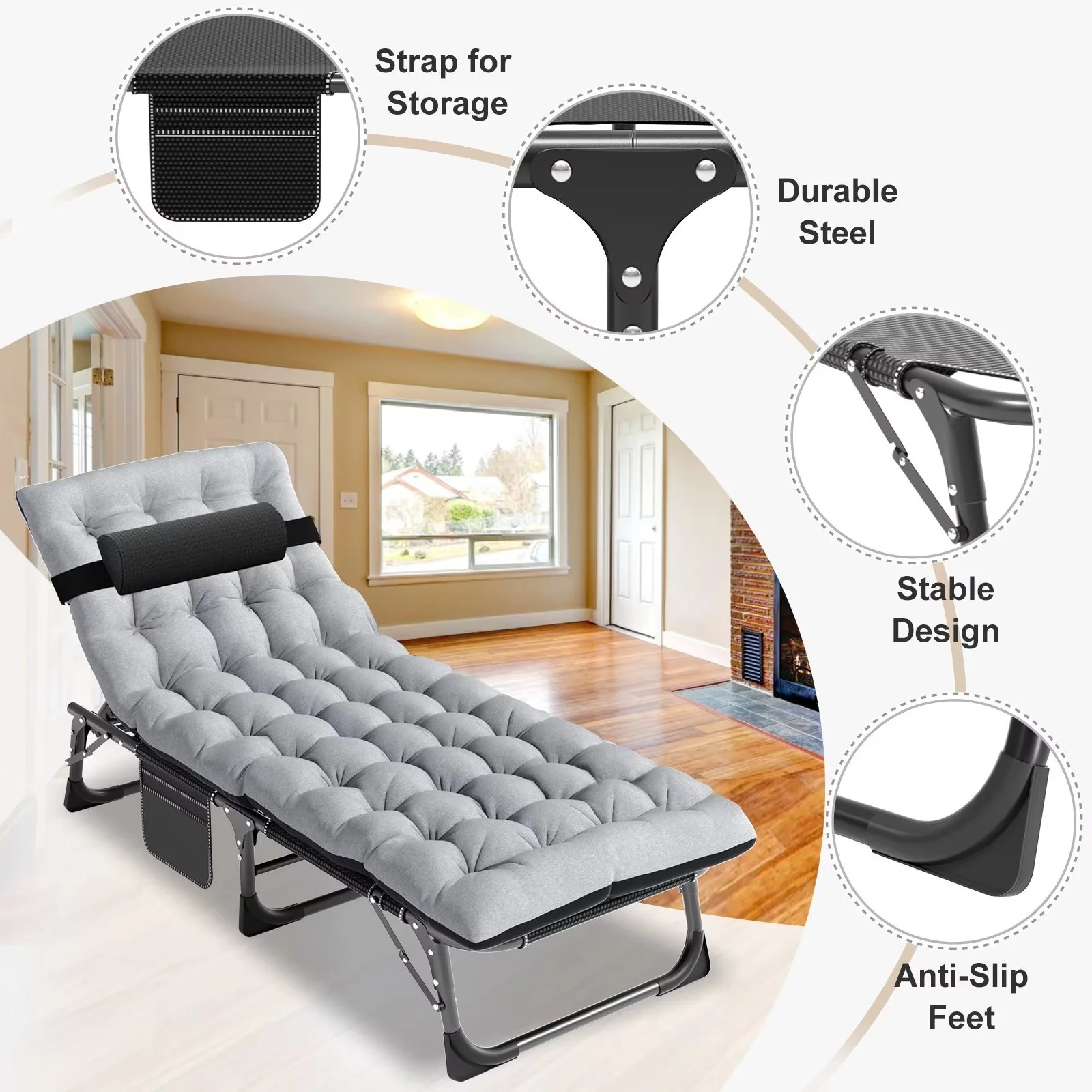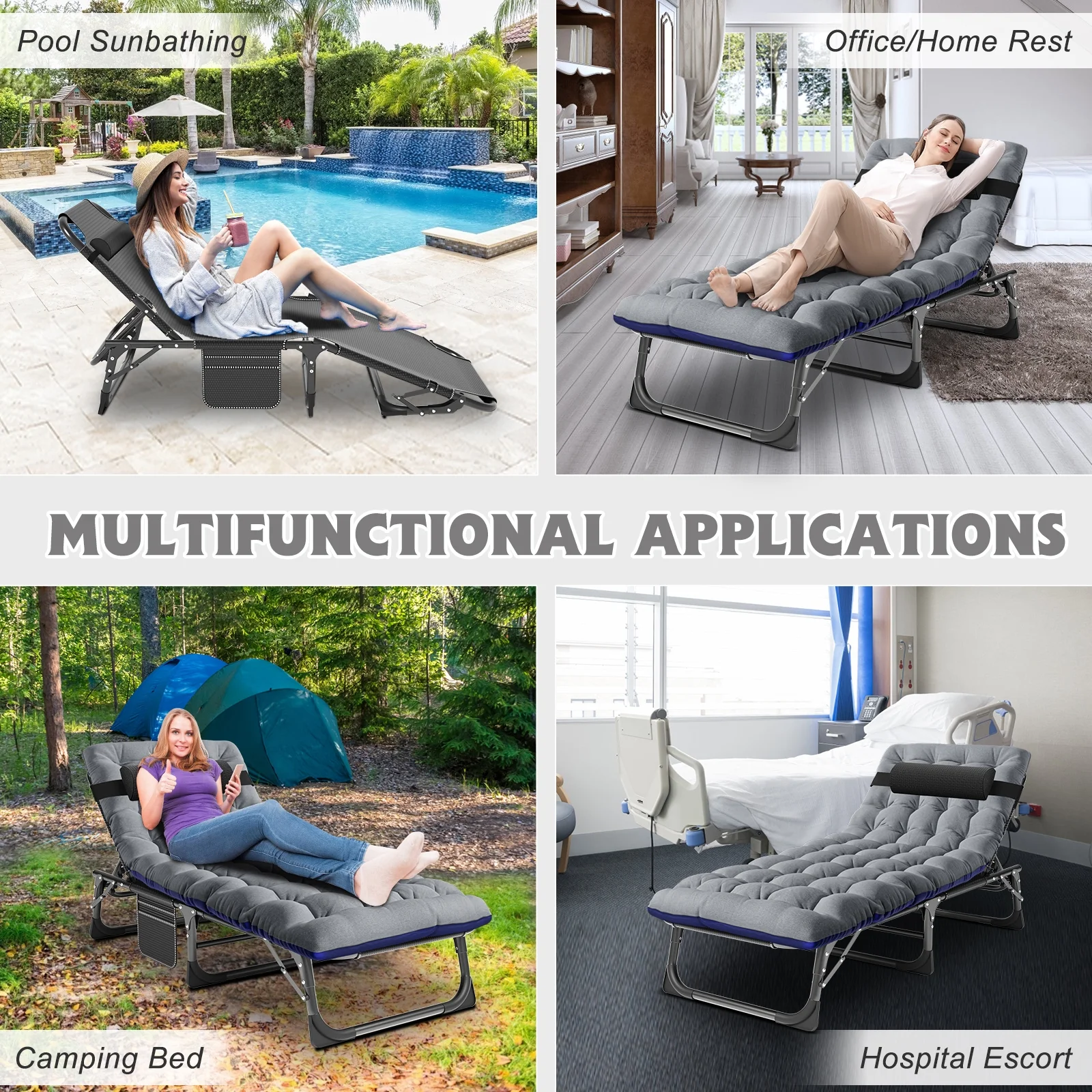 ��Wide Application��: The lounge chair can be used as a simple bed in the office or a comfortable place to sleep when camping, or as the perfect temporary cot when guests come to your home. Portable folding lounge chair suitable for relaxing at home, patio, pool, lake, beach, RV, camping, deck, deck, tent or cabin.