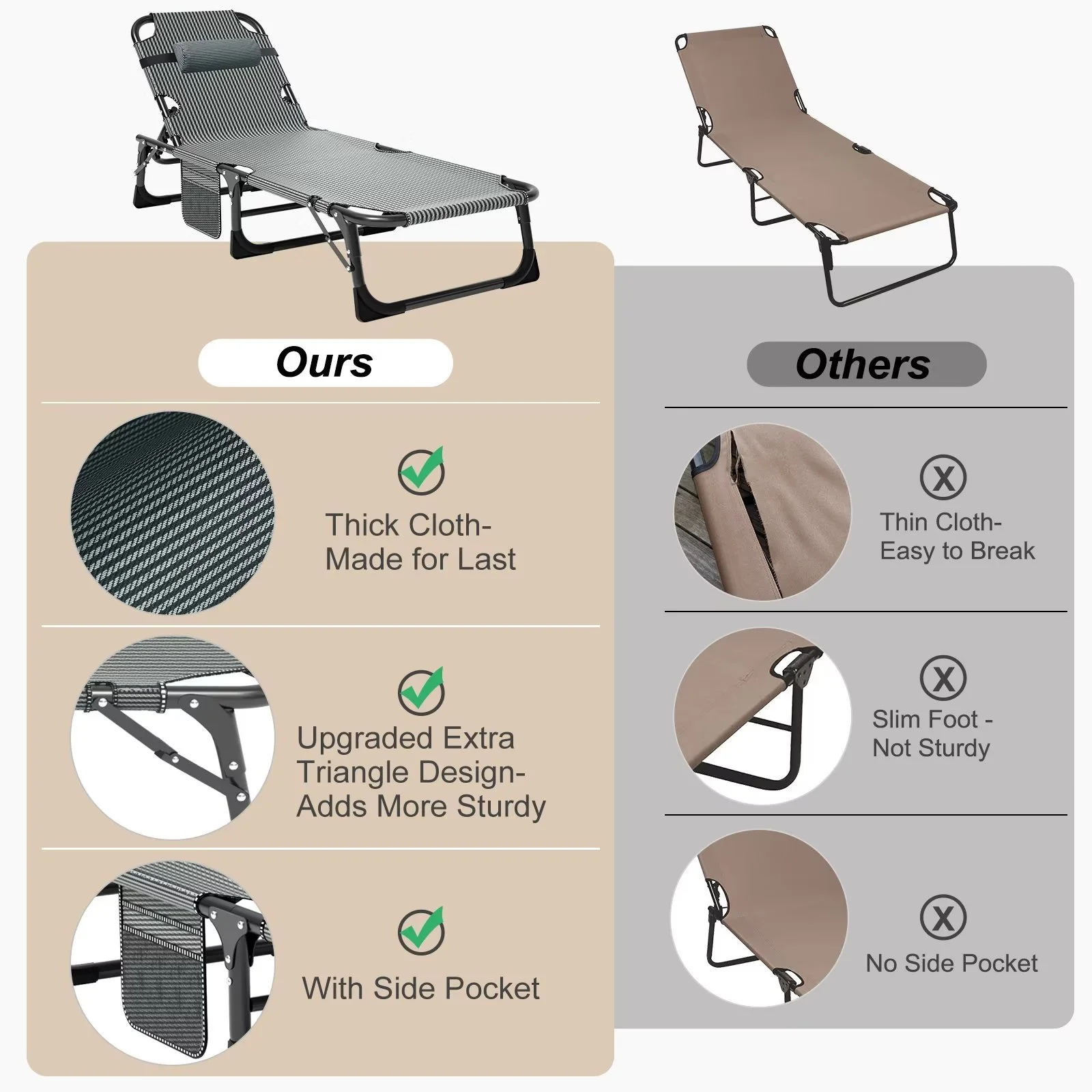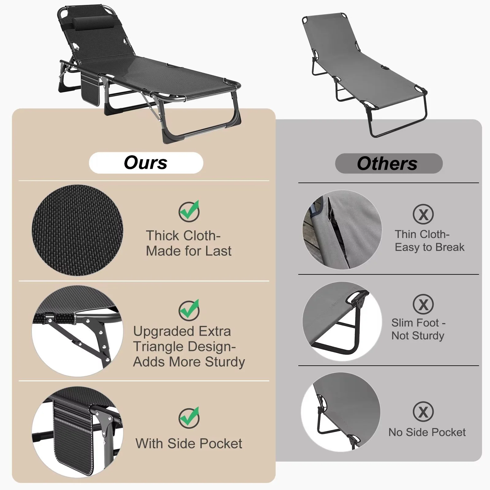 ��Comfortable Design��: Our lounge chair has a side pocket for your cell phone, books or keys; the pillow is removable and can be adjusted up or down or removed as you see fit.