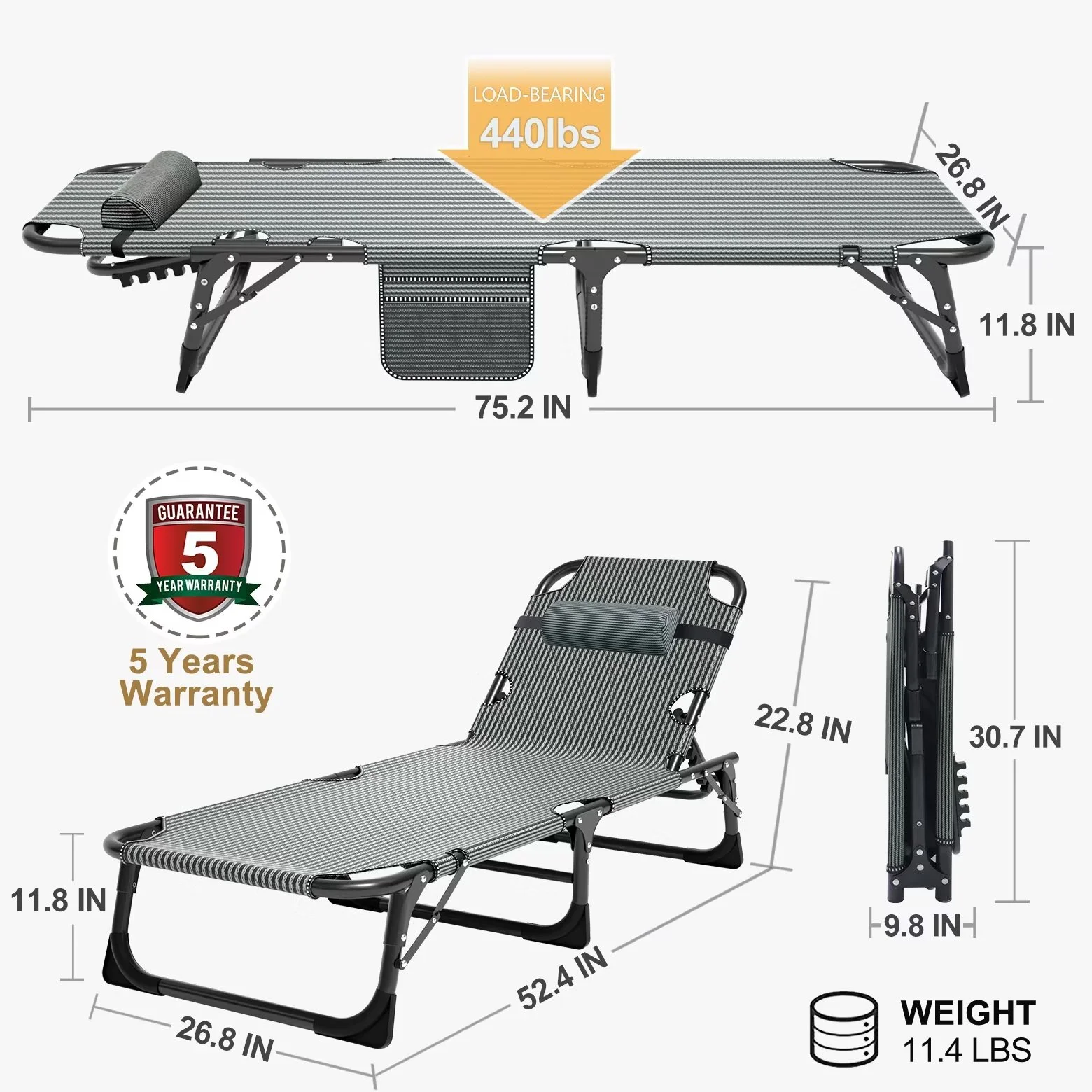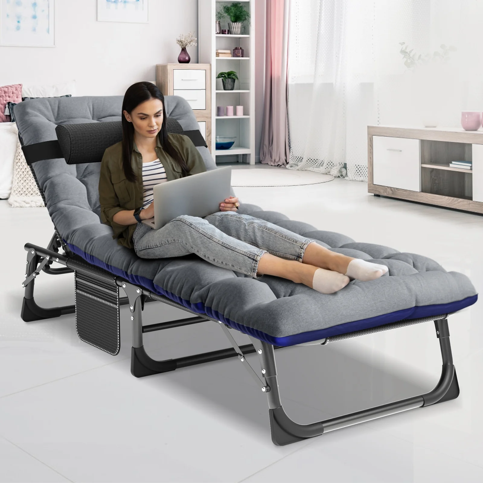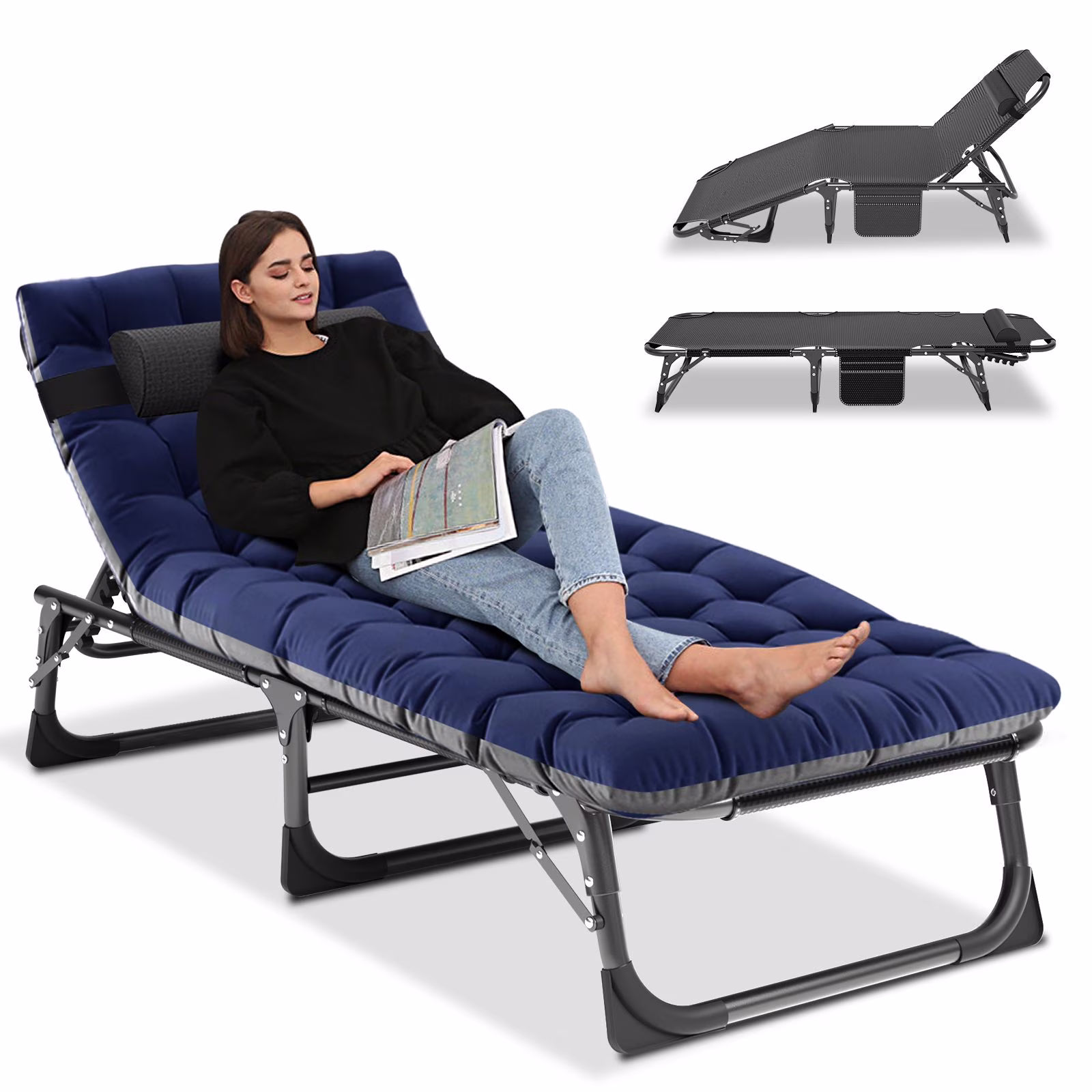 MOPHOTO outdoor lounge chair with a maximum weight capacity of 440 lbs. The abrasion-resistant, breathable Oxford fabric also meets non-toxic and safety standards. Designed with a 5-position adjustable locking system, it can be adjusted to a comfortable position according to your needs. You can sit up, lie down or lie flat. MOPHOTO outdoor chaise lounge unfolded, the folding chair measures: 75.2" x 25.6" x 11.8". At only 11.4 lbs, the lounge chair's tri-fold storage design makes it very easy to transport and store. Comes with a removable soft mattress and pillow that can be adjusted as needed to add extra comfort. You can sleep more comfortably in this lounge chair. You'll feel more comfortable and warm when sleeping in the fall and winter. In hot weather, the mattress can be taken to open the wind. The lounge chair has a pocket on the side for your phone, books or keys. Portable folding lounge chair are perfect for relaxing at home, on the patio, pool, lake, beach, RV, camping, patio, deck, tent, cabin or use as a guest bed.