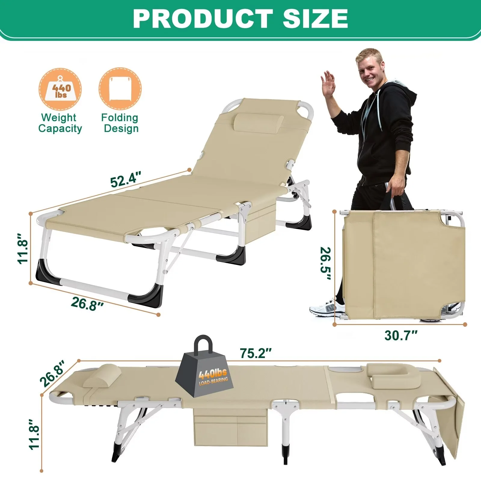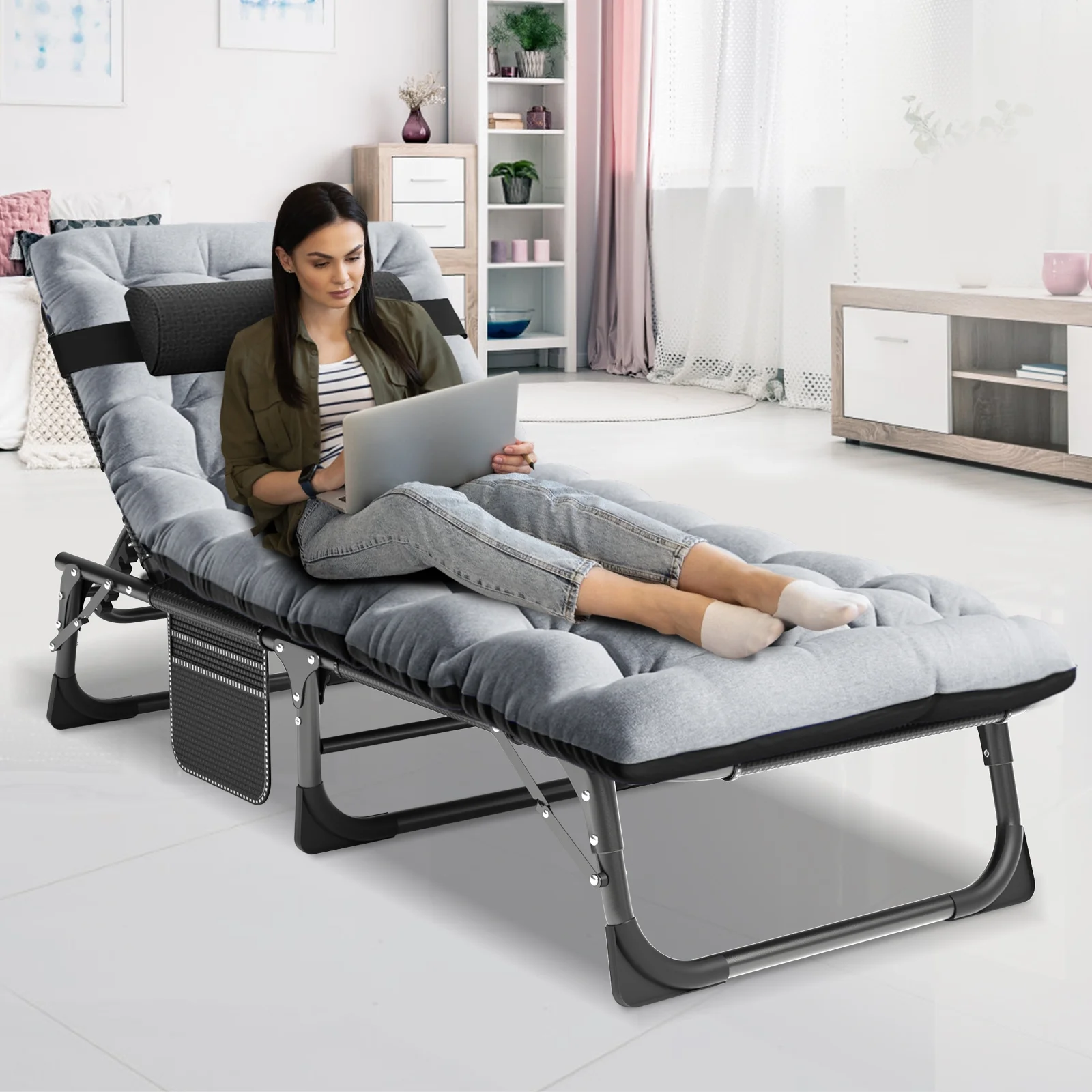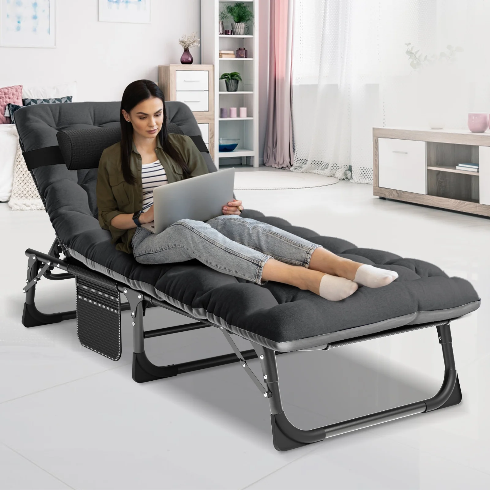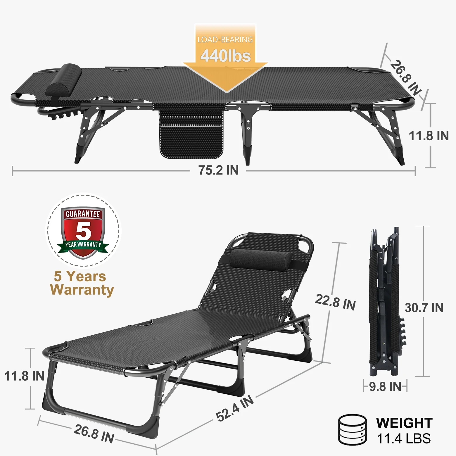 MOPHOTO outdoor lounge chair with a maximum weight capacity of 440 lbs. The abrasion-resistant, breathable Oxford fabric also meets non-toxic and safety standards. Designed with a 5-position adjustable locking system, it can be adjusted to a comfortable position according to your needs. You can sit up, lie down or lie flat. MOPHOTO outdoor chaise lounge unfolded, the folding chair measures: 75.2" x 25.6" x 11.8". At only 11.4 lbs, the lounge chair's tri-fold storage design makes it very easy to transport and store. Comes with a removable soft mattress and pillow that can be adjusted as needed to add extra comfort. You can sleep more comfortably in this lounge chair. You'll feel more comfortable and warm when sleeping in the fall and winter. In hot weather, the mattress can be taken to open the wind. The lounge chair has a pocket on the side for your phone, books or keys. Portable folding lounge chair are perfect for relaxing at home, on the patio, pool, lake, beach, RV, camping, patio, deck, tent, cabin or use as a guest bed.