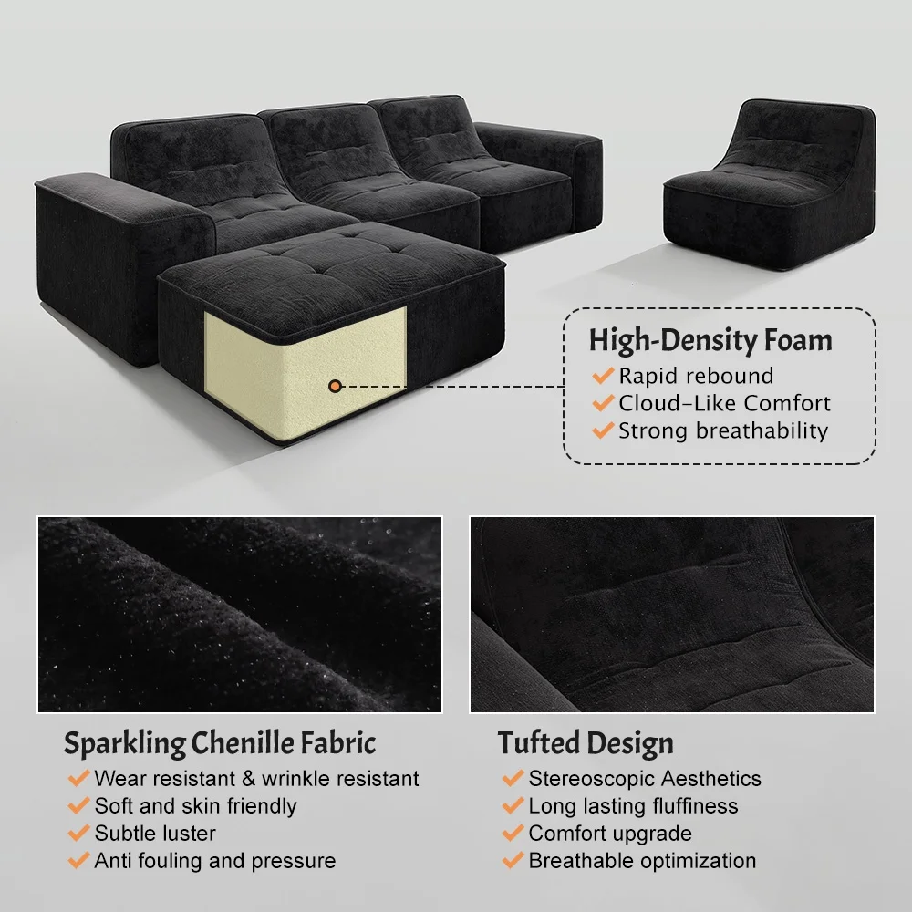 Stretch out on 144" of sparkle-kissed chenille: this modular cloud sofa ships fully assembled��just unbox, flip and lounge. 21.3" deep seats stuffed with high-density foam cradle 300 lb per s-pot, while curved, lumbar-supportive backs erase fatigue. Arrange L-shape, linear or separate chairs; the shimmering fabric resists stains and wrinkles, so movie marathons, reading naps and guest overflow stay chic and carefree.
