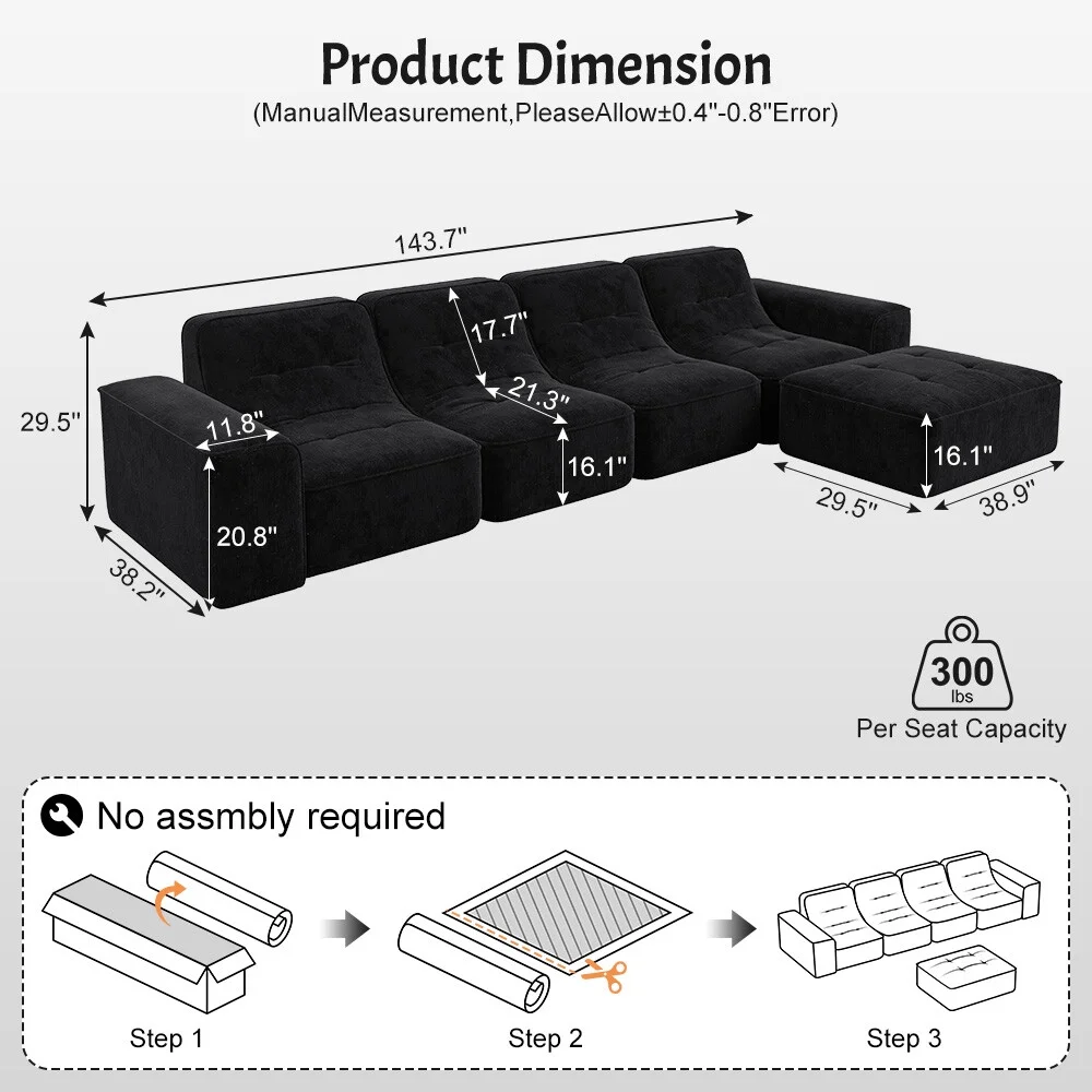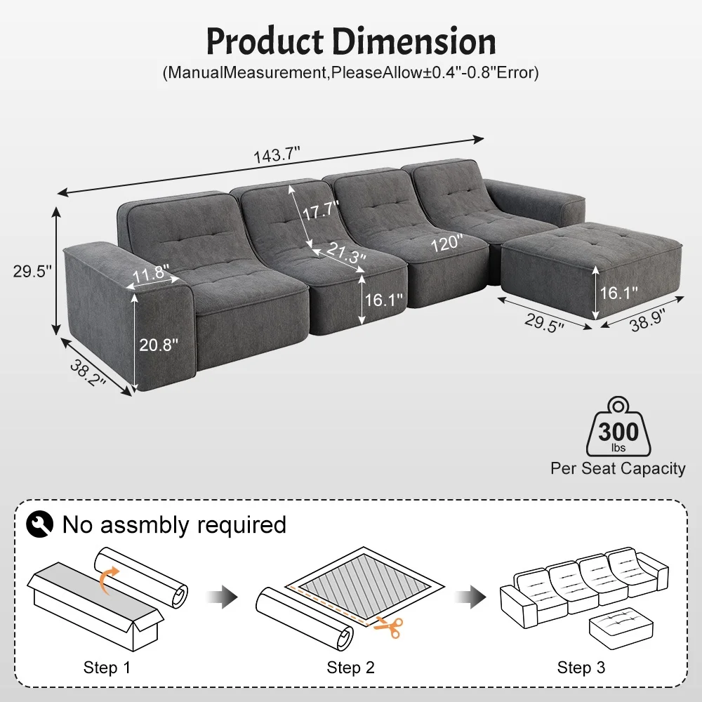 - ��No Assembly Required��??This sofa arrives in two boxes with no tools or assembly needed��simply unbox, arrange the modules, and let the cushions expand. Start enjoying your luxurious and functional seating area in no time.