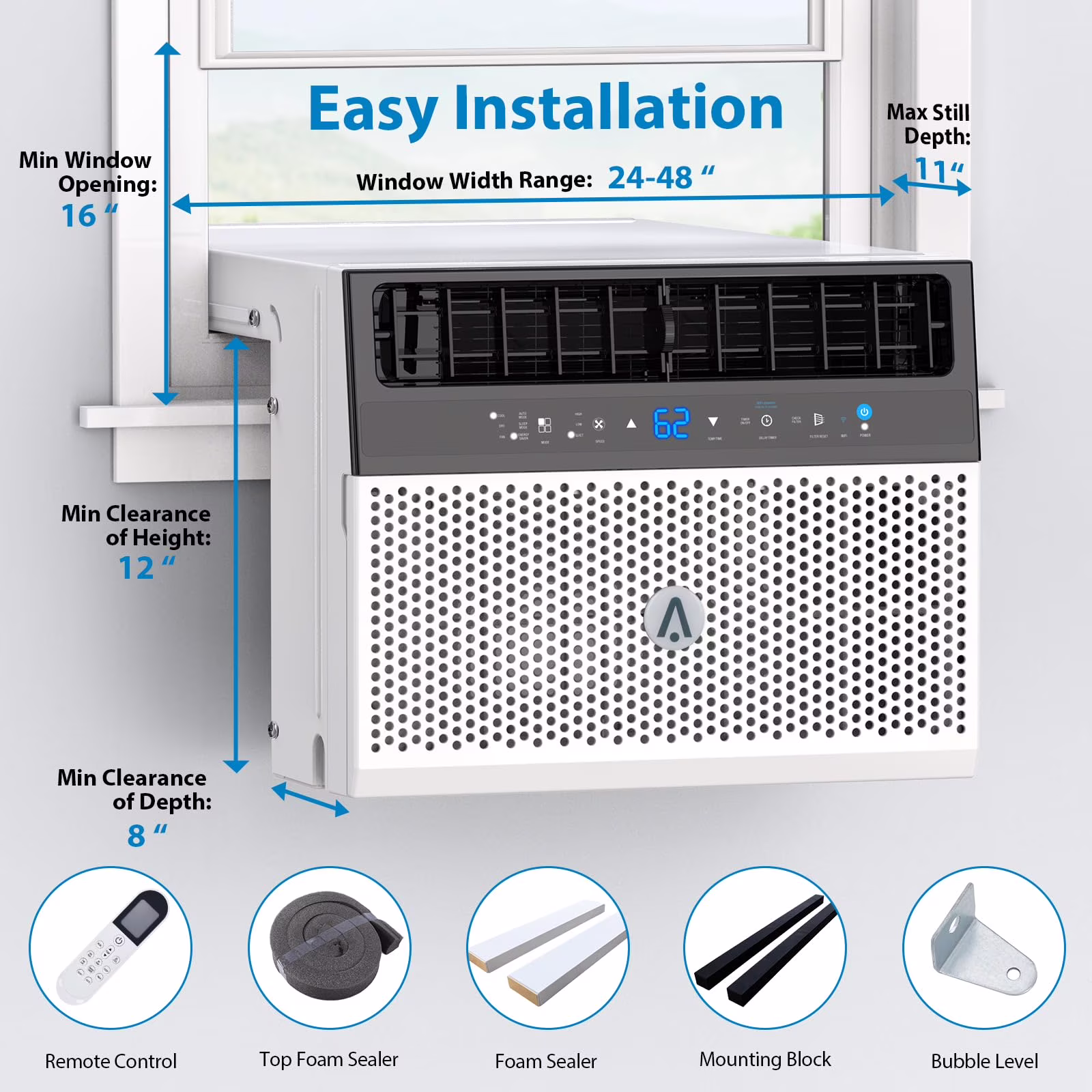 - Easy Installation and Compatibility: The air conditioner is suitable for windows with a minimum opening width of 24 inches and a maximum wall thickness of 11 inches. It is recommended to tilt the unit 1-2�� outside of the room during installation to prevent rainwater from entering.