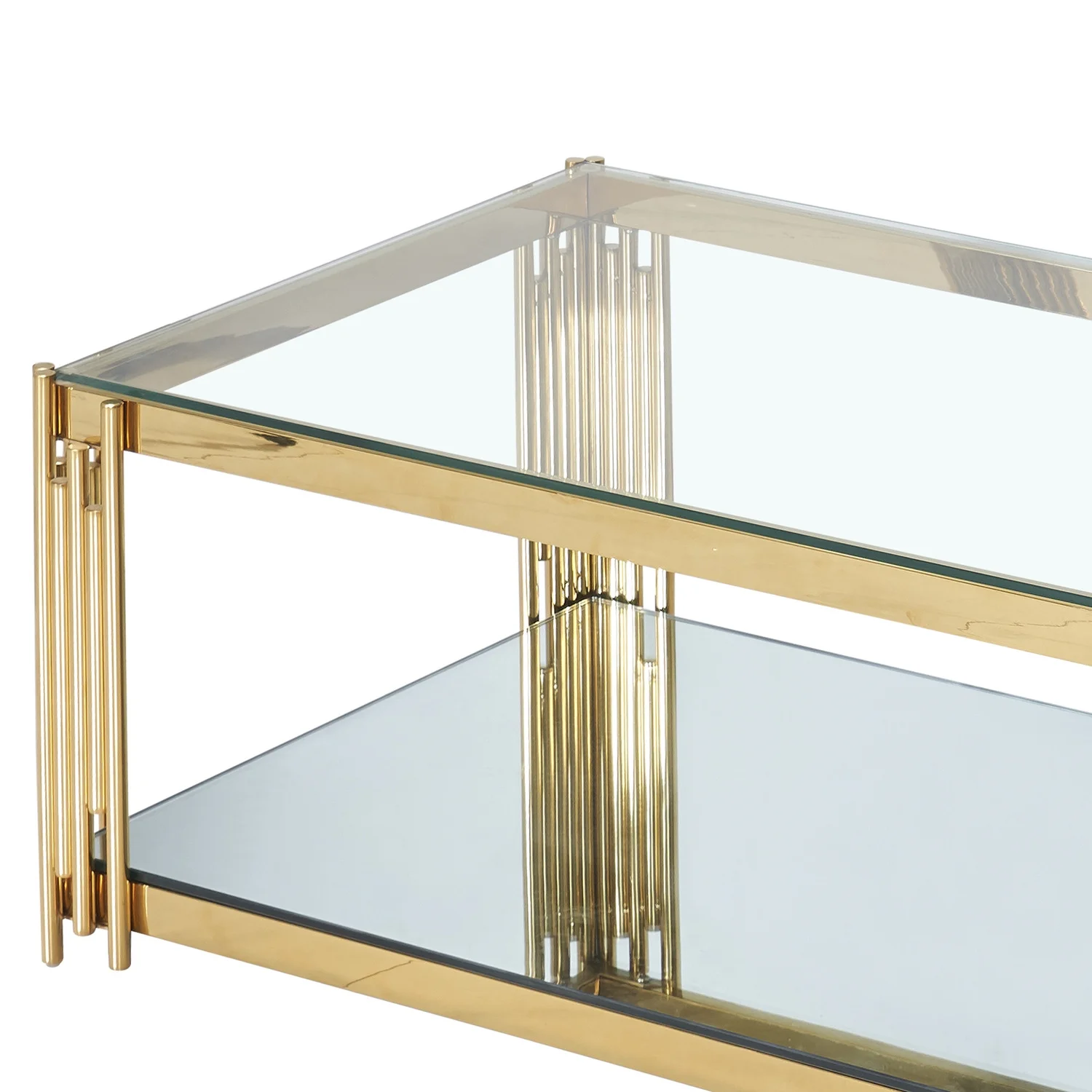 Contemporary table with some art-deco inspired style. The polished metal frame and two-tier glass and mirror design will bring instant shine to any room and provide space to store and display.