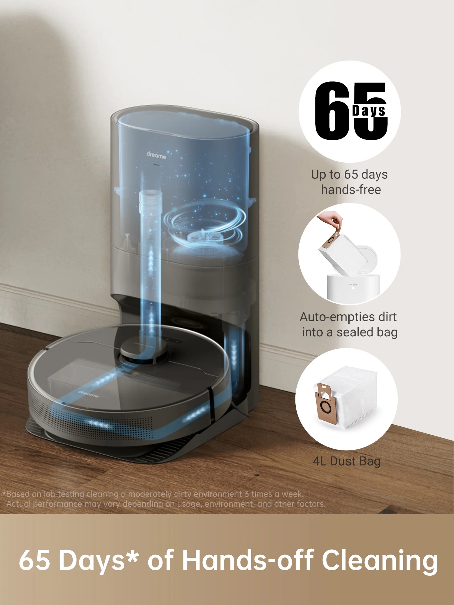 - Up to 65 days hands-free cleaning: D10s Plus takes the hassle out of cleaning with up to 65 days of hands-free dust collection; A large 4L dust bag of D10s Plus with E12 filter levels, which traps 99.5% of fine particles to keep dust out of your air; DualBoost 1.0 of D10s Plus' vacuuming configuration collects hair, dirt, dust, and debris quickly and effectively without clogging; All you have to do is toss the bag.