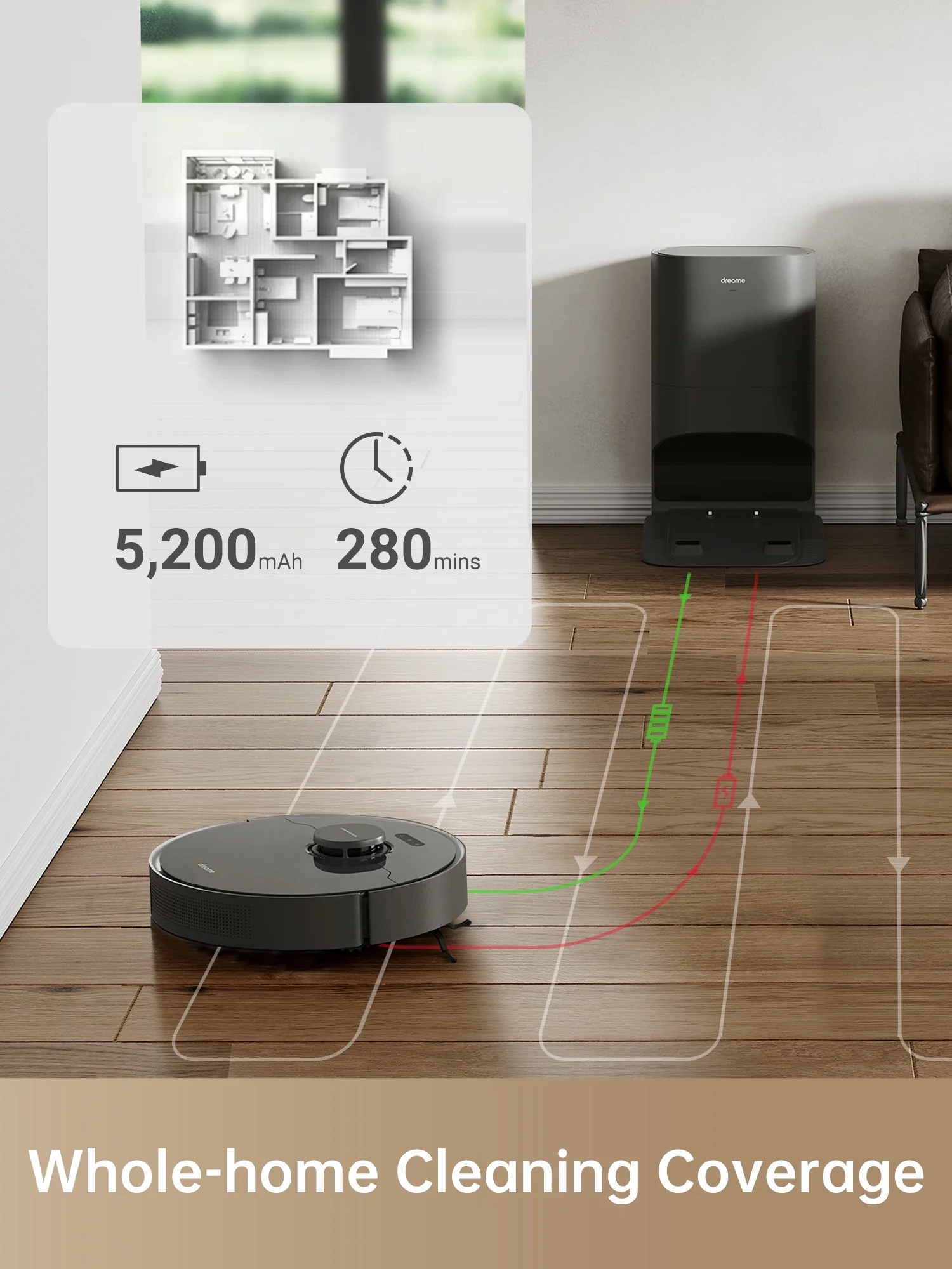 - Extended Runtime: Up to 280 mins of runtime for whole-home cleaning. When power runs low, your robot returns to recharge automatically and then picks up cleaning from right where it left off to ensure your whole home is cleaned.