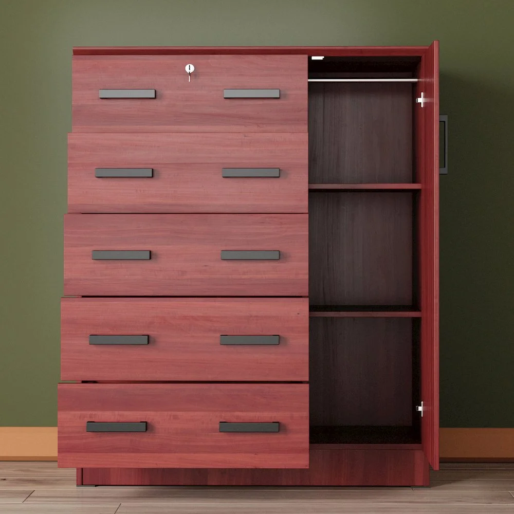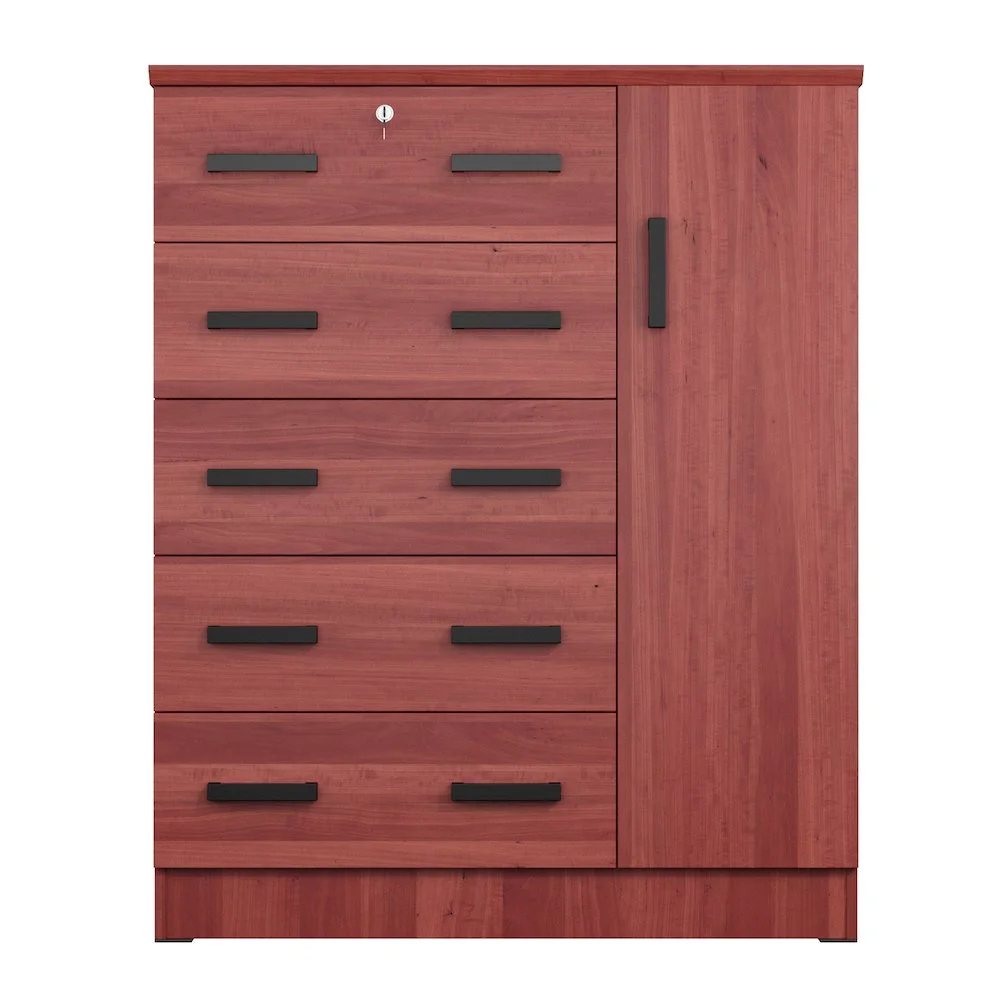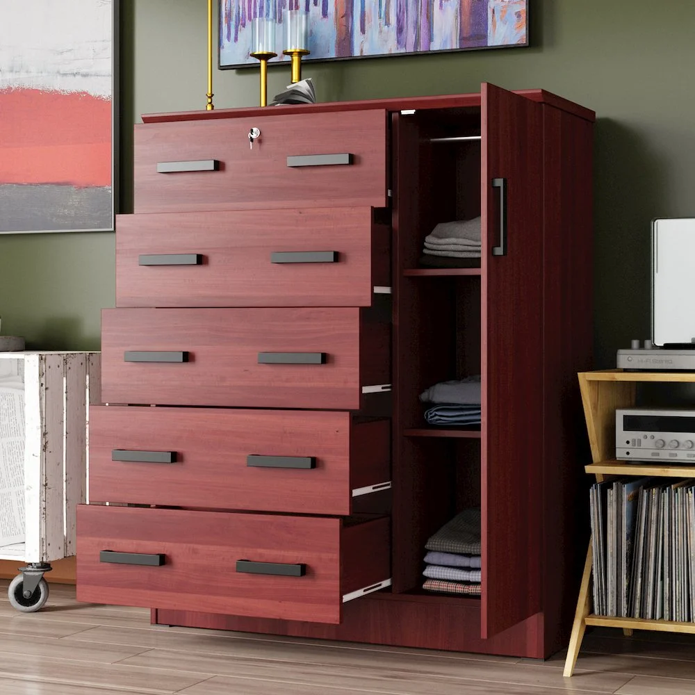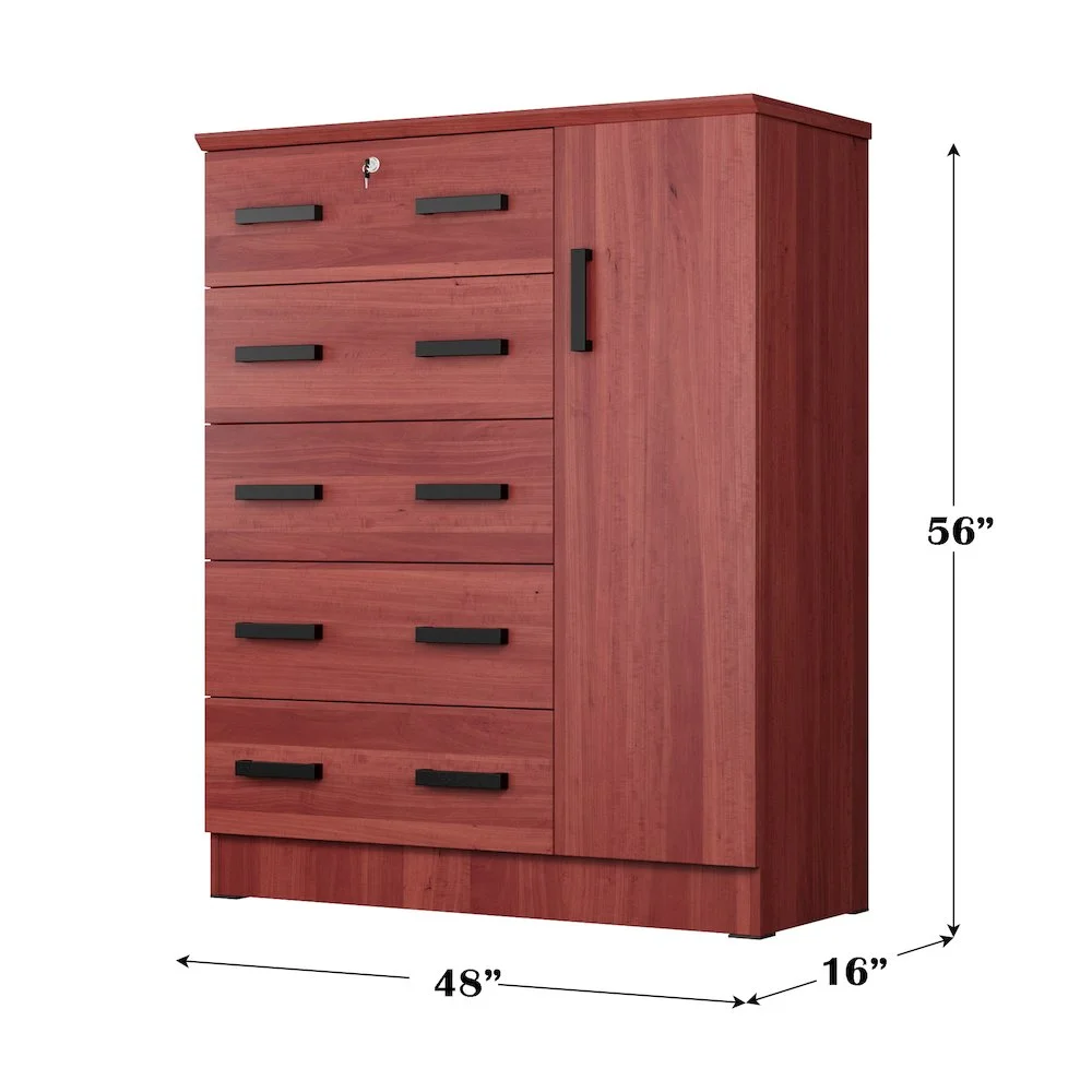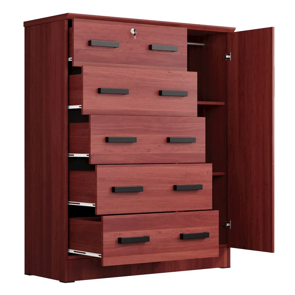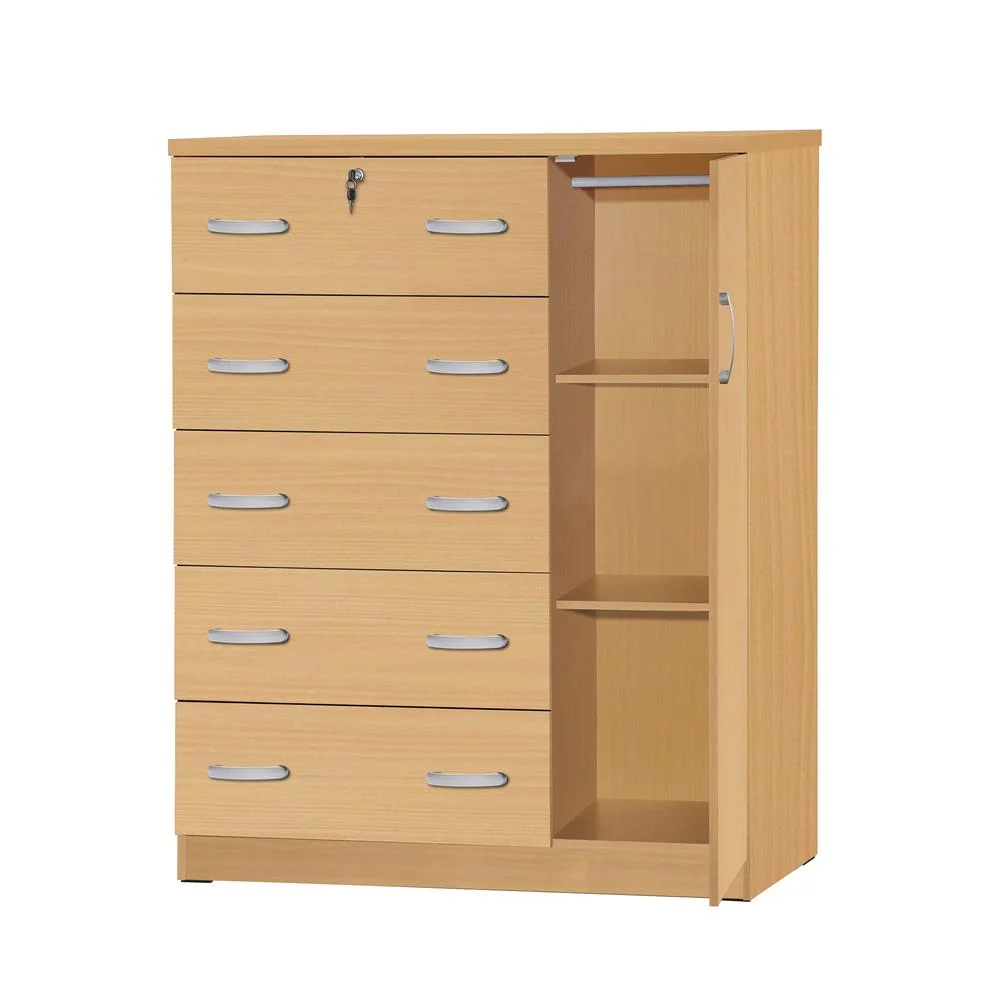 The Better Home Products JCF Sofie 5 Drawer Wooden Tall Chest Wardrobe strikes a perfect balance between your storage as well as design requirements. It is constructed out of engineered wood and is available in multiple finishes. This chest has five drawers, top one has a lock. Each drawer comes with extra support underneath which can handle extra weight. This chest also features a side door when open reveals shelves and hanging rod for extra storage space. This chest has ample space on the surface top to showcase a photo frame, an antique clock, and a vase. It has a clean and simple design making it easier for you to place it anywhere. Available in Beech (Maple), Black, White, Mahogany and Gray color options. Professional Assembly Recommended.