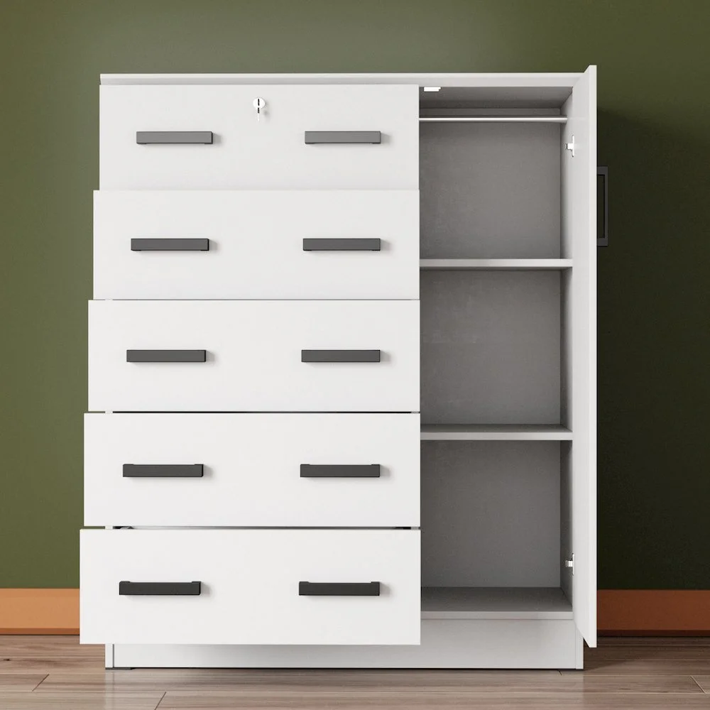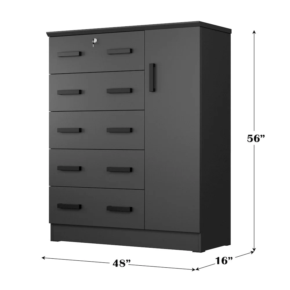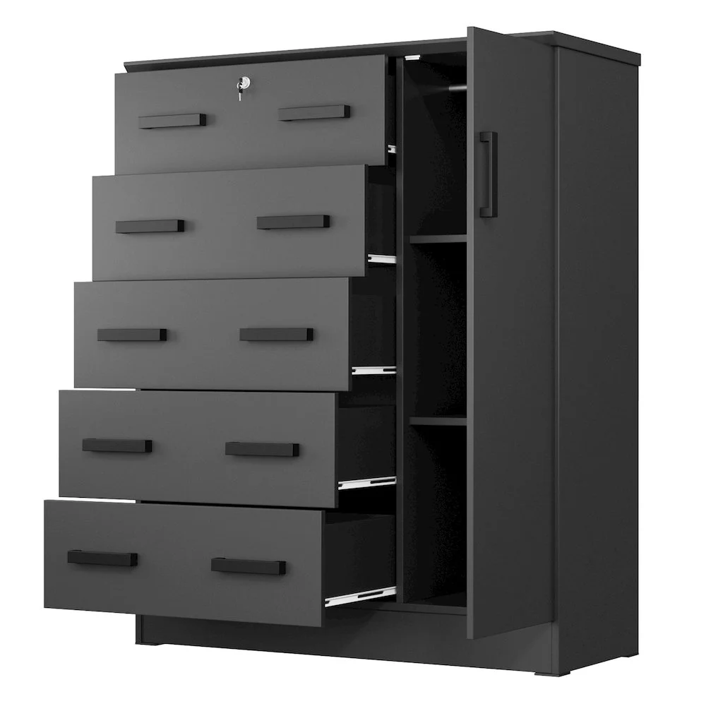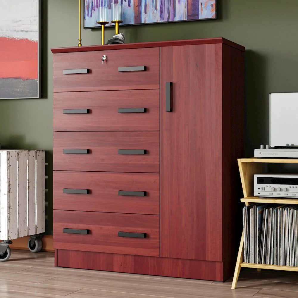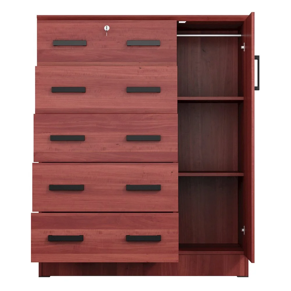 The Better Home Products JCF Sofie 5 Drawer Wooden Tall Chest Wardrobe strikes a perfect balance between your storage as well as design requirements. It is constructed out of engineered wood and is available in multiple finishes. This chest has five drawers, top one has a lock. Each drawer comes with extra support underneath which can handle extra weight. This chest also features a side door when open reveals shelves and hanging rod for extra storage space. This chest has ample space on the surface top to showcase a photo frame, an antique clock, and a vase. It has a clean and simple design making it easier for you to place it anywhere. Available in Beech (Maple), Black, White, Mahogany and Gray color options. Professional Assembly Recommended.