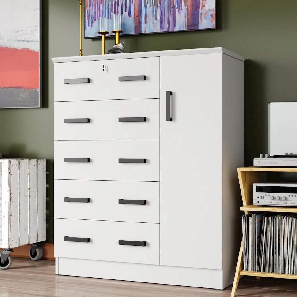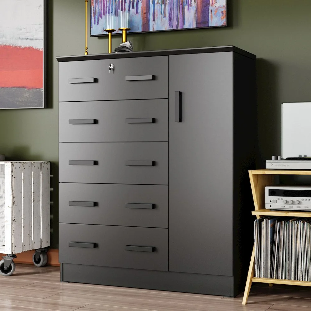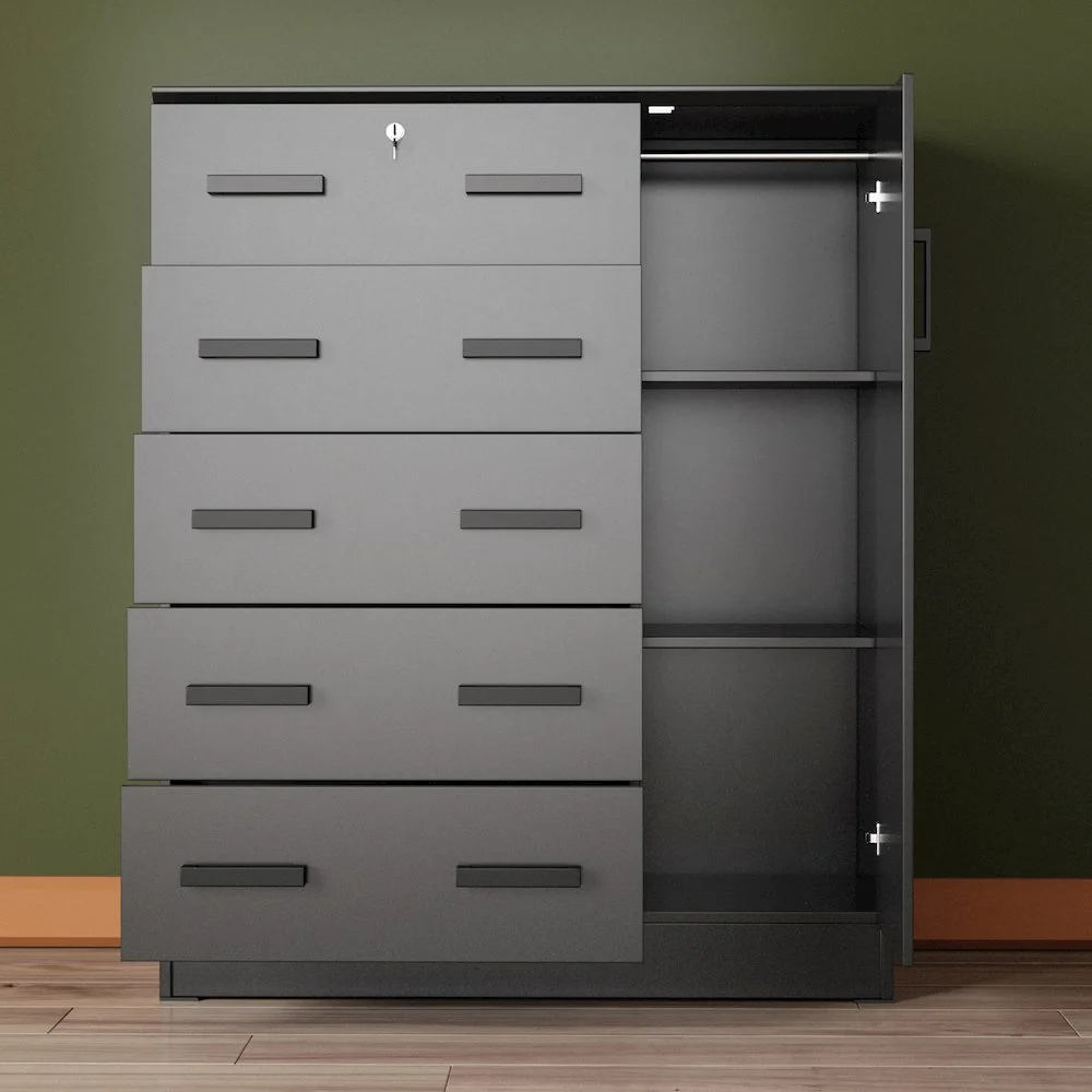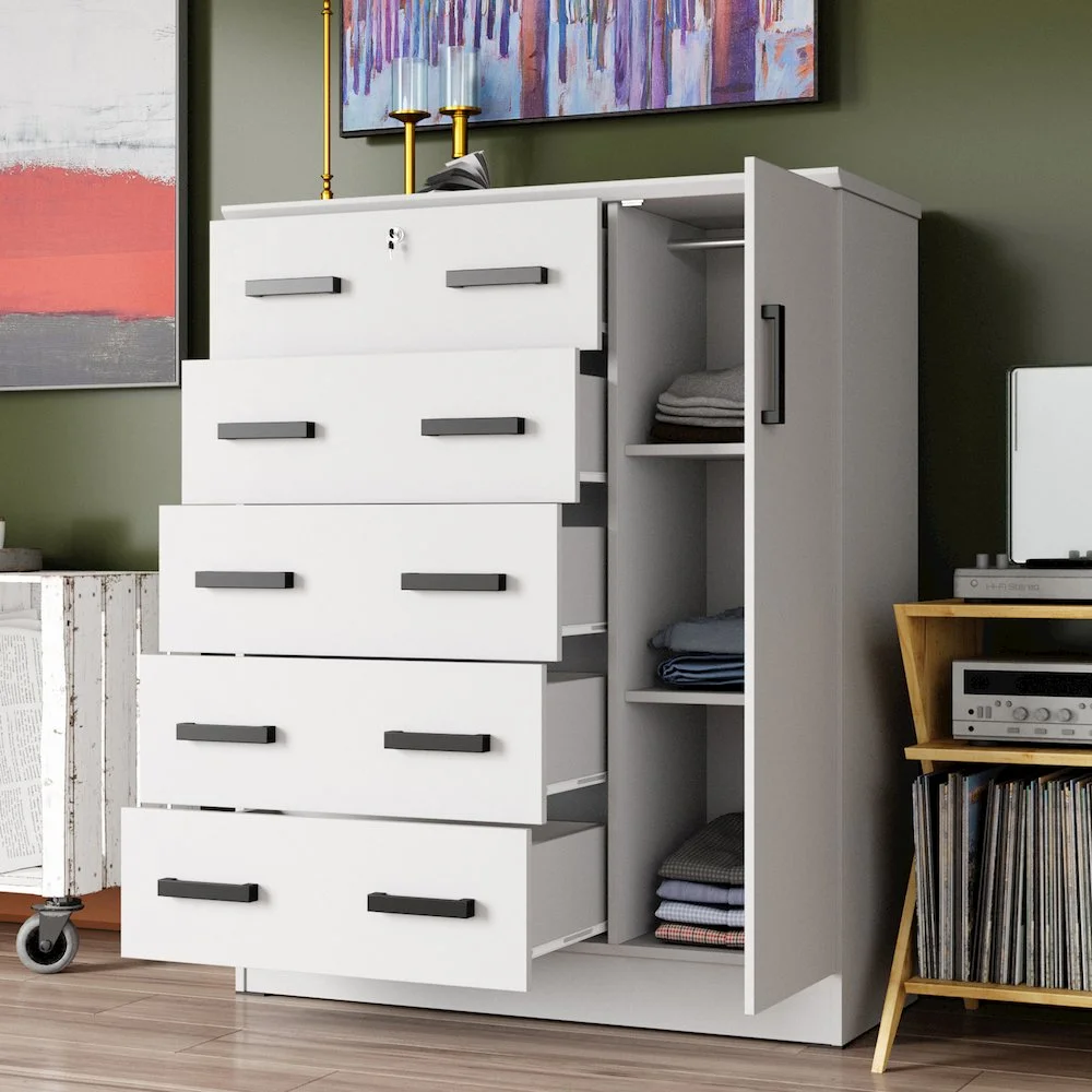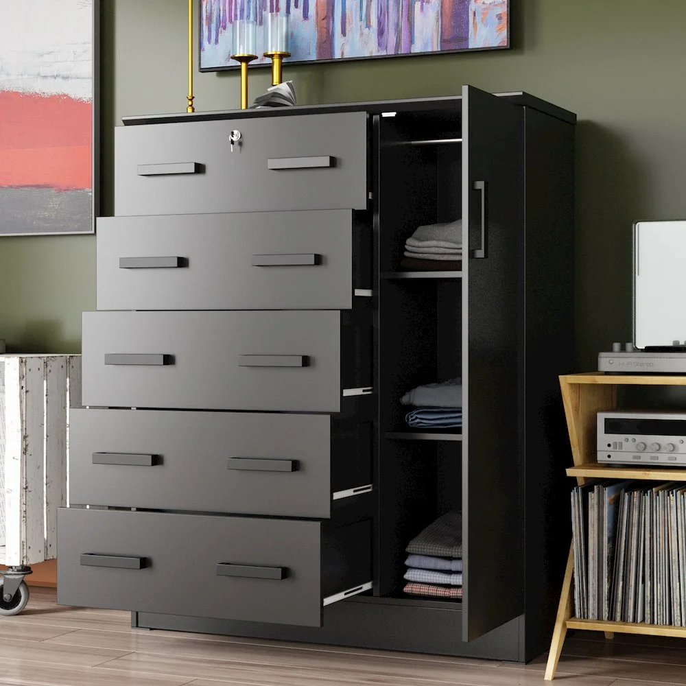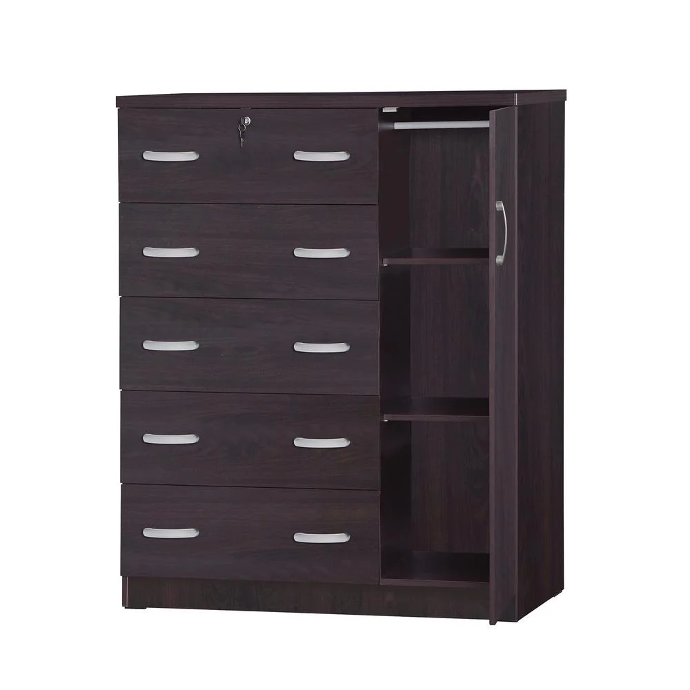 The Better Home Products JCF Sofie 5 Drawer Wooden Tall Chest Wardrobe strikes a perfect balance between your storage as well as design requirements. It is constructed out of engineered wood and is available in multiple finishes. This chest has five drawers, top one has a lock. Each drawer comes with extra support underneath which can handle extra weight. This chest also features a side door when open reveals shelves and hanging rod for extra storage space. This chest has ample space on the surface top to showcase a photo frame, an antique clock, and a vase. It has a clean and simple design making it easier for you to place it anywhere. Available in Beech (Maple), Black, White, Mahogany and Gray color options. Professional Assembly Recommended.