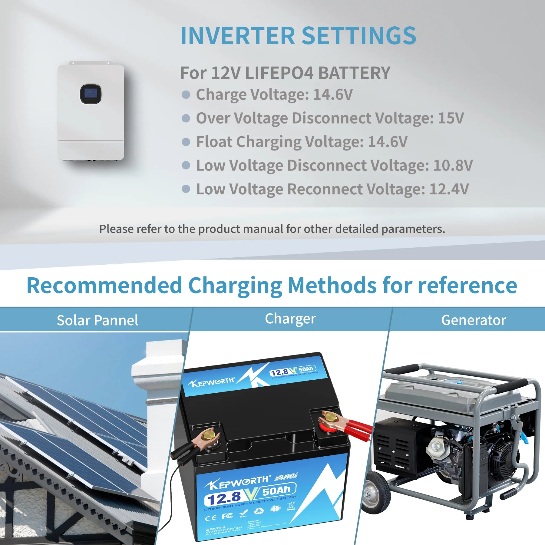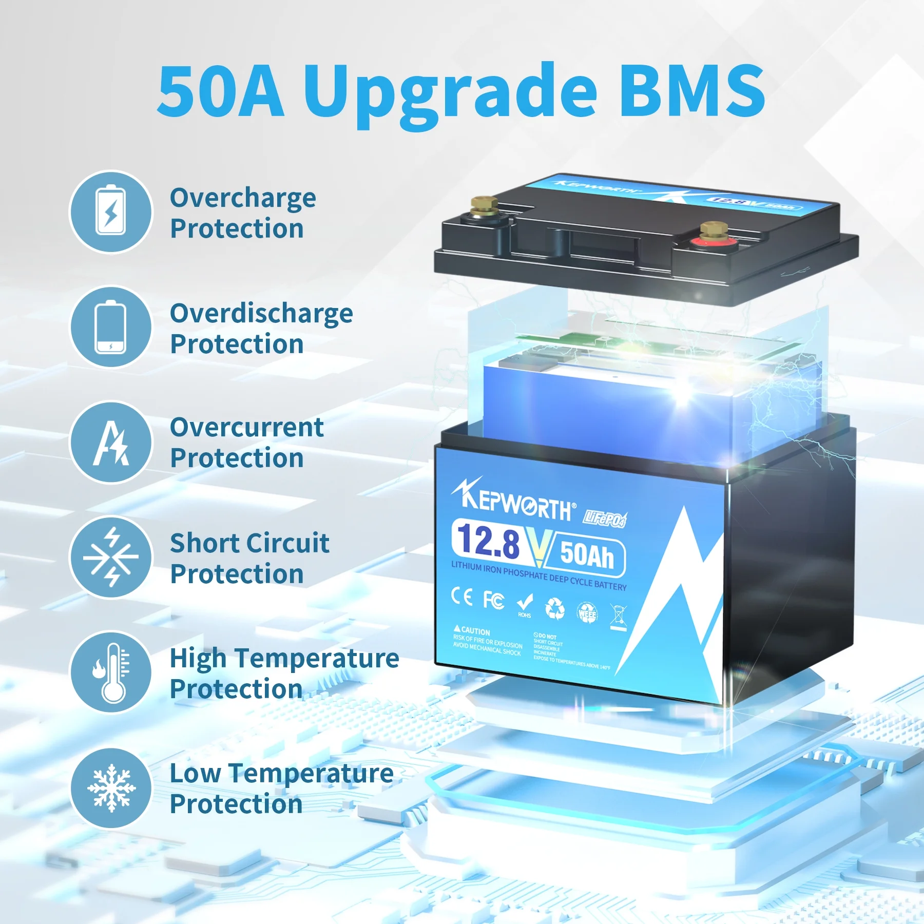- →【BUILT-IN 100A BMS, a 14.6V 7A Lithium charger included�?Our 12.8V 50Ah Lithium battery with built-in 100A BMS, which can prevent the LifePO4 battery from the most common issue causing of battery failure, such as overcharge, over-discharge,over-heating, over-current and short circuit. Our 12V 50Ah LiFePO4 battery comes with a 14.6V 7A LiFePO4 Charger.