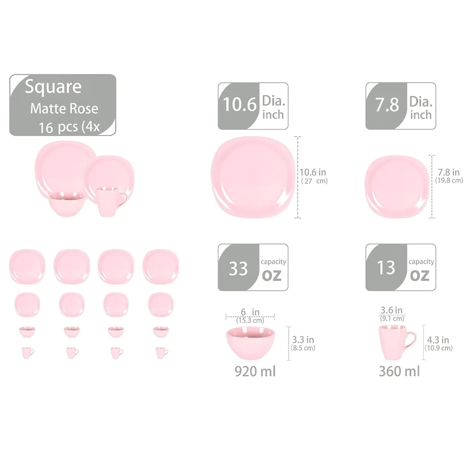 - Service for 4: 16pc Square Dinnerware Set including 4 of Each: Dinner Plate Square 10.6" x 10.6", Salad Plate Square 7.8" x 7.8", Soup Bowl Square 6" x 6"", Mug Square 13oz