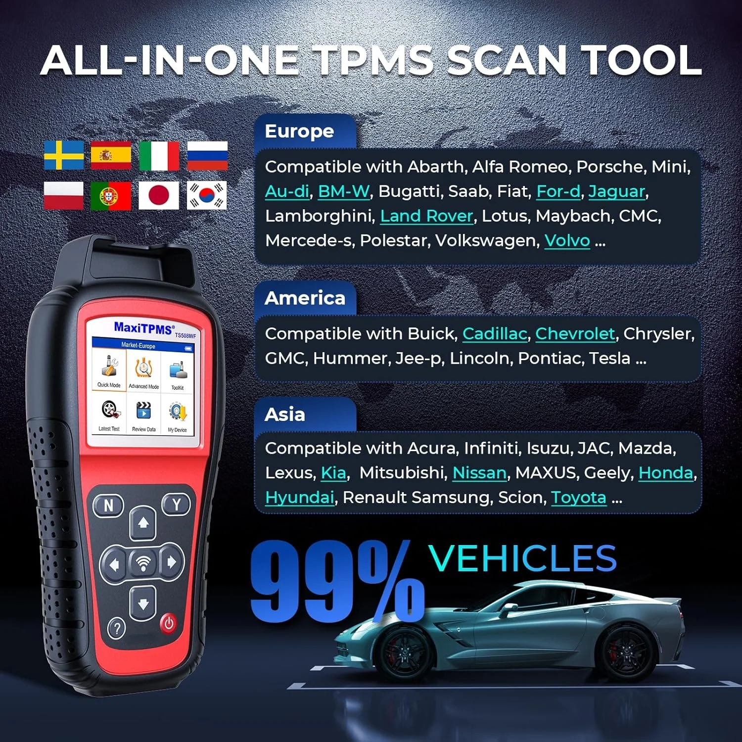 - 🔥🔥[2025 TPMS Programming Tool TS508WF] Inheriting all features from MaxiTPMS TS508 yet with wireless update capability (via Wi-Fi) as TPMS reset tool TS608, this next-generation of TPMS scan tool TS508WF will help you fix 99% common TPMS issues: activate 433/315MHz sensors; read tire sensor data; complete TPMS health check; 3000+ on-tool relearn guides; MX-sensor program (in batch 1-16) and more, operating in Quick or Expert mode to meet all user’s needs.
