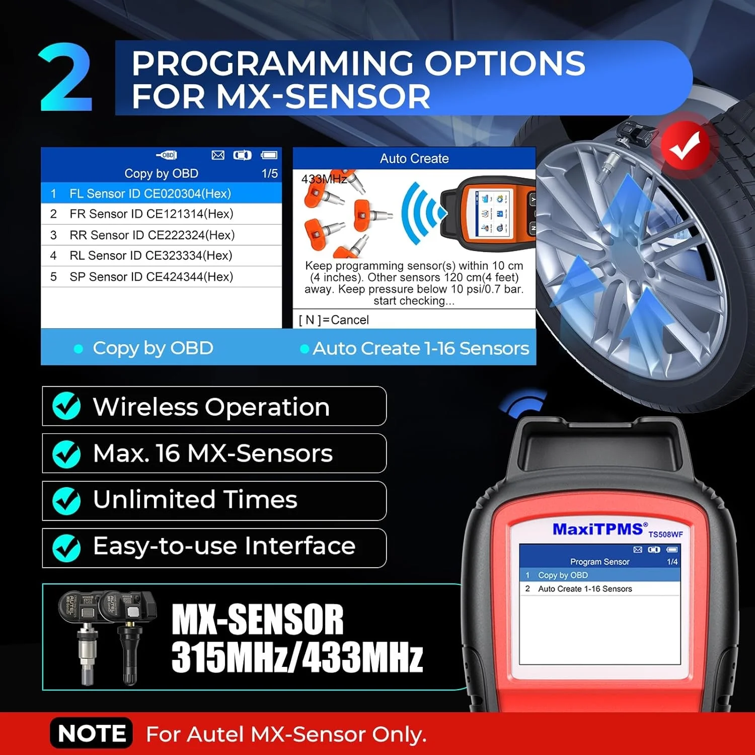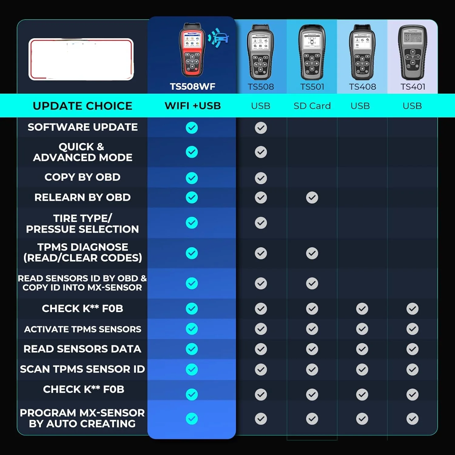 - 🔥🔥[ TS508WF with 2 Methods TPMS Programming] Upgraded from TS508/TS501 PRO/TS408S, TS508WF TPMS scan tool with OBD2 Connector can complete sensor programming through 1)Copy by OBD ( TS401/TS408 doesn’t have): directly write the ID saved in the ECU; 2) Auto Create 1-16: when you can't get the original ID. And it can provide Wireless Programming with Maximum 16 MX-Sensors, make your work more easier. NOTE that TS508WF TPMS tool only programs MX-sensors.