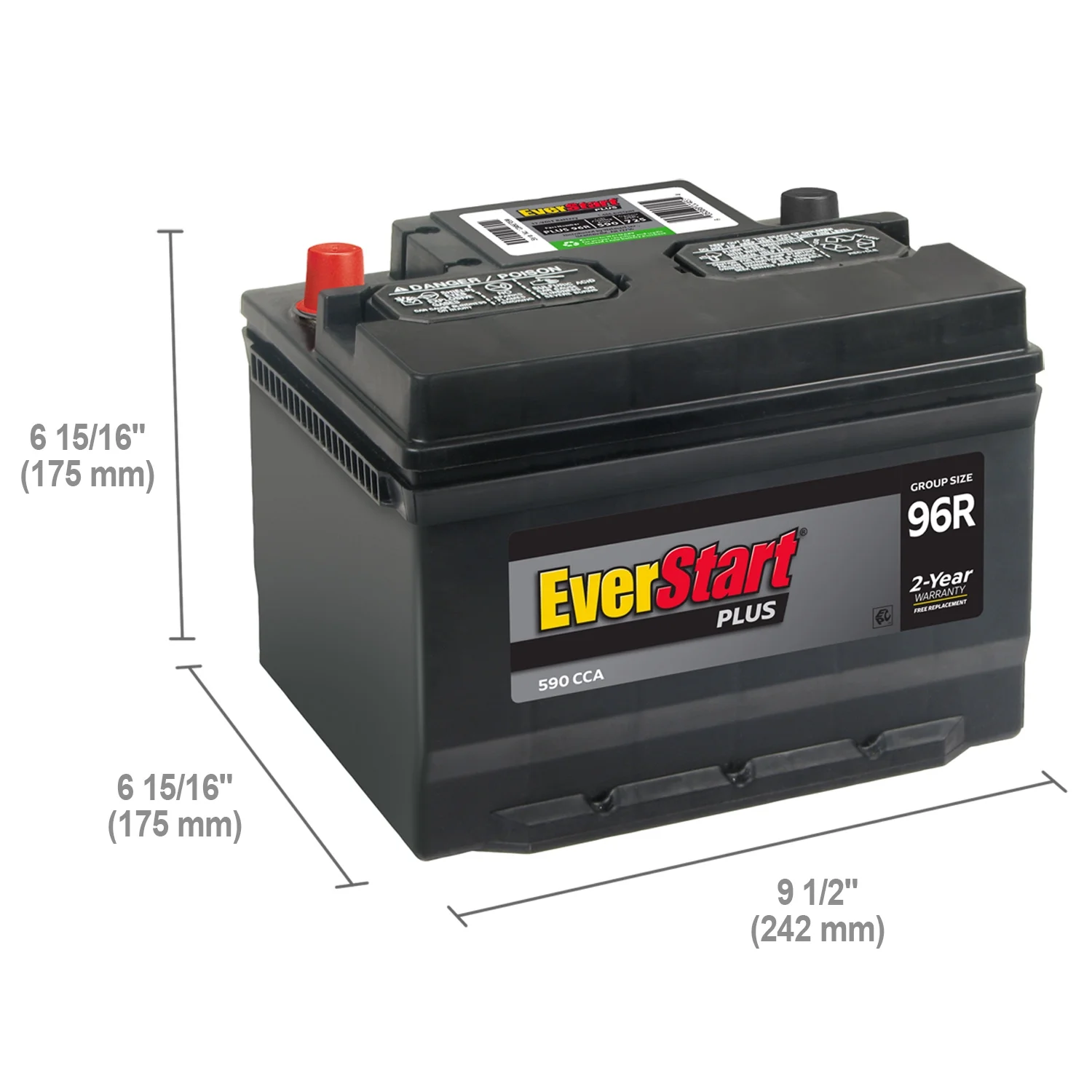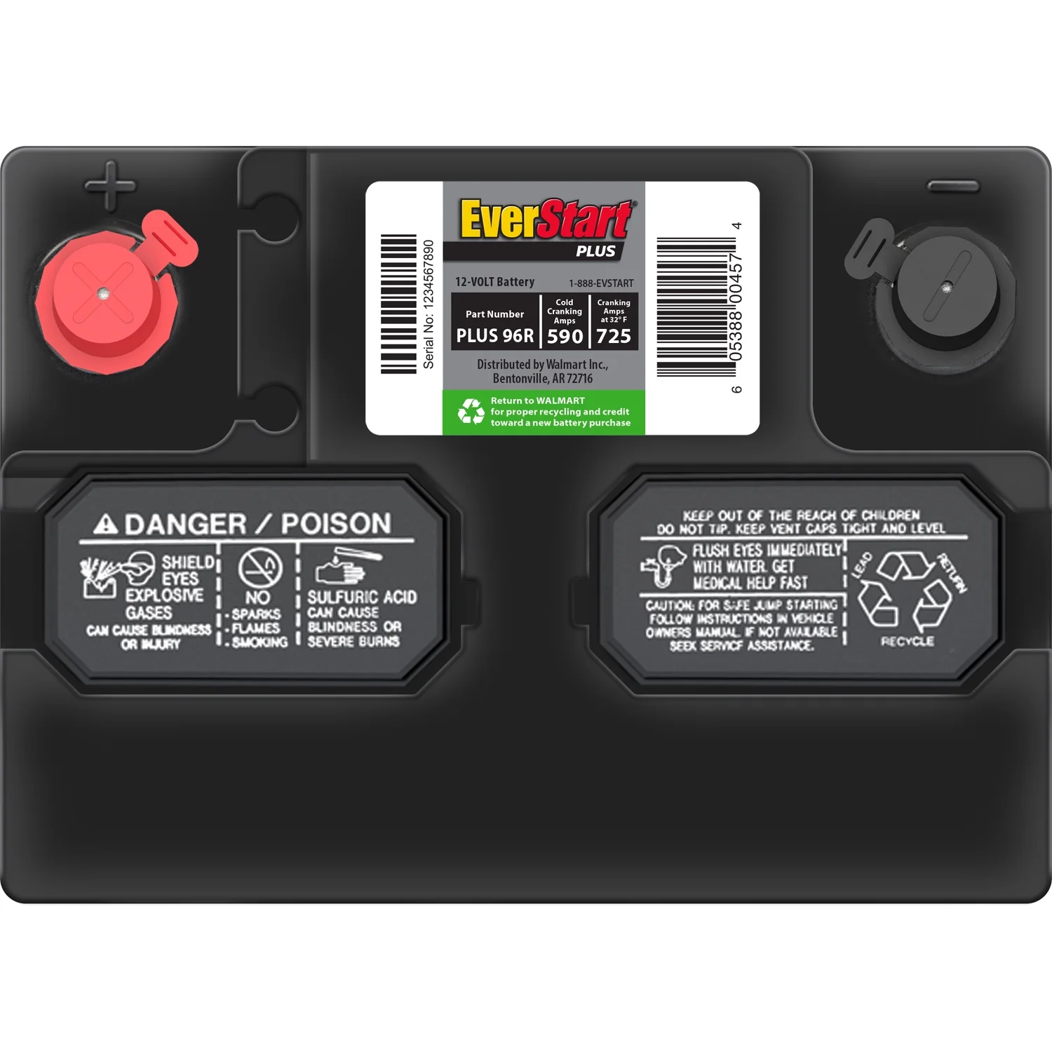 Get your car started and running again with the installation of the EverStart Plus Automotive Battery, Group Size Plus 96R. Offering reliable starting power and a two year warranty this battery is a great economical choice. Compatible with a range of makes, models and years, it has conveniently located top posts for easily connecting positive and negative terminals. This 12 volt lead acid automotive battery delivers 600 cold cranking amps with 90 minutes of reserve capacity for reliable starts in all weather. This battery is maintenance free and can be conveniently installed and tested at a local Walmart Auto Care Center.