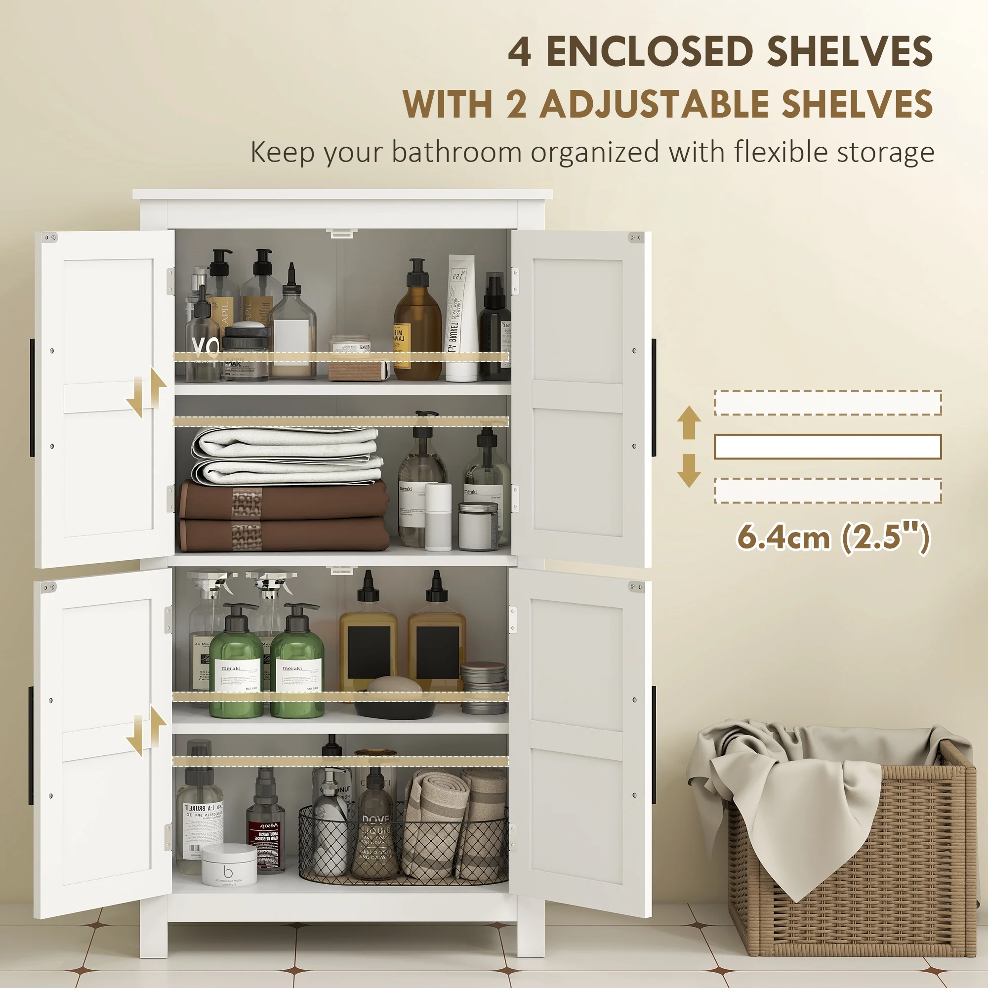 - Three-level adjustable shelf accommodates various item sizes