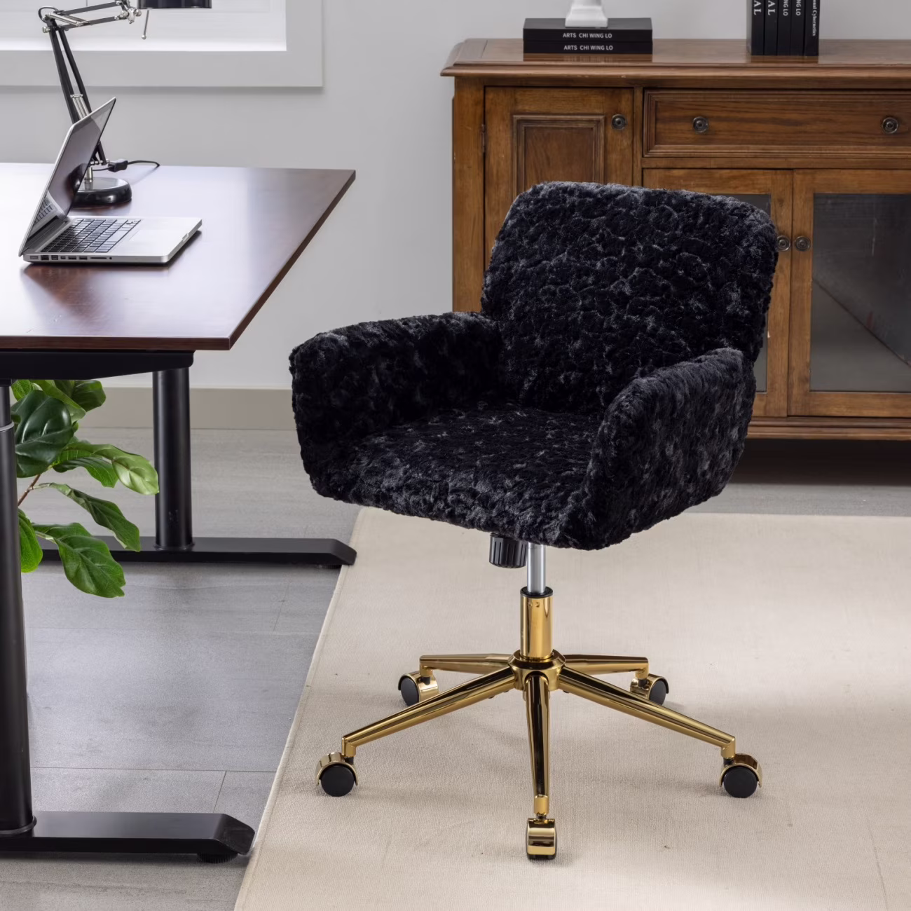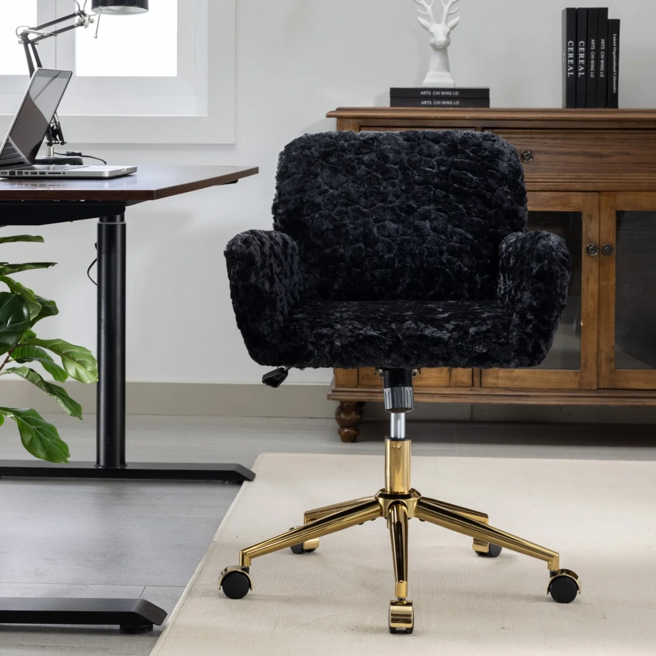 Key highlights make it stand out: Artificial rabbit hair and larger seat size deliver [Spacious Plush Comfort]; the 320mm larger golden metal base ensures [Stable Wide-Base Support]; the reclining chassis offers [Relaxing Reclining Function] for breaks; customization service (contact seller for details) provides [Customizable Design Option]; and its easy assembly/storage fits small study or vanity spaces. Whether for focused study, home office work, or daily vanity use, it��s a functional, stylish, and comfortable seating solution.