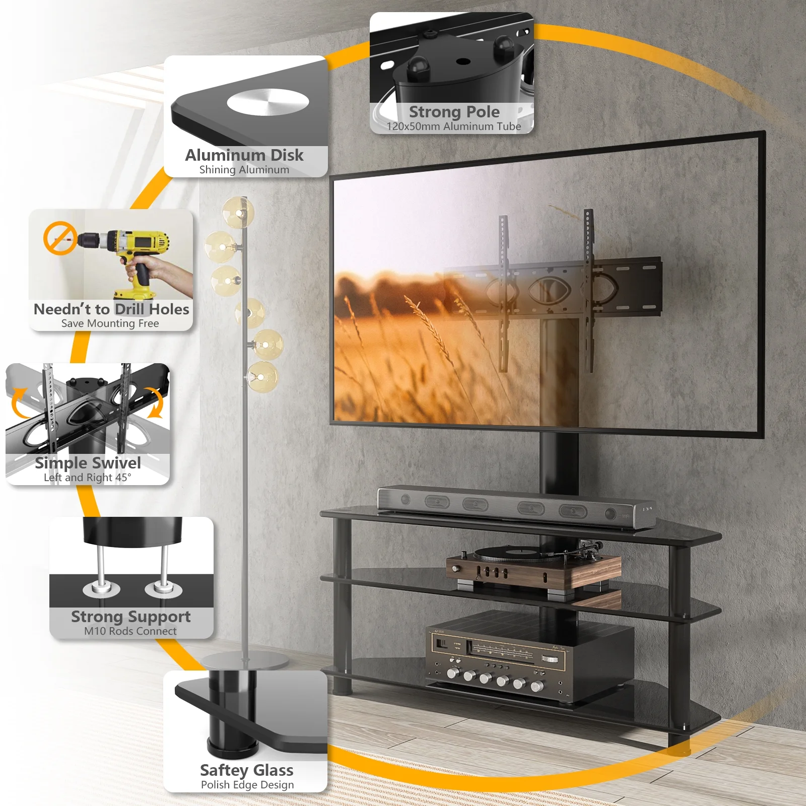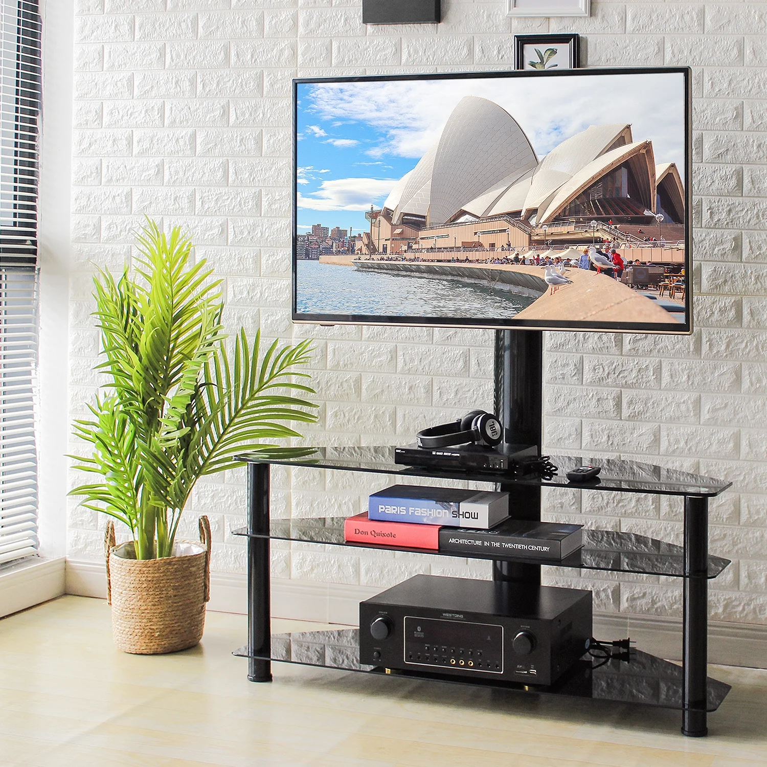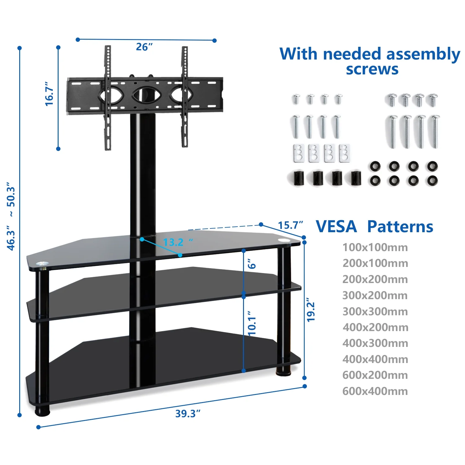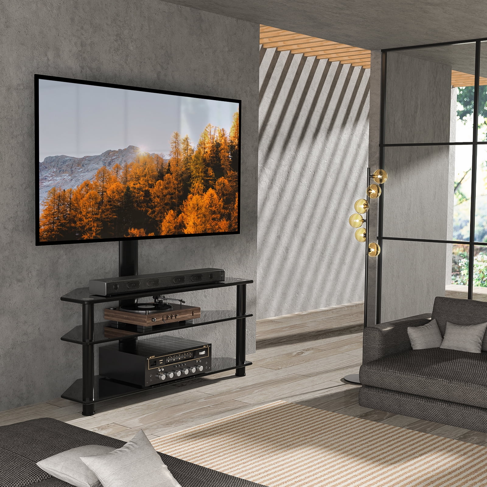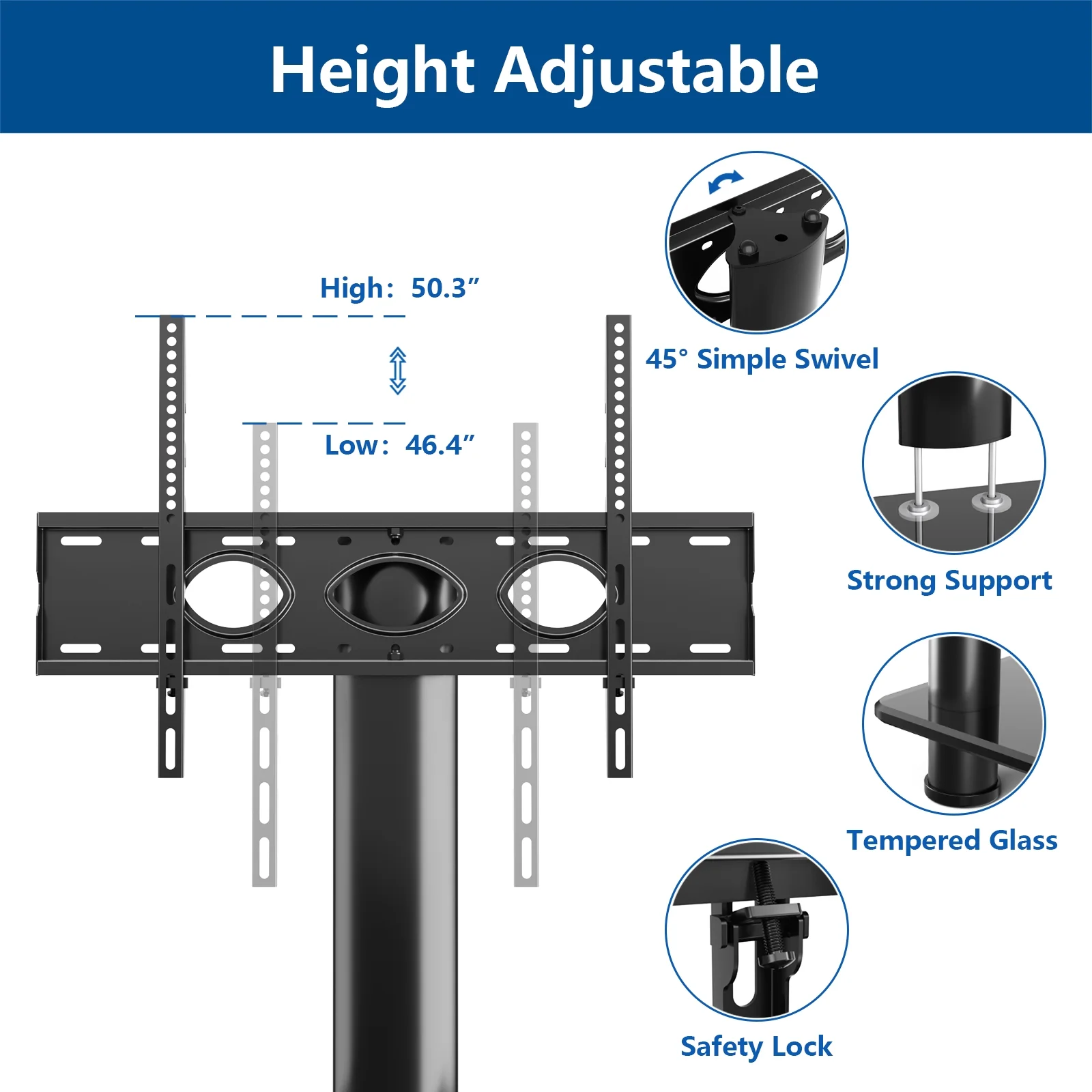 Modern black glass TV stand with mount for 32 40 43 50 55 60 65 inch flat panel curved screen TVs. Versatile TV stand furniture bracket easily swivel 45 degrees left or right sturdily keep it to display it on the floor. TV entertainment center fit for Samsung LG Electronics Sony Sharp Panasonic Philips Vizomax Cello Bush Blaupunkt JVC Hitachi Hisense Goodman's Finlux Toshiba LCD LED OLED QLED Plasma TVs. The black tv mount stand has 3 height adjustable options to meet different TV sizes, height adjustment from 46.3" to 50.3". More, it offers ample space to store media components, gaming systems, or any other media accessories. Whether you choose to use it in the bedroom room, living room, office, game room, kid's room or any other entertainment center, it is always a pretty nice choice!