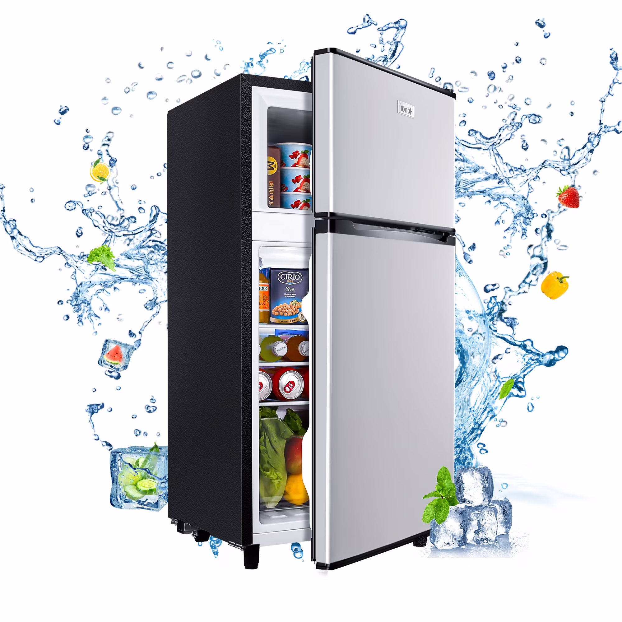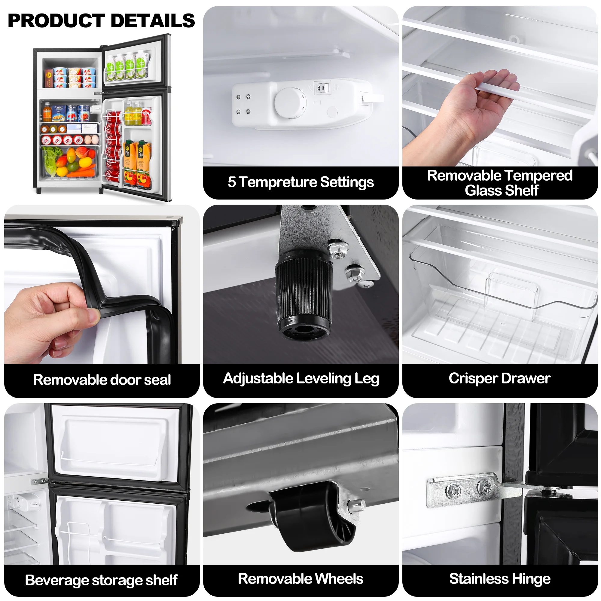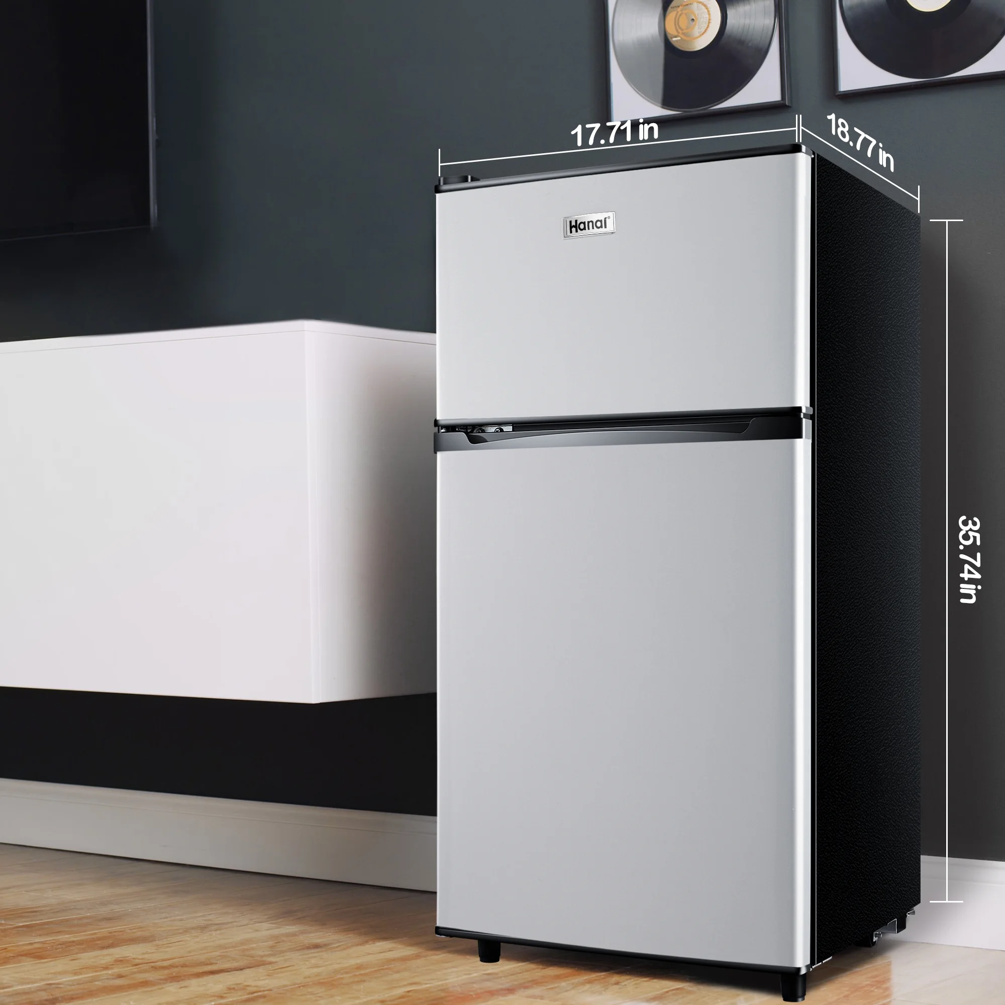 WANAI 3.5 Cu ft Two Door Mini Fridge, EstarEnjoy the convenience of having your favorite chilled food, drinks, or snacks whenever you want with the WANAI 3.5 Cu ft Two Door Mini Fridge in Silvery. The WANAI 3.5 Cu ft Two Door mini fridge is the ideal size for the dorm room, game room, exercise room, office, garage, bedroom, or any other living space. This WANAI 3.5 cu ft Two Door mini fridge features a full-width chiller compartment, 2 adjustable leveling legs and a convenient reversible door that allows you to choose to open from the left or right side making the WANAI 3.5 Cu ft Two Door mini fridge suitable for any layout.