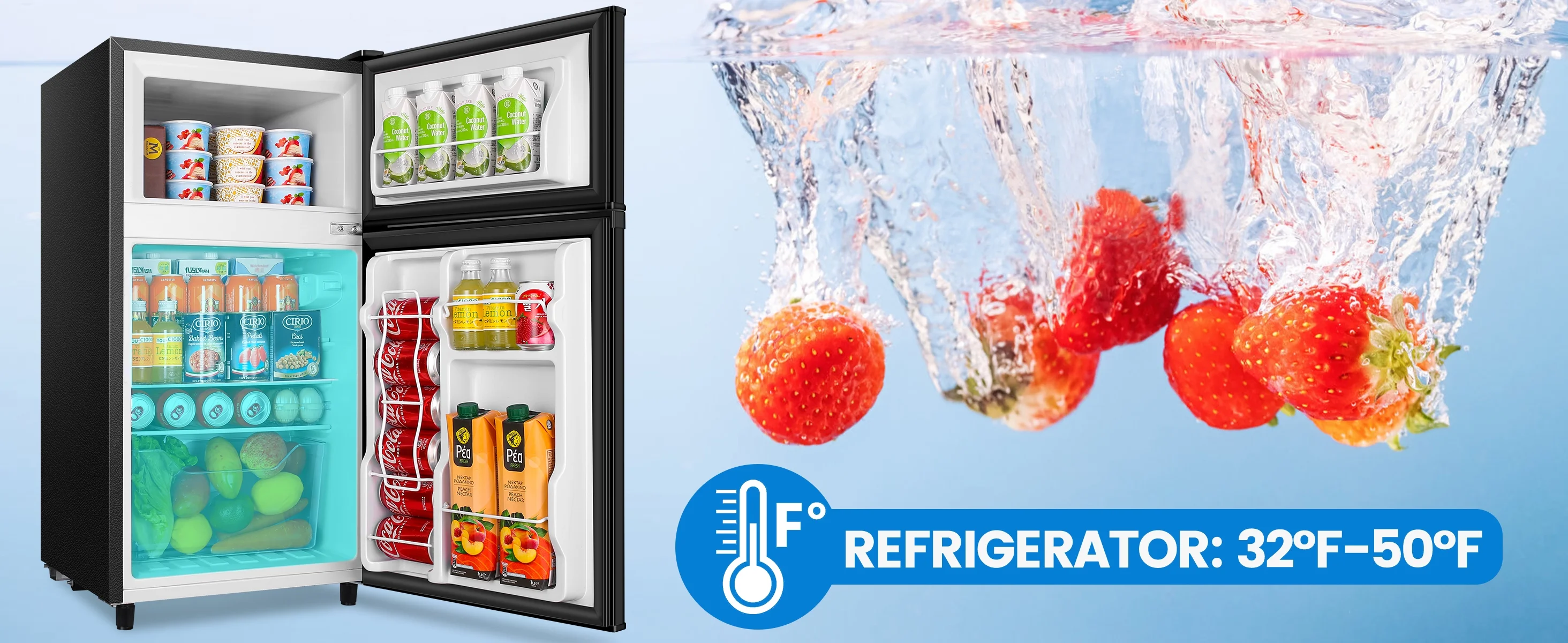 - 7-LEVEL TEMPERATURE ADJUSTMENT Mini refrigerator with freezer adopts advanced 3D refrigeration technology and supports 7 temperature settings. From0.4��F to 50��F,there are 5 variable temperature settings can be manually switched between as per your needs The detailed temperature setting allows you to adjust the temperature of small fridge for bedroom according to your different needs. Small refrigerators for bedroom is also equipped with a powerful compressor, and it does not cause too much noise while operating efficiently, so you don't have to worry about noise at all.