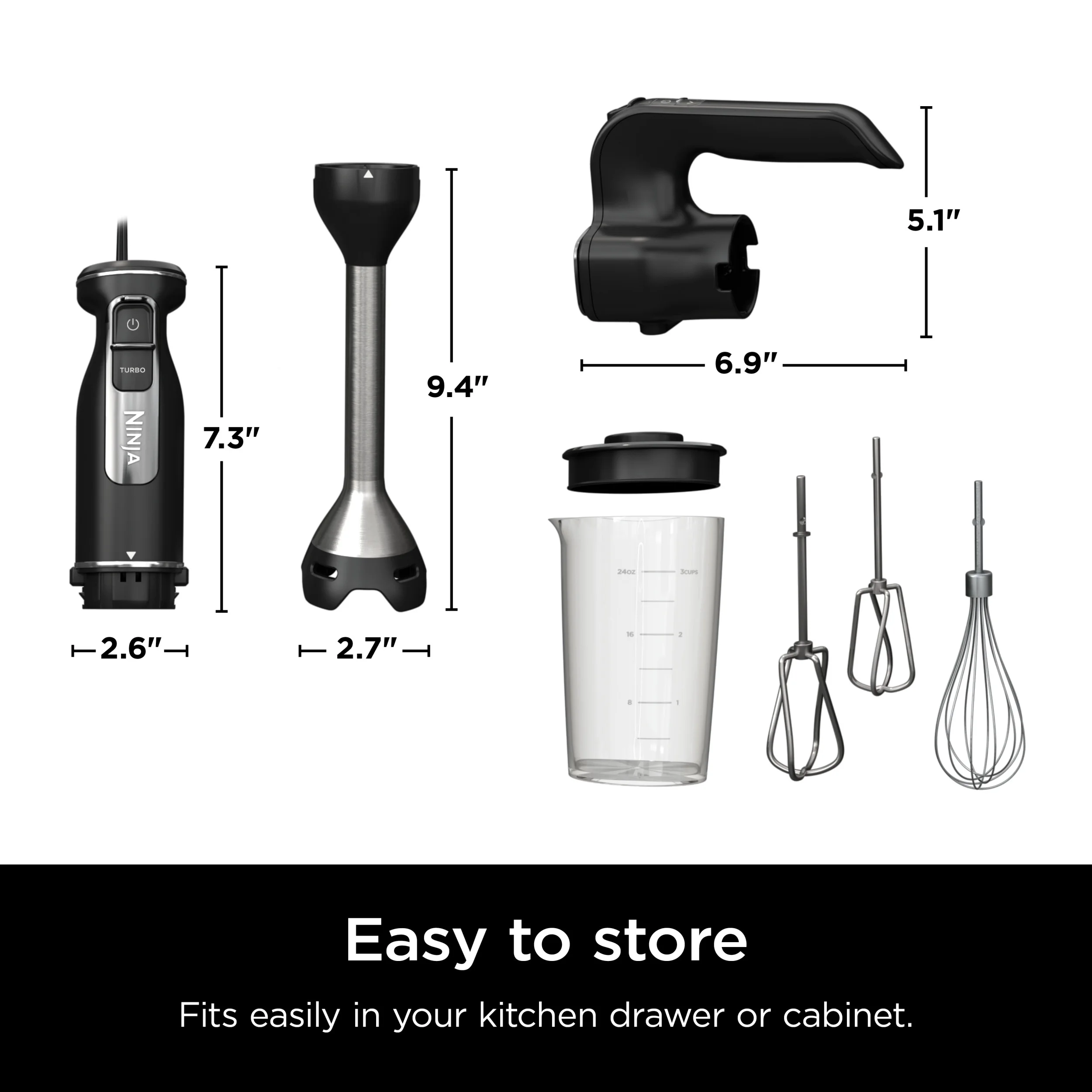 - 9�� Stainless Steel Immersion Blending Arm: Features a built-in pan guard, allowing you to blend directly in deep pots or pans without scratching them