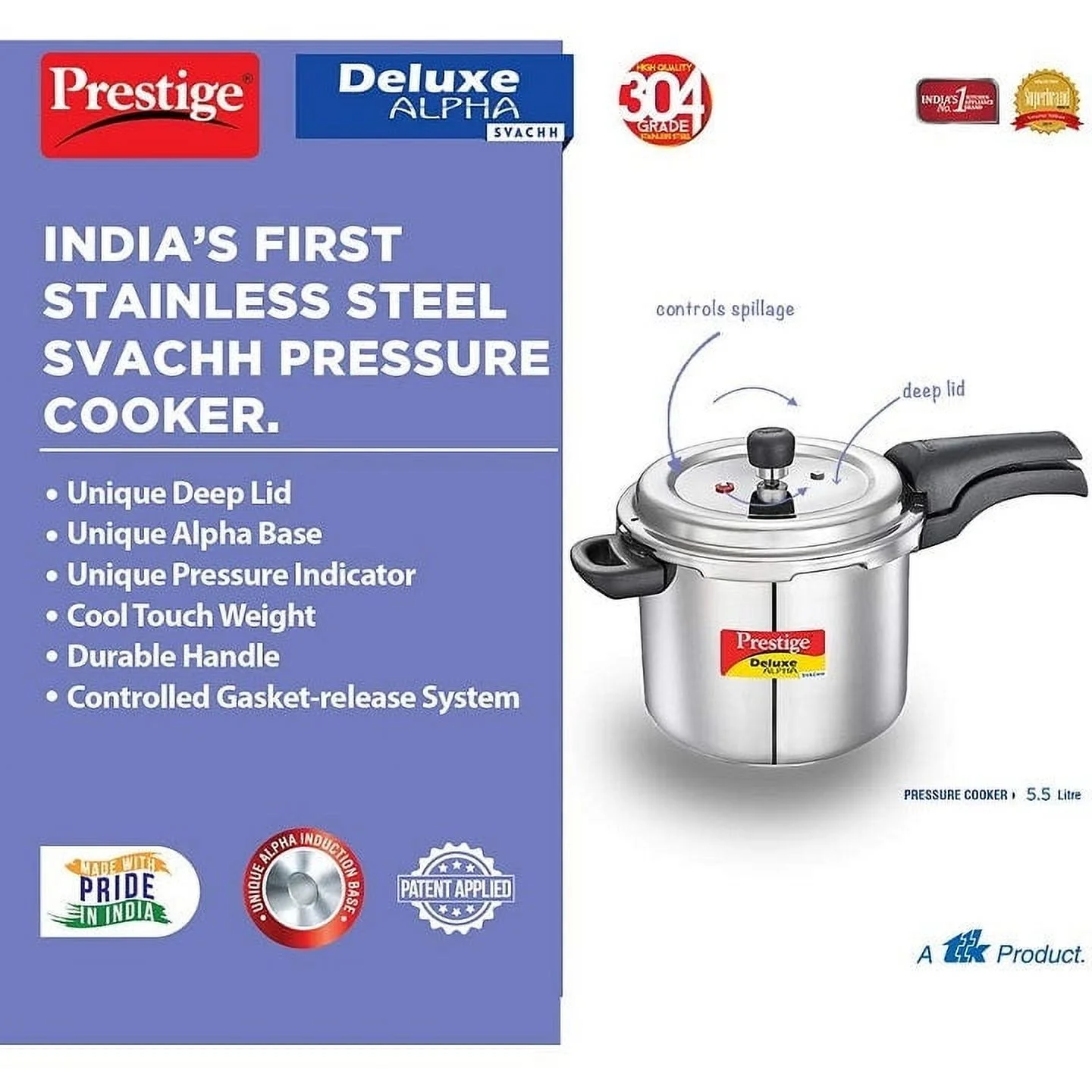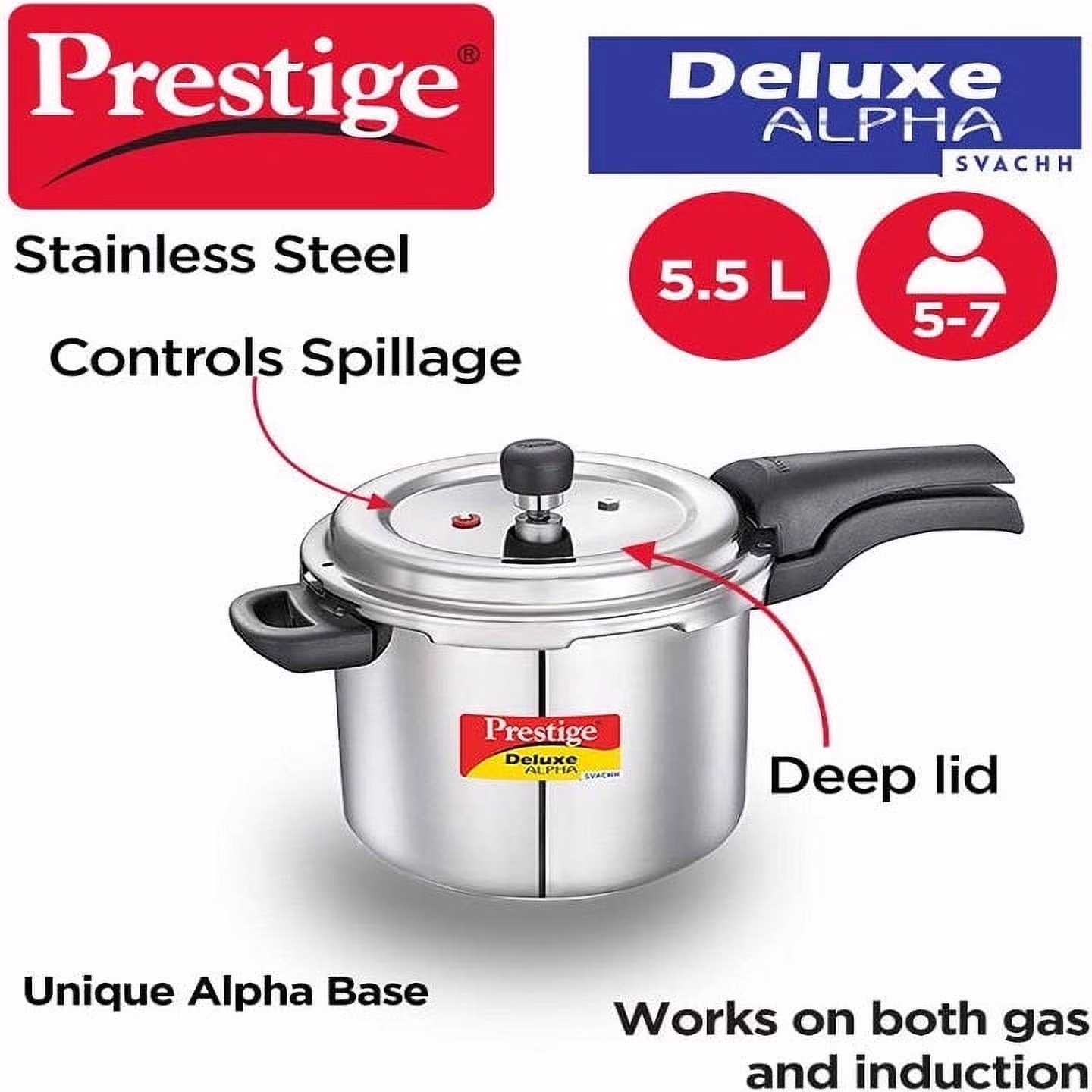 Constructed from high-quality stainless steel, the Prestige Deluxe Alpha Pressure Cooker ensures even heat distribution, reducing cooking time and saving energy. Its alpha base induction bottom is designed to work well on both gas stoves and induction cooktops, providing versatility in your kitchen. The material is also resistant to corrosion and easy to clean, maintaining its shine and functionality over time.