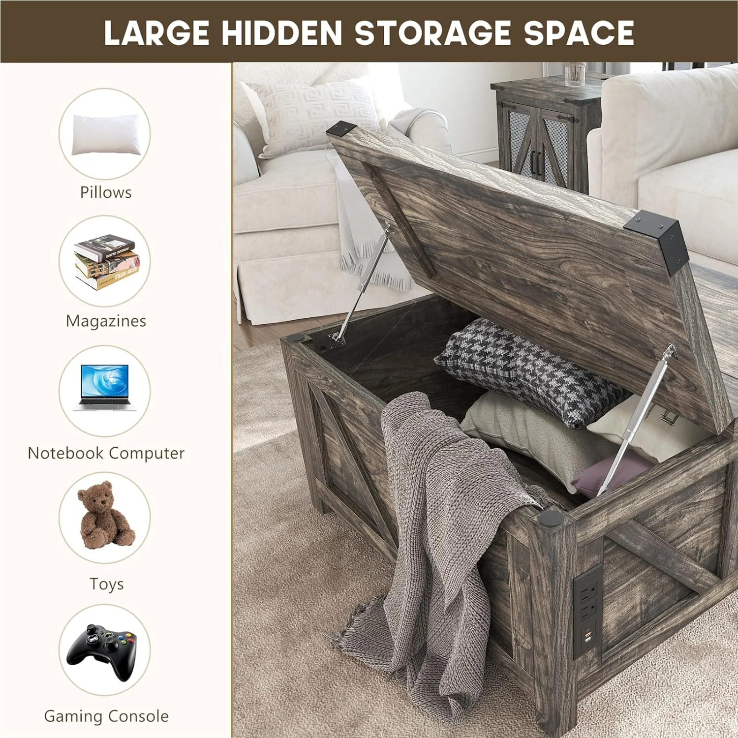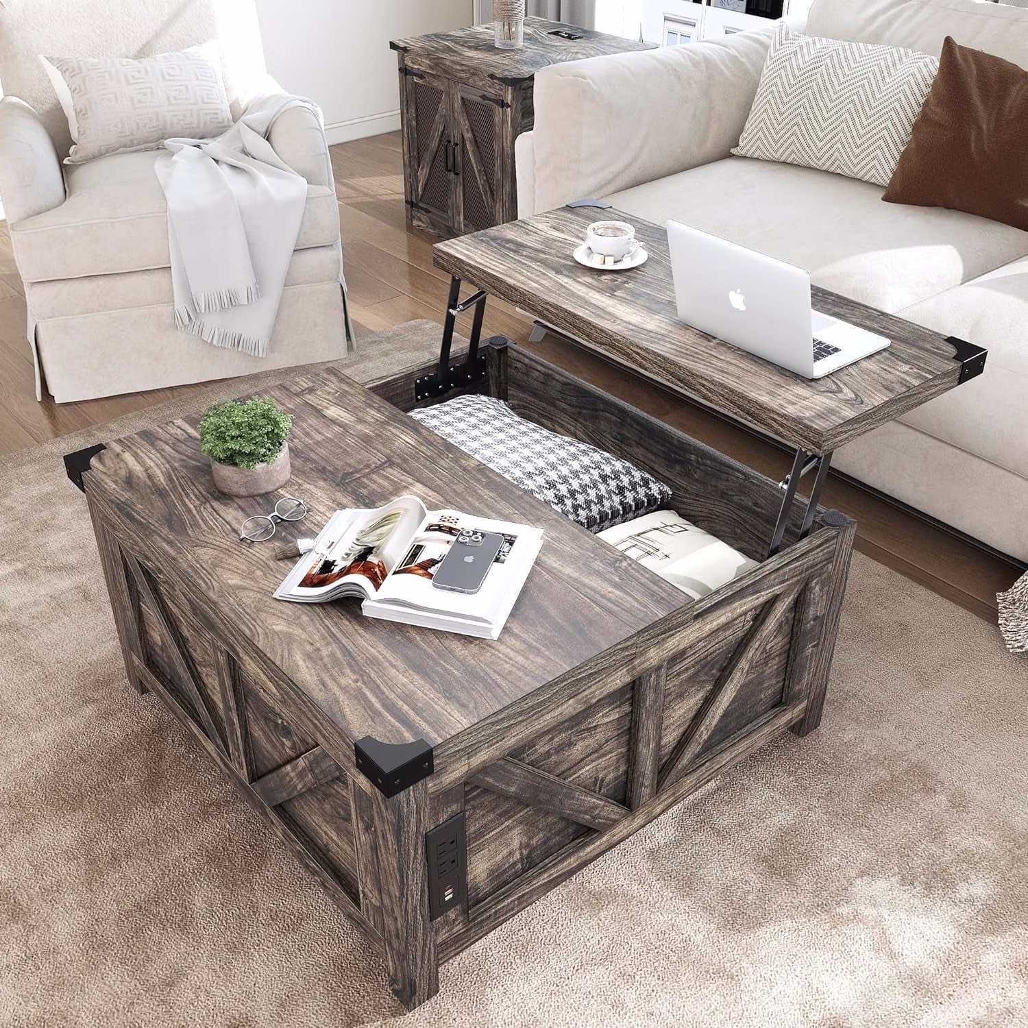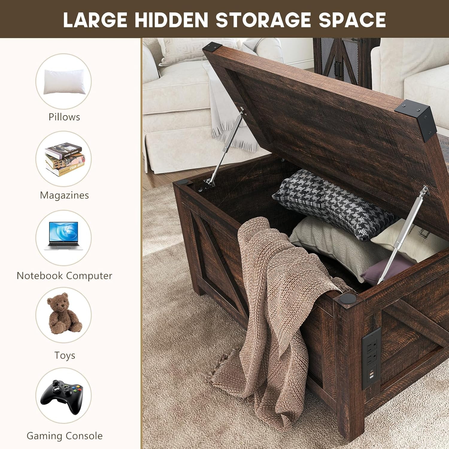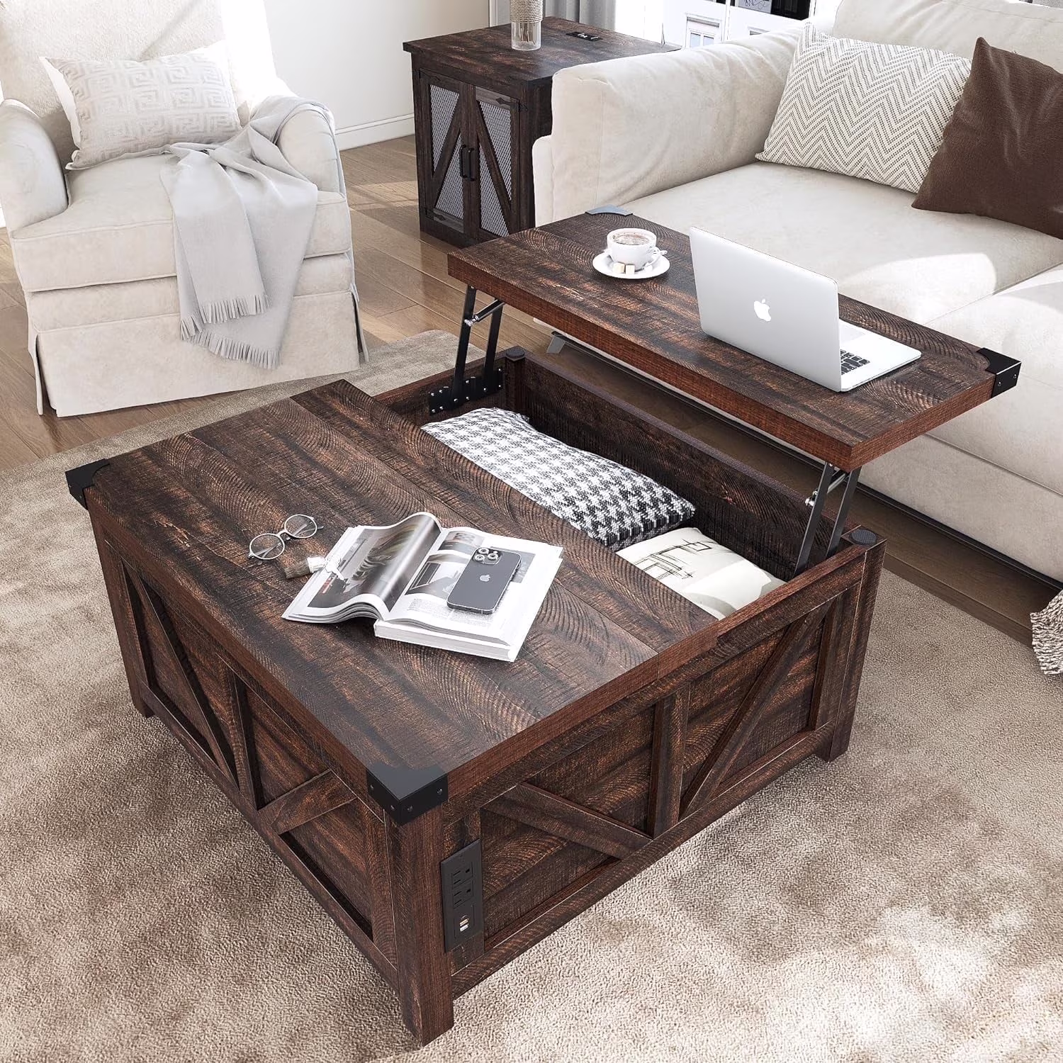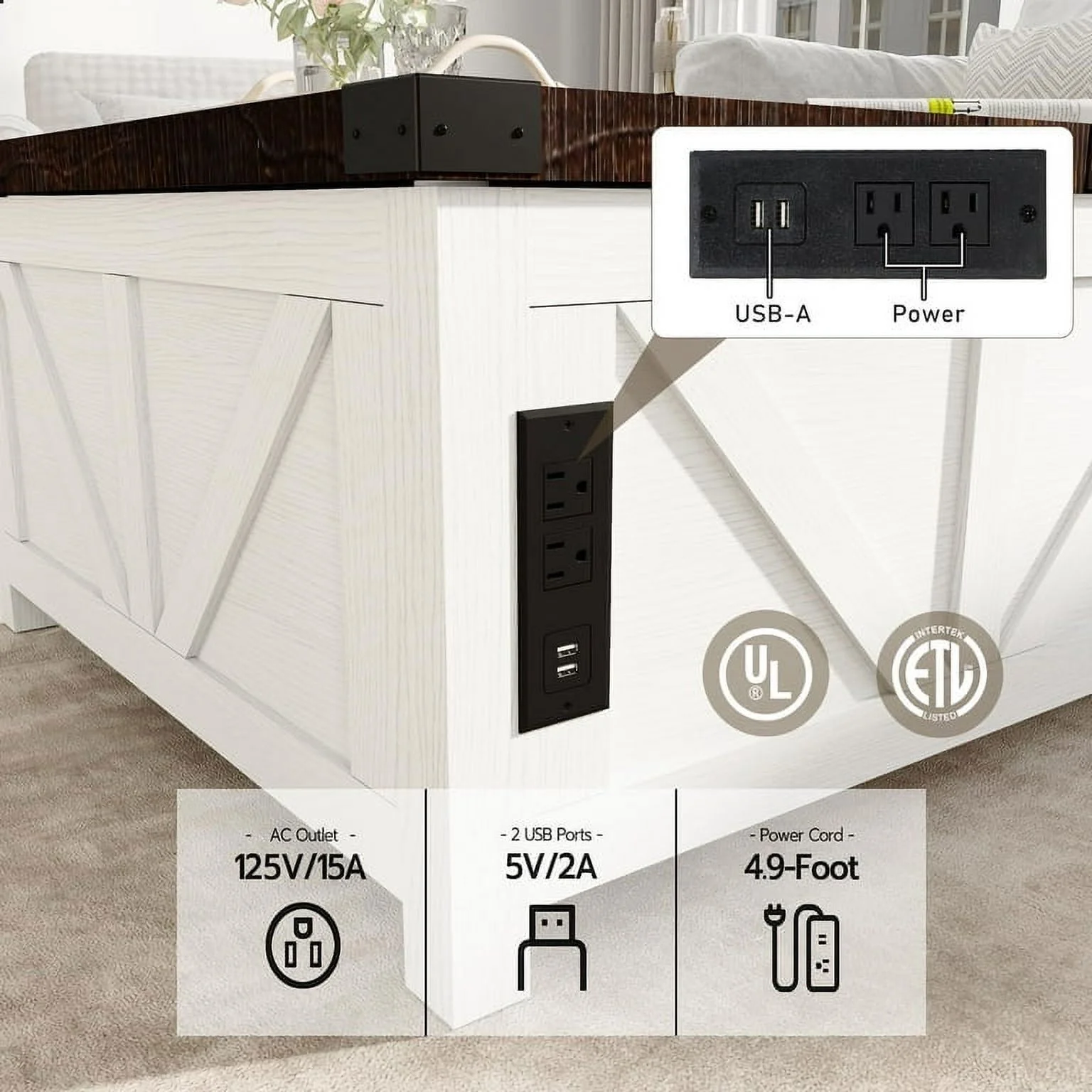 Convenient Design: The white wooden coffee table experiences smooth and safe lifting with a high-quality lifting mechanism featuring gas struts. It can be lifted to a height of 60cm from the ground for convenient office work. There are 2 USB ports and 2 output ports on the side for phone charging or using the notebook.