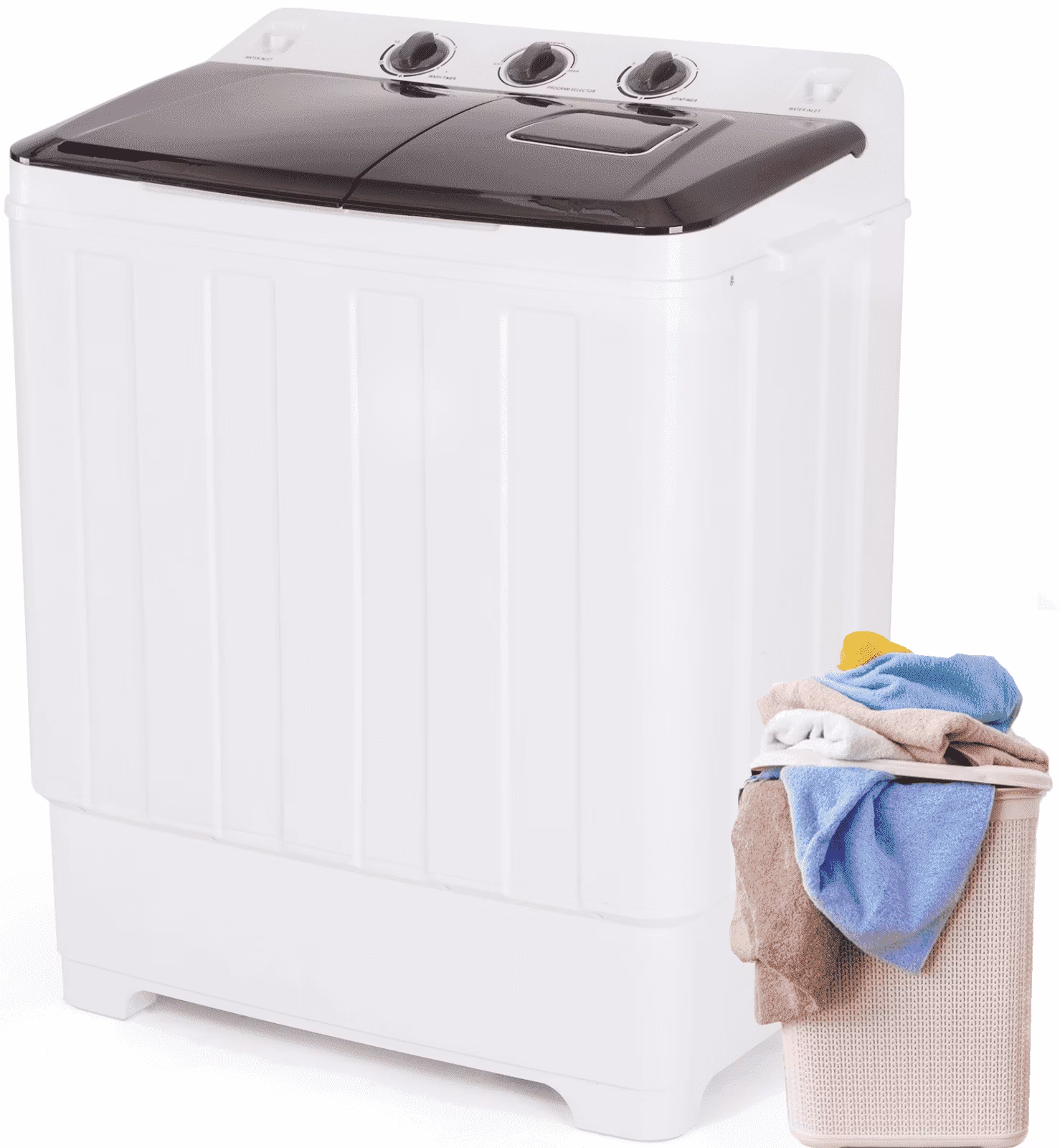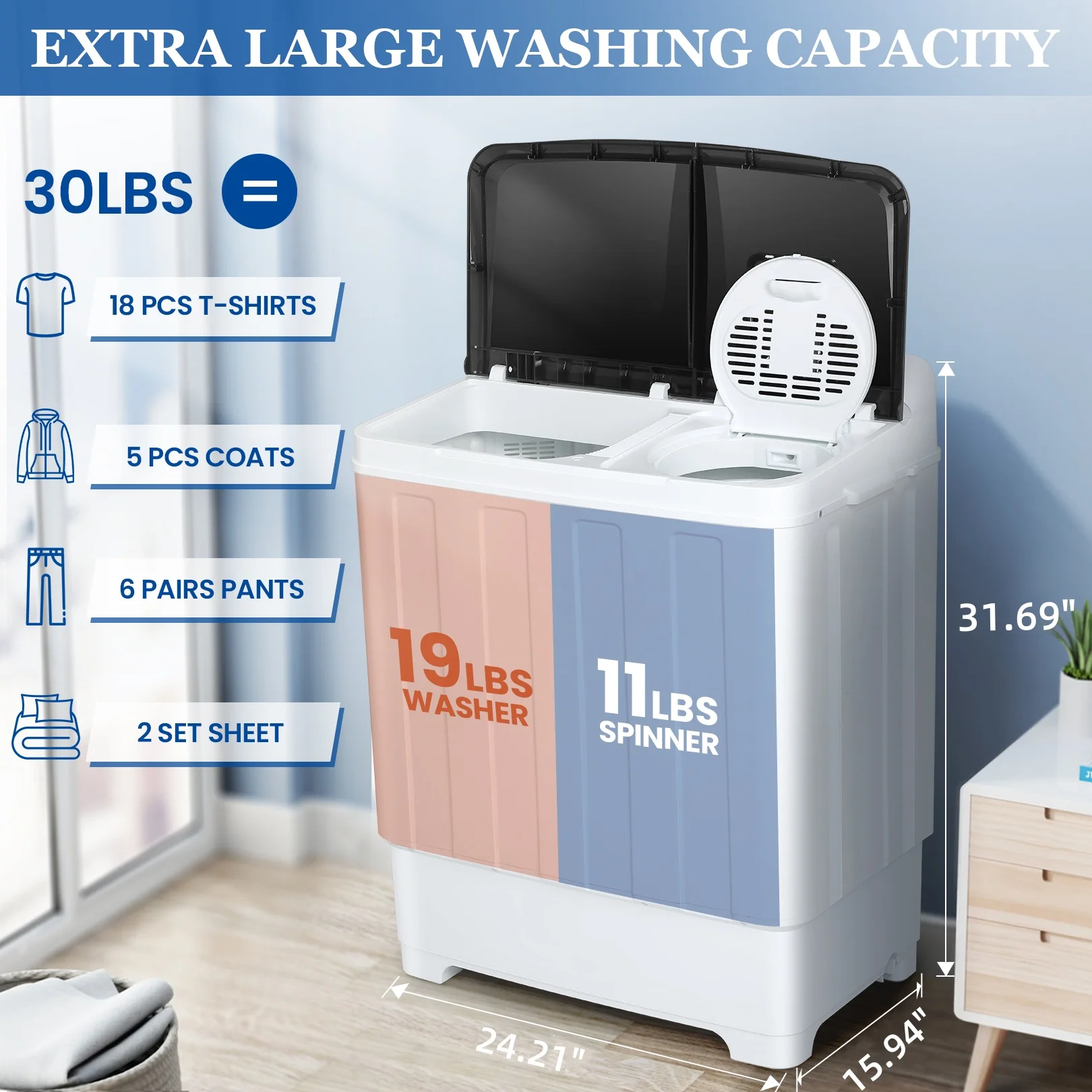 ??HUMANIZED DESIGN: This double drum washing machine comes with a transparent lid so you can check the progress of the wash and spin at any time. The washer's built-in lint trap prevents clothing lint from clogging the hose while keeping the washing environment clean.